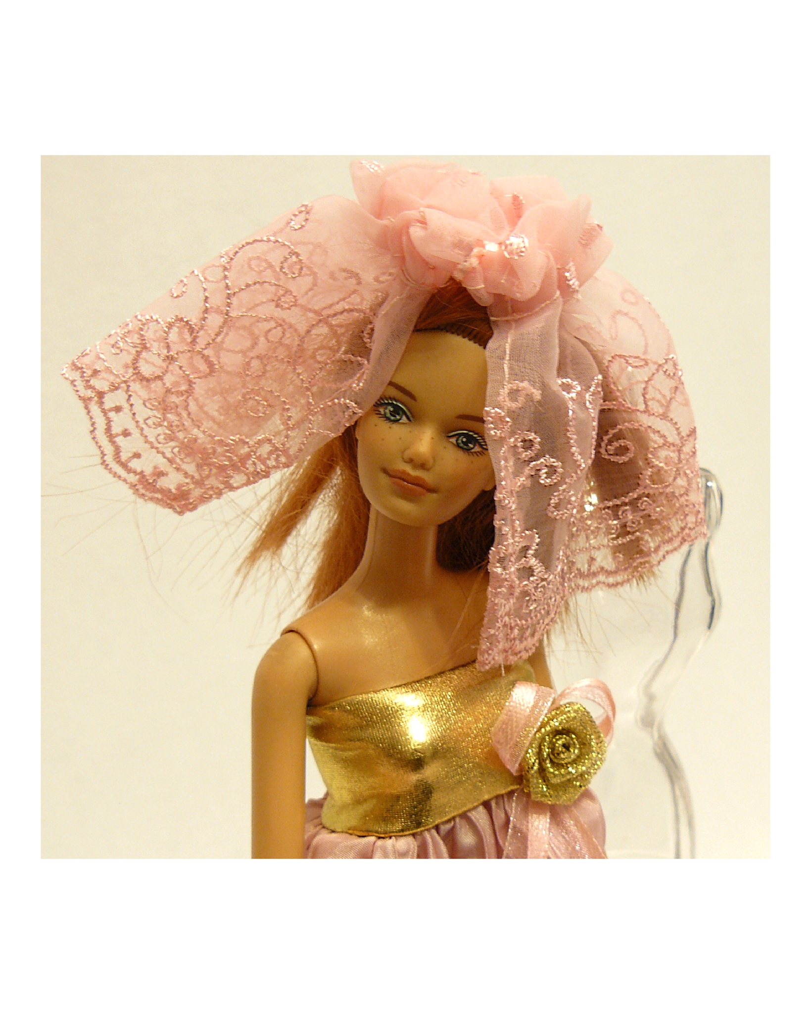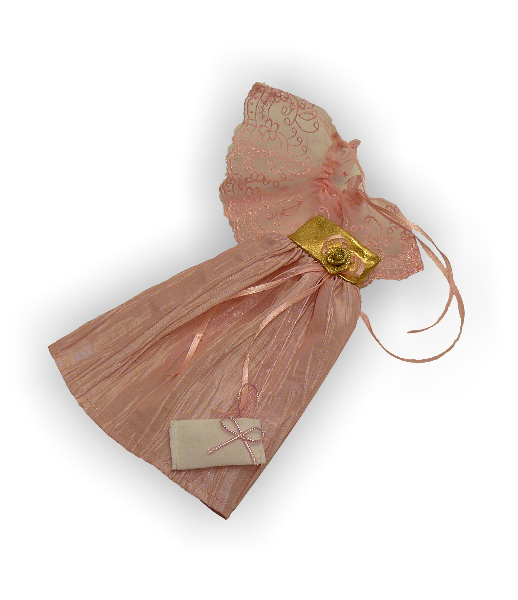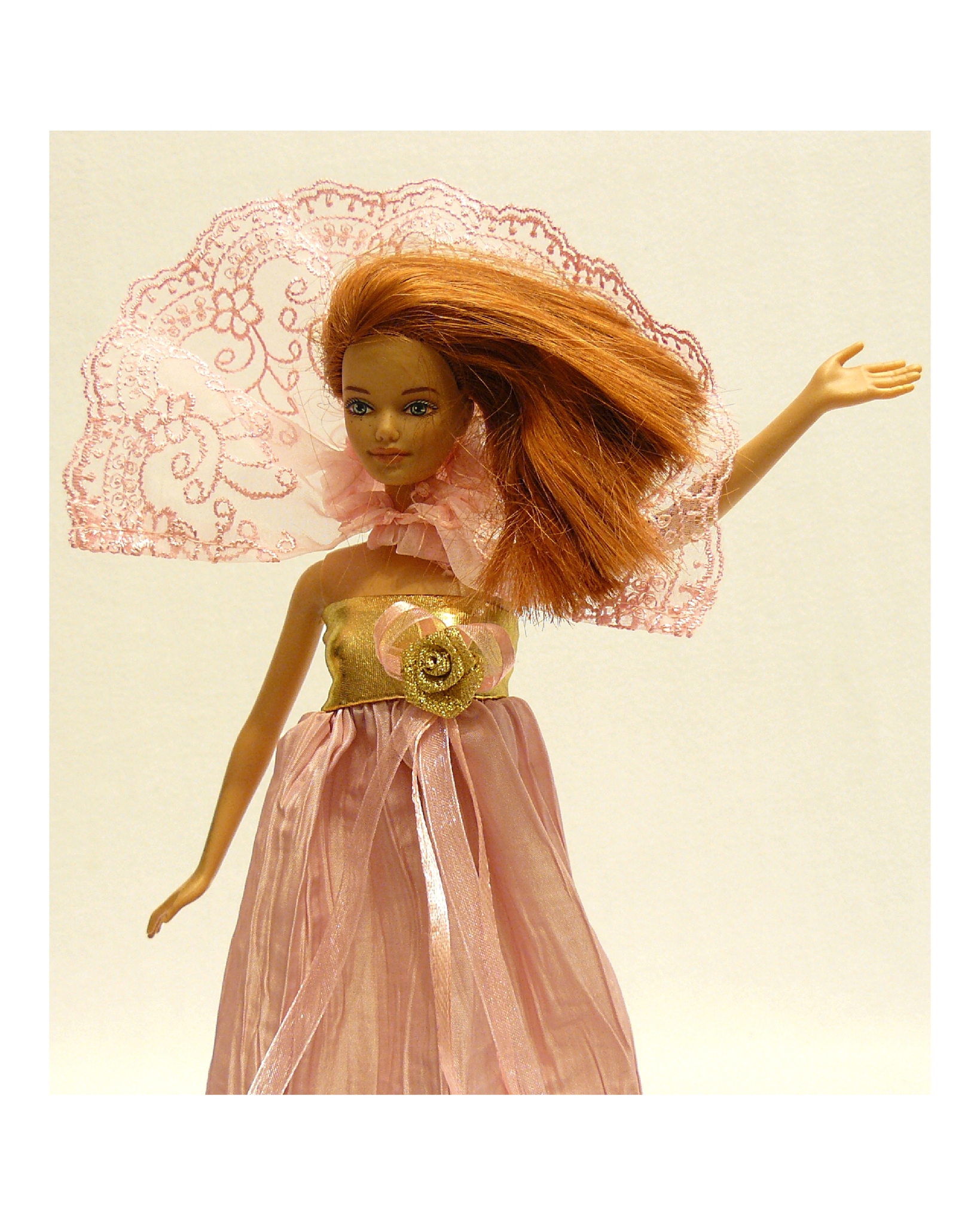 Платье оригинального покроя с завышенной талией изготовлено из стрйчевой ткани и жатой шелковой парчи. Кокетка платья усилена резинкой для более плотной посадки. Украшением служит роза из парчи и композиция из шелклвых и капроновых лент. Накидка из широкого шитья на капроне. Утяжка из шелковой ленты. Накидку можно использовать в нескольких вариантах: как фату, как накидку на плечи, как дополнительный валан к юбке. Маленькая театральная сумочка из белой замши дополняет любой из этих комплектов.