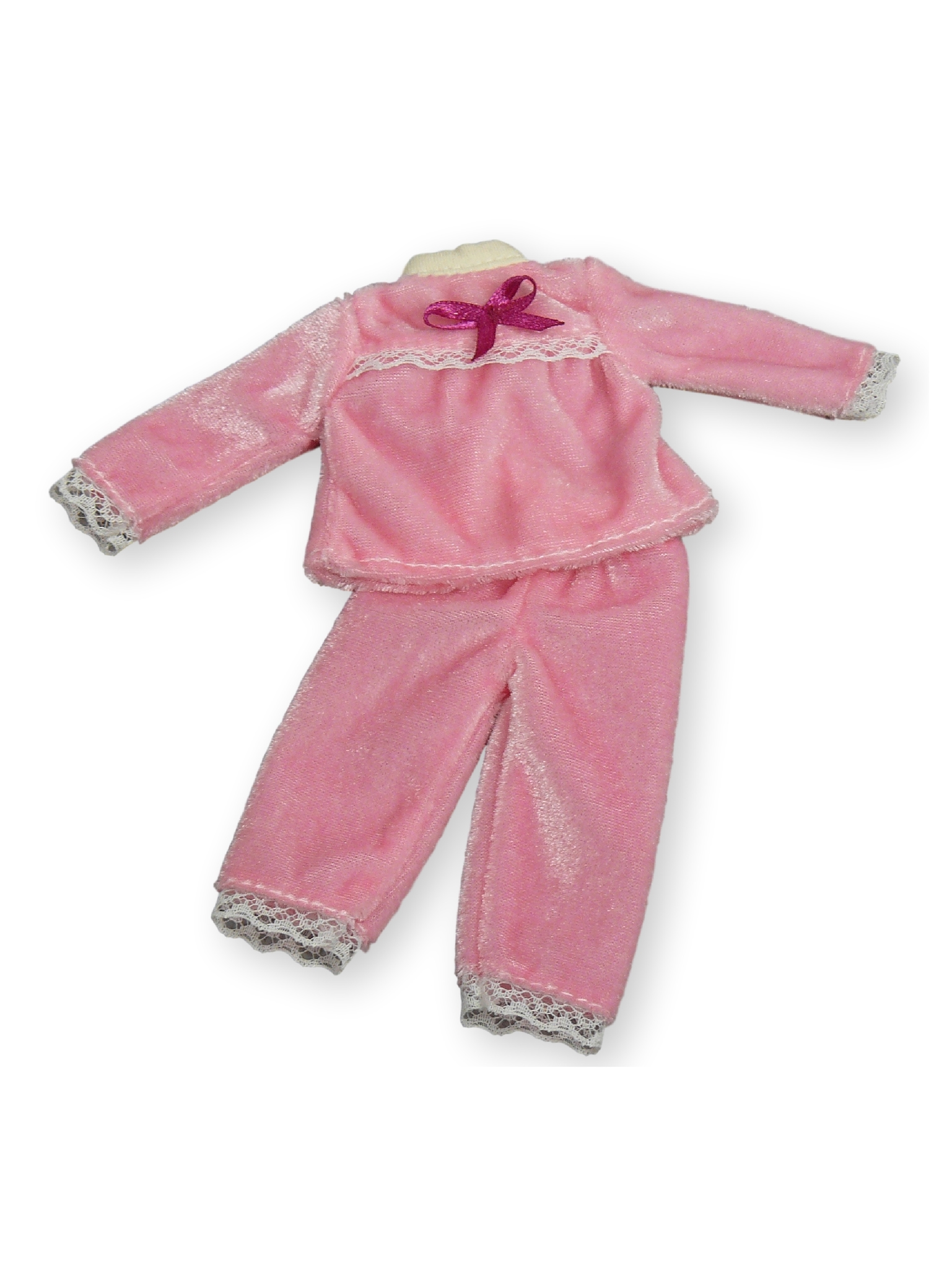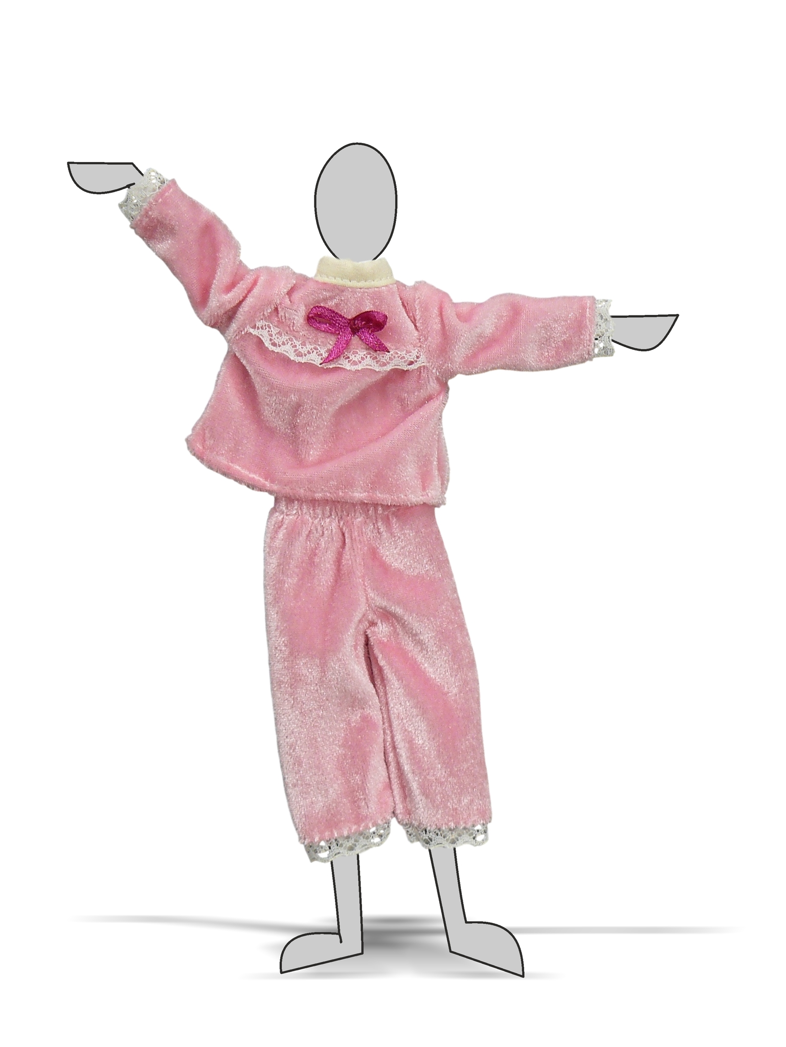 Комплект изготовлен из микровелюра. Укороченные пижамные штаны на резинке по низу украшены кружевом. Кофта с кружевной вставкой спереди дополнена милым украшением из ленты. Застежка кофты сзади на липучку.
