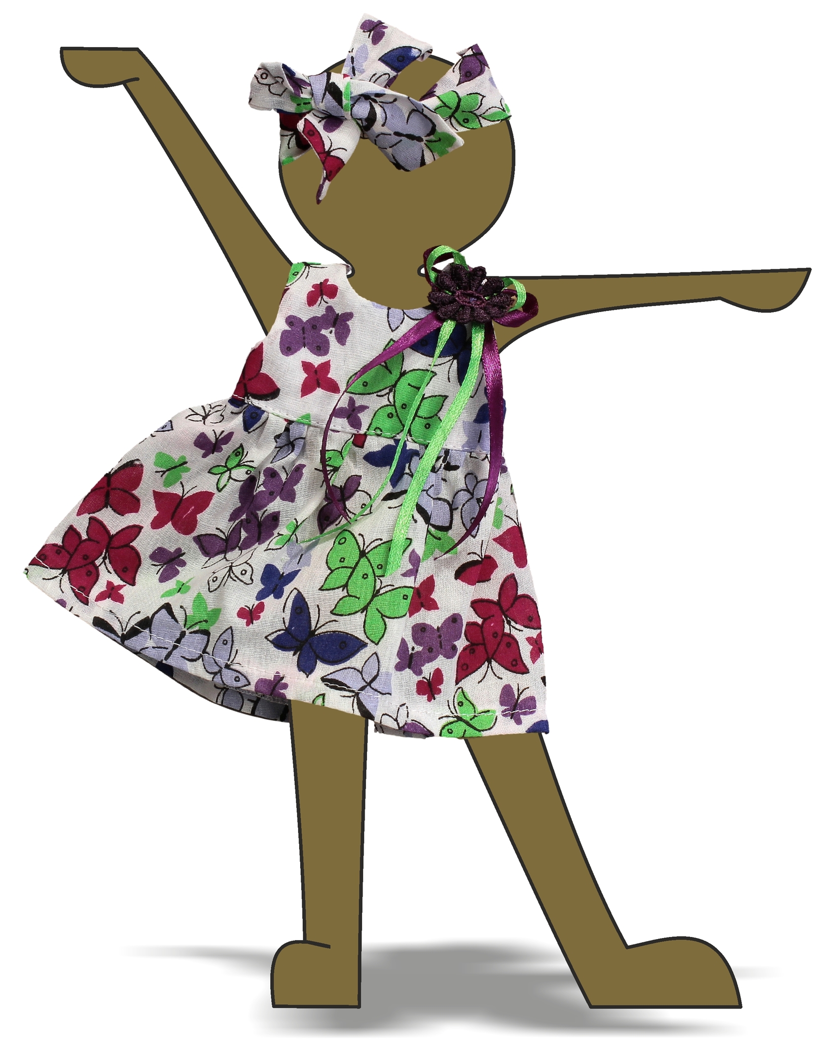 Летнее платье без рукавов изготовлено из хлопчато-бумажной ткани. Кокетка выворотная на подкладке, что обеспечивает аккуратную линию пройм и горловины. Застежка - липучка сзади. Дополнительное украшение - бант из шелковых лент. Полоска на голову - выворотная.