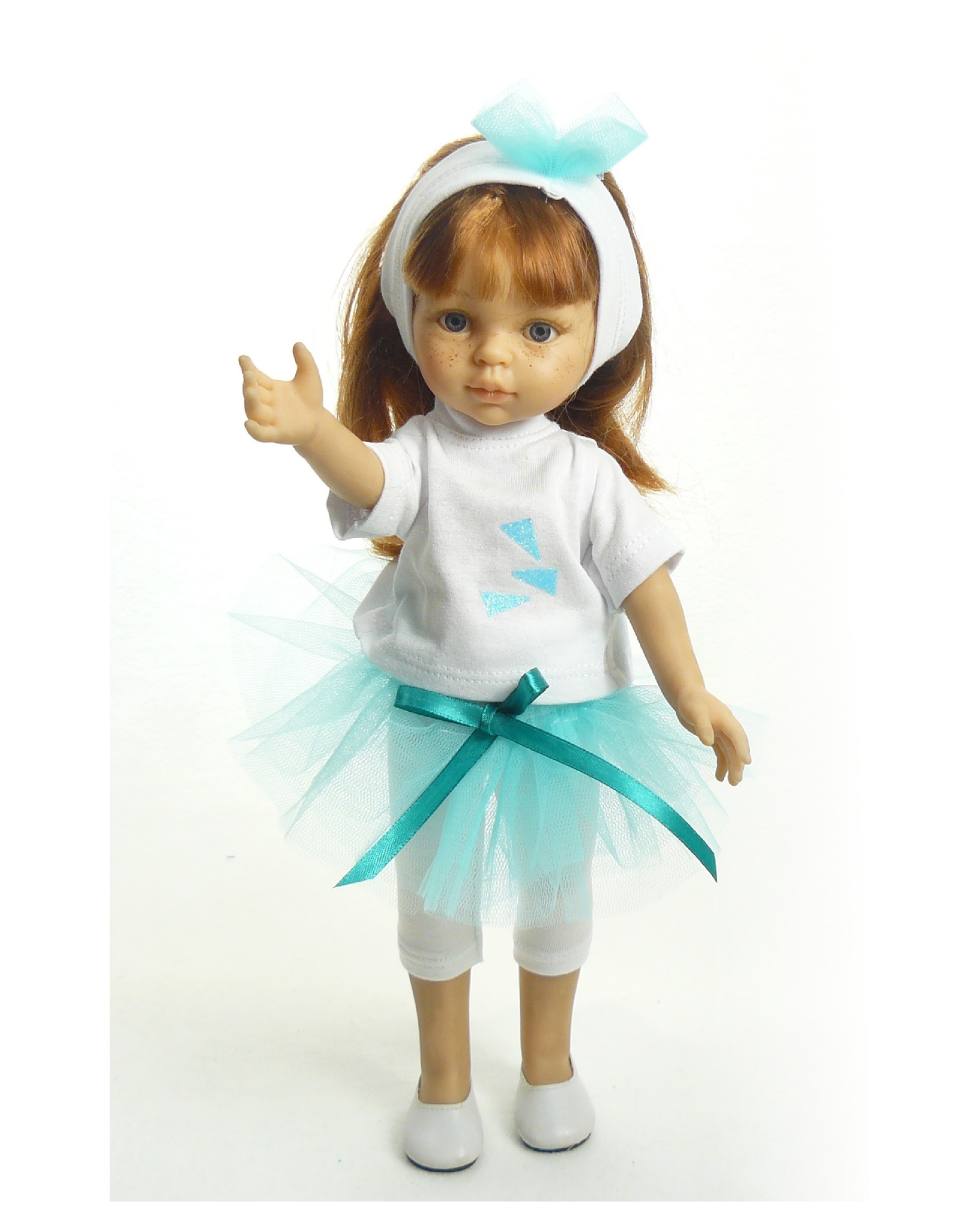 Комплект состоит из четырех предметов: футболка, лосины, юбка и полоска на голову.