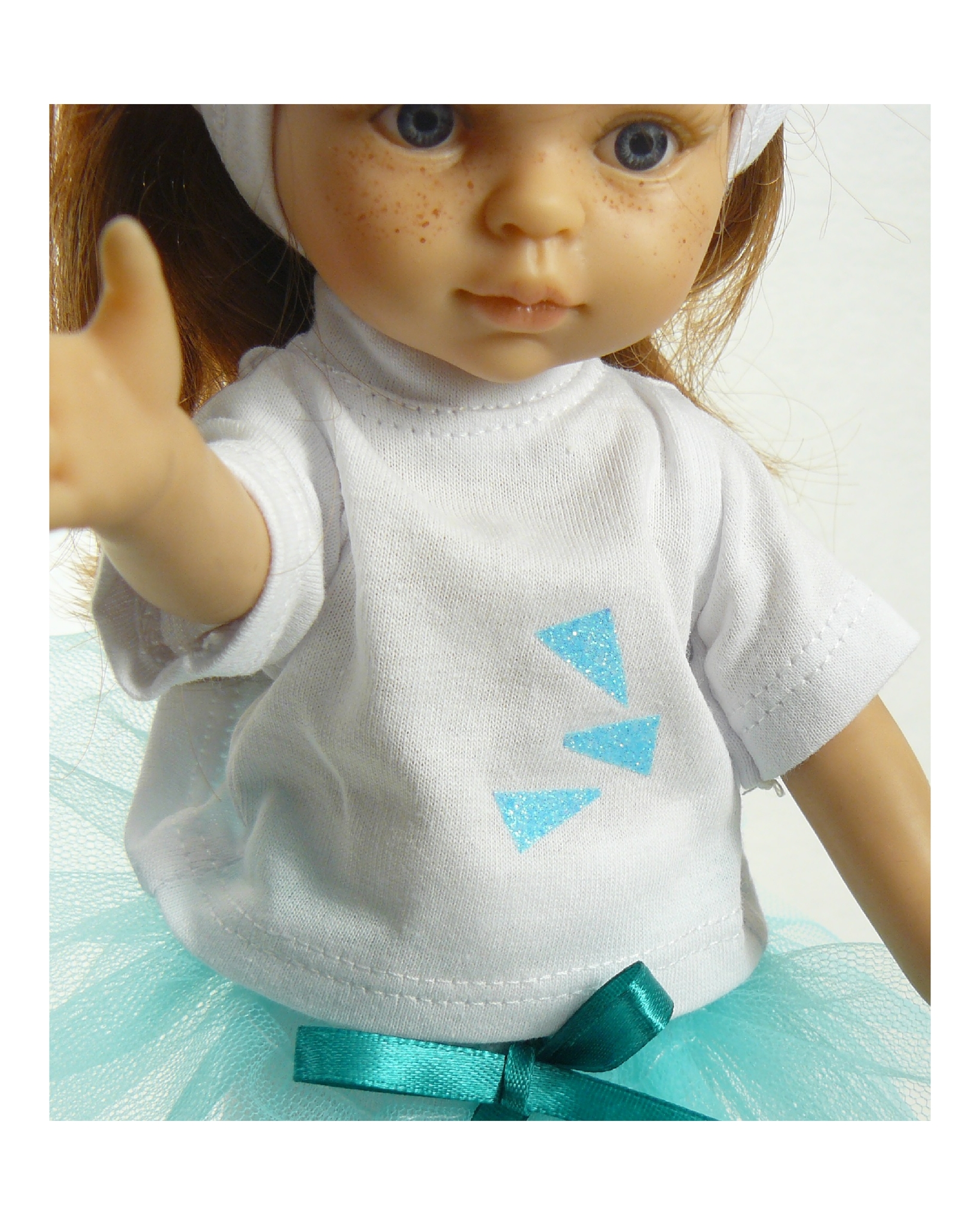 Все изделия, кроме юбки выполнены из белого хлопкового трикотажного полотна. Футболка классического свободного покроя с застежкой сзади на контактную ленту велкро. Украшена футболка термоаппликацией из галографических материалов. Лосины изготовлены из трикотажа с добавлением лайкры, что делает их более эластичными. Юбка из цветной синтетической сетки на широкой резинке. Украшение юбки - атласный бант.