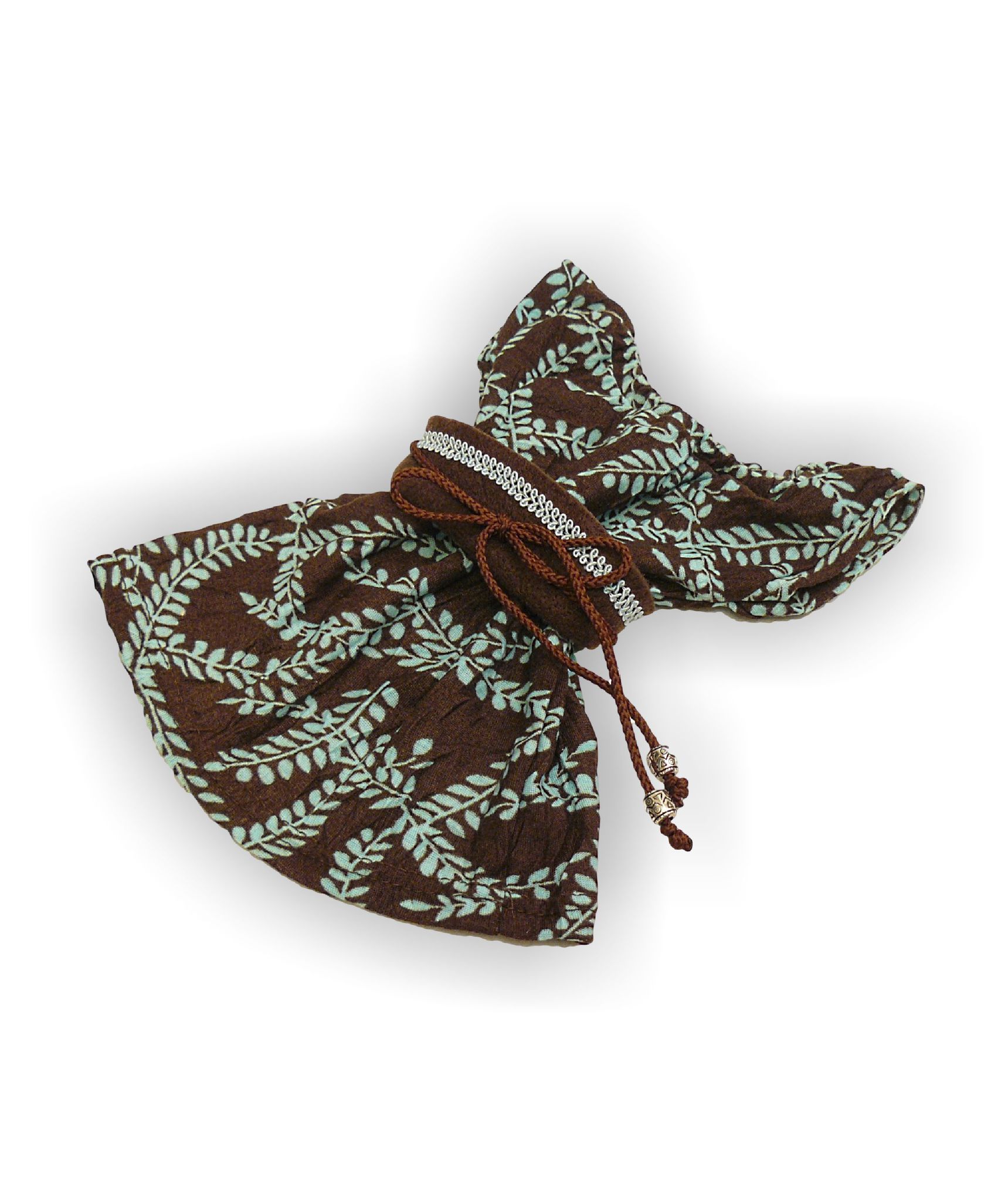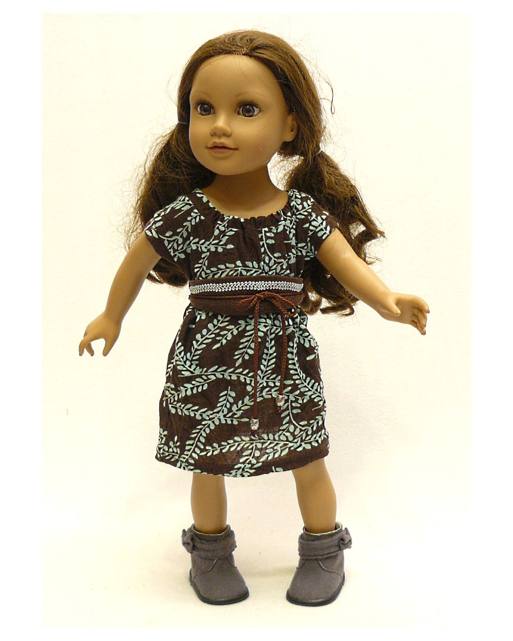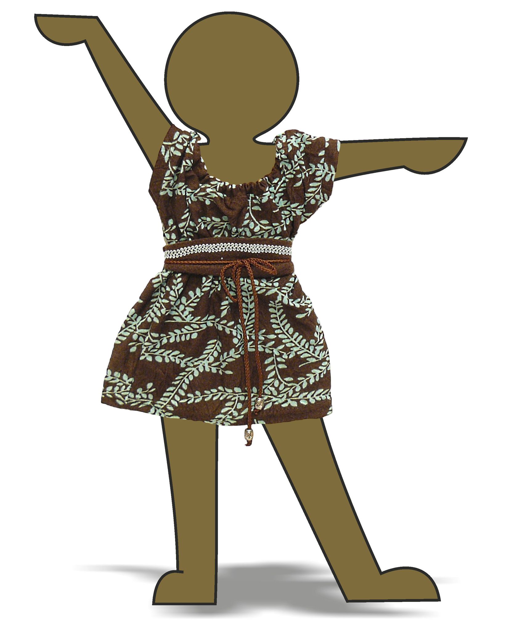 Комплект состоит из двух предметов: платье и пояс. Цельнокройное платье прямого силуэта изготовлено из хлопчато-бумажного трикотажного полотна с добавлением вискозы, что делает материал струящимся. Рукава и горловина отделаны широкой обтачкой. Для удобства эксплуатации в обтачку горловины продета тонкая резинка. Это позволило обойтись без дополнительной застежки. Украшением платья является пояс из фетра, дополненный декоративной тесьмой и шнуром с металлической фурнитурой.
