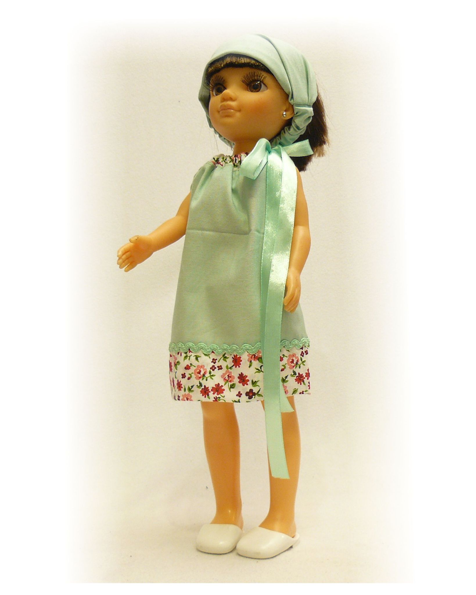 Сарафан изготовлен из высококачественной х/б ткани. Яркий рисунок отделки прекрасно сочетается с однотонной основой. Простота фасона позволяет использовать этот сарафан для широкого ряда кукол. Лента-утяжка по линии горловины корректирует посадку на любую куклу. Бандана на резинке сзади будет хорошим дополнением к комплекту.