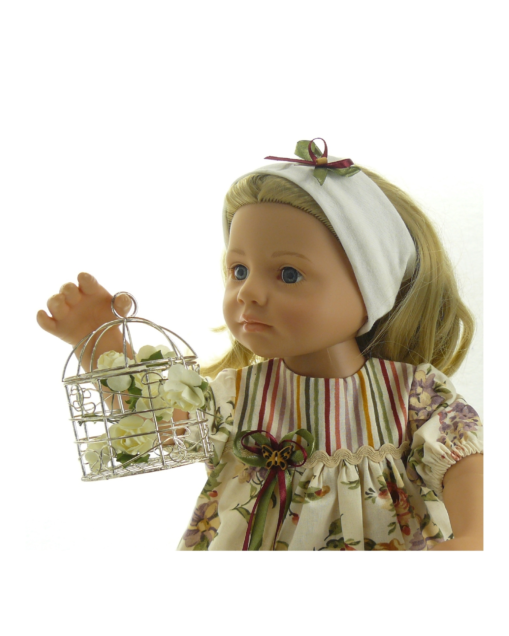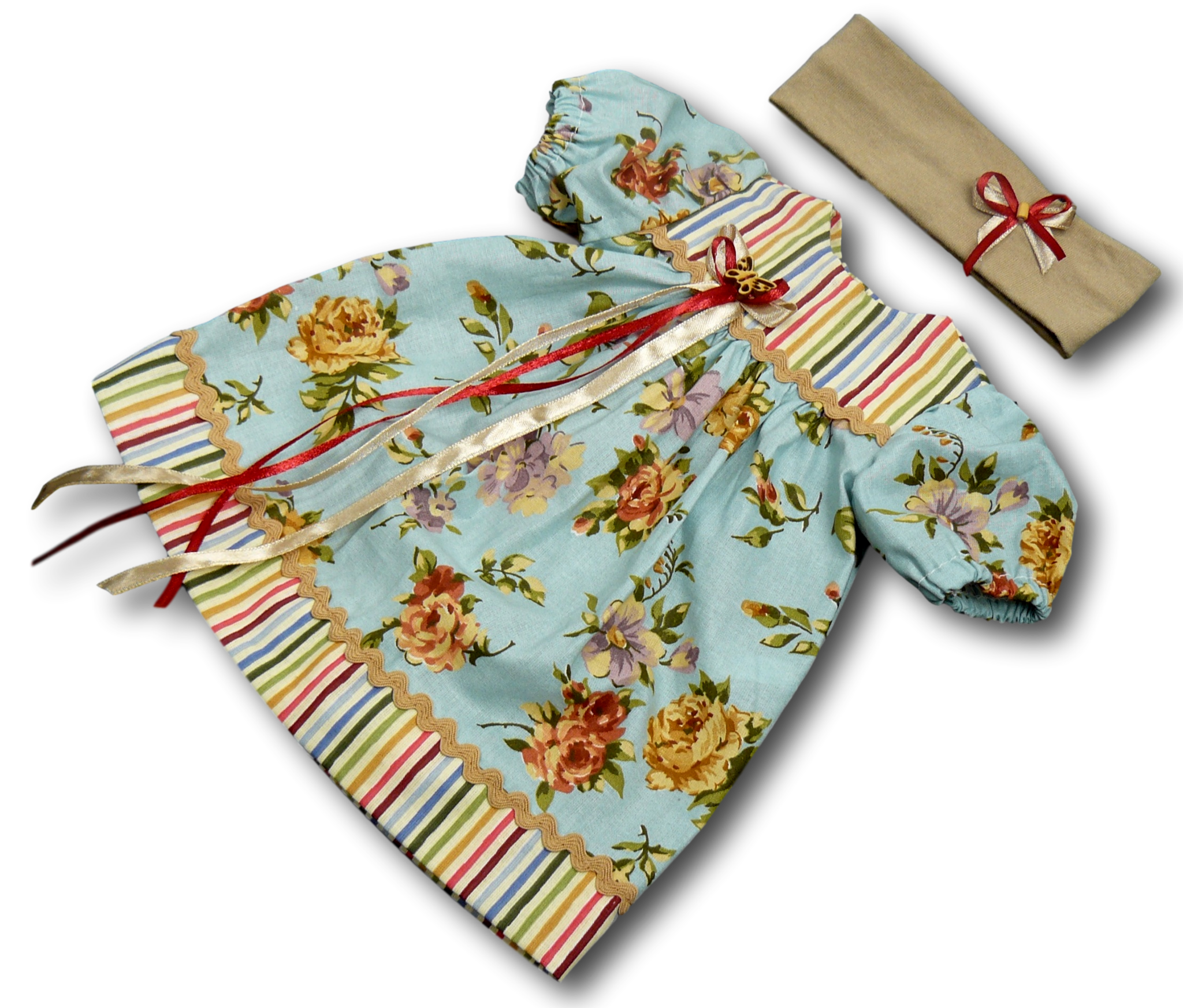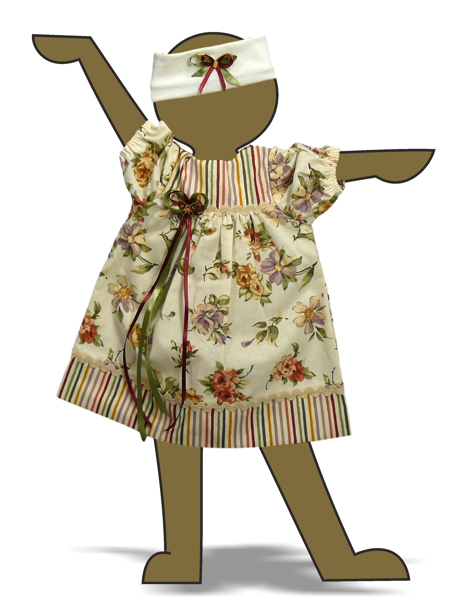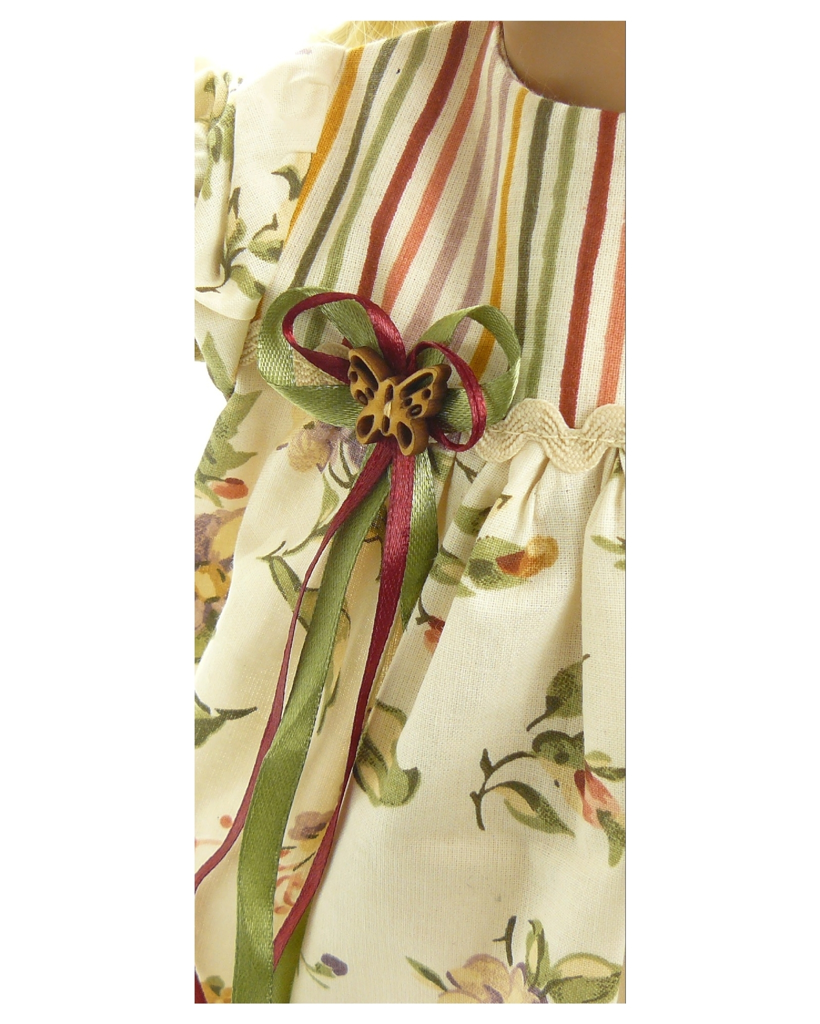 Платье расклешенного силуэта на кокетке. Изготовлено из нежной перкали. Тщательно подобранные ткани-компаньоны делают его изысканным и оригинальным. В качестве отделки использованы тесьма - вьюнчик и нарядные шелковые ленты, закрепленные фурнитурой из натуралього дерева. Глубокая застежка - липучка сзади облегчает эксплуатацию изделия. Завершает образ полоска на голову из трикотажного полотна.