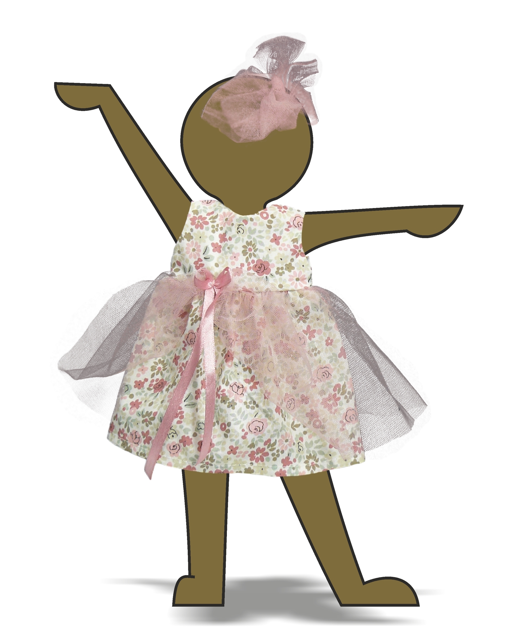 Нежное платье без рукавов изготовлено из тонкой перкали с мелким рисунком. Кокетка выворотная на подкладке, что обеспечивает аккуратную линию пройм и горловины. Юбка продублирована тонкой нейлоновой сеткой, ассиметрично закрепленной шелковой лентой. Застежка - липучка сзади. Дополнением к платью служит полоска из сетки.