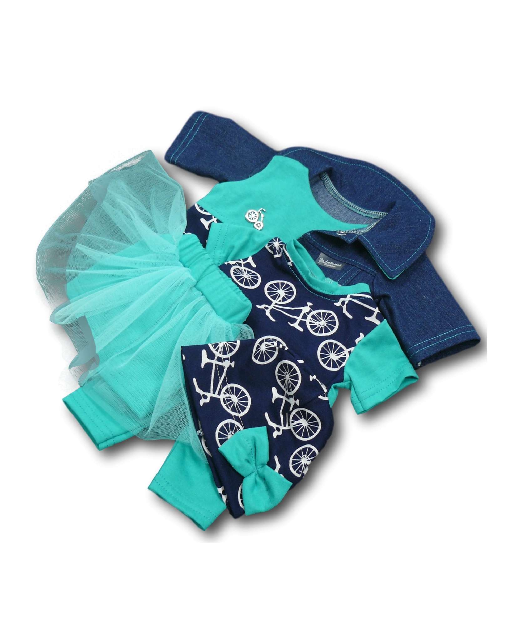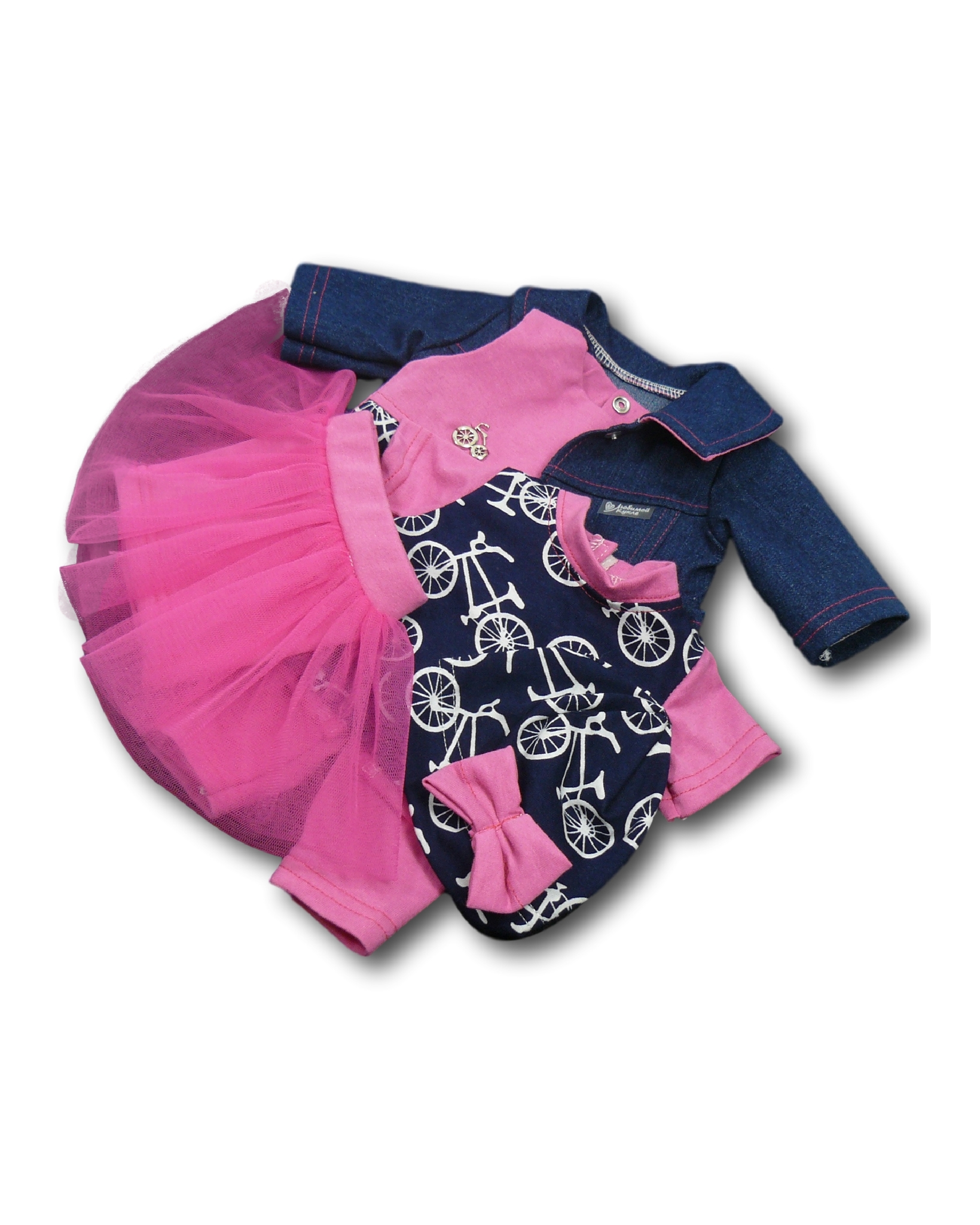Куртка, платье, юбка, футболка, лосины и шапочка на голову. Весь комплект выполнен в единой цветовой гамме и сочетается в разных комбинациях. Джинсовая куртка классического покроя с кнопками и холнитенами. Обратная сторона воротника и отстрочки в ярких отделочных цветах. Остальные предметы комплекта изготовлены из тонкого кулирного полотна. Платье с выворотными проймами и горловиной застегивается сзади на кнопку. Футболка классического покроя, распашная с застежкой-липучкой. Нарядным дополнением комплекту является многослойная юбка из сетки на подкладке. Пояс усилен широкой резинкой . Завершает образ шапочка на голову, украшенная бантом. Из элементов этого комплекта можно создать множество вариантов костюма от пижамы до элегантного уличного комплекта.