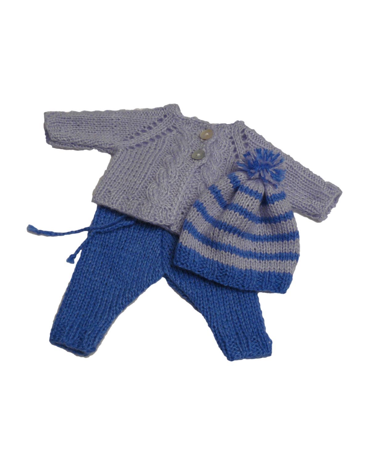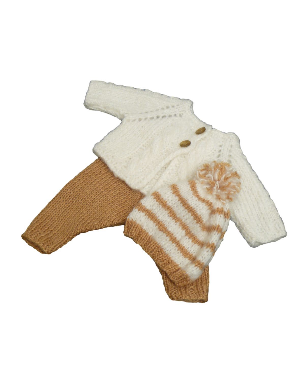 Жакет с красиво вывязанной проймой и объемным рисунком на полочках имеет застежку на пуговицы. Рейтузы имеют утяжку по талии.