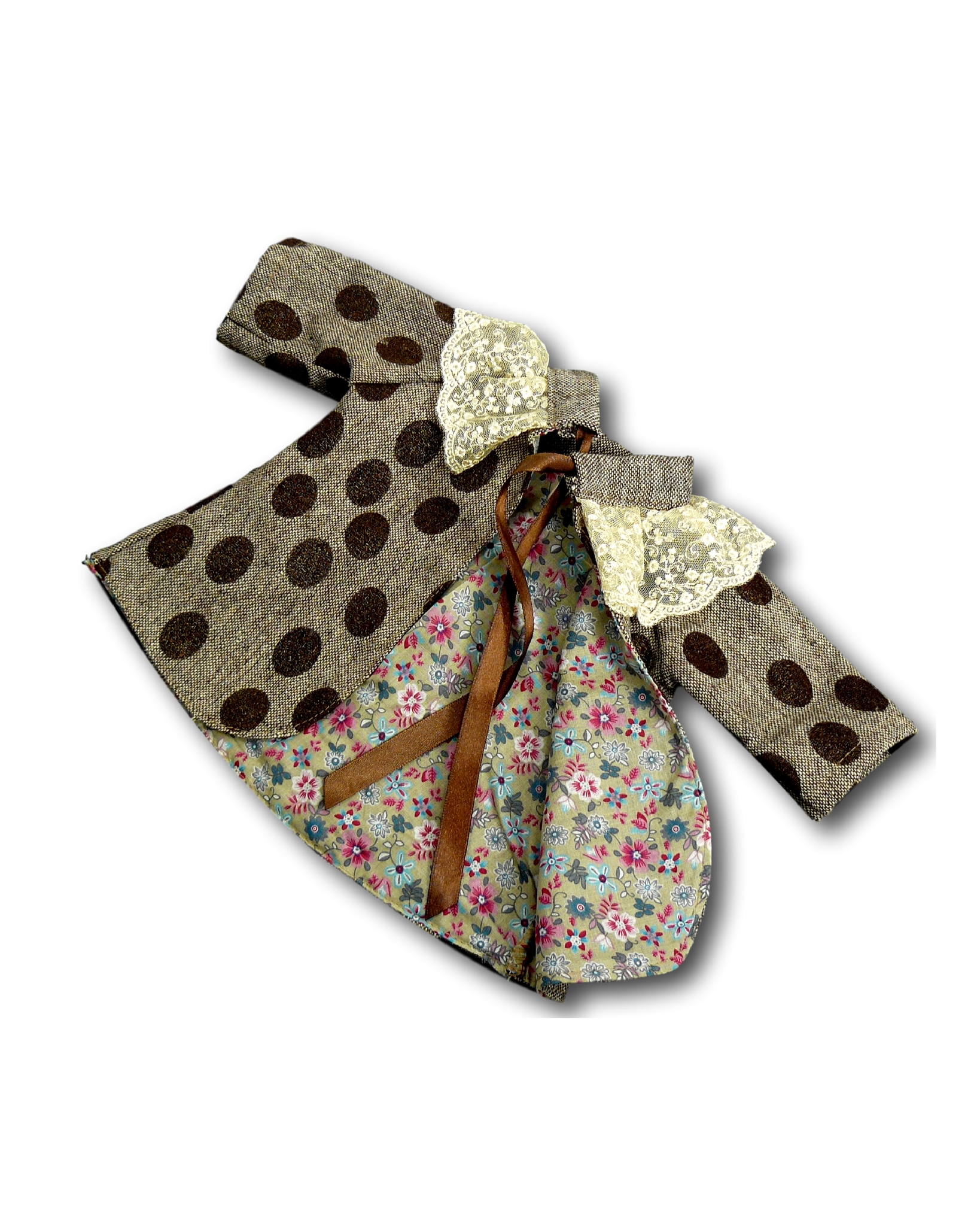Пальто,расклешенного силуэта изготовлено из твидовой ткани. Набивной рисунок с легким блеском и кружевной воротник-волан придают пальто романтический вид. Шелковый бант-завязка дополняет этот образ. Полочки и спинка продублированы подкладкой из х/б ткани в мелкий цветочек. Пальто прекрасно дополнит весенний гардероб Вашей куклы.
