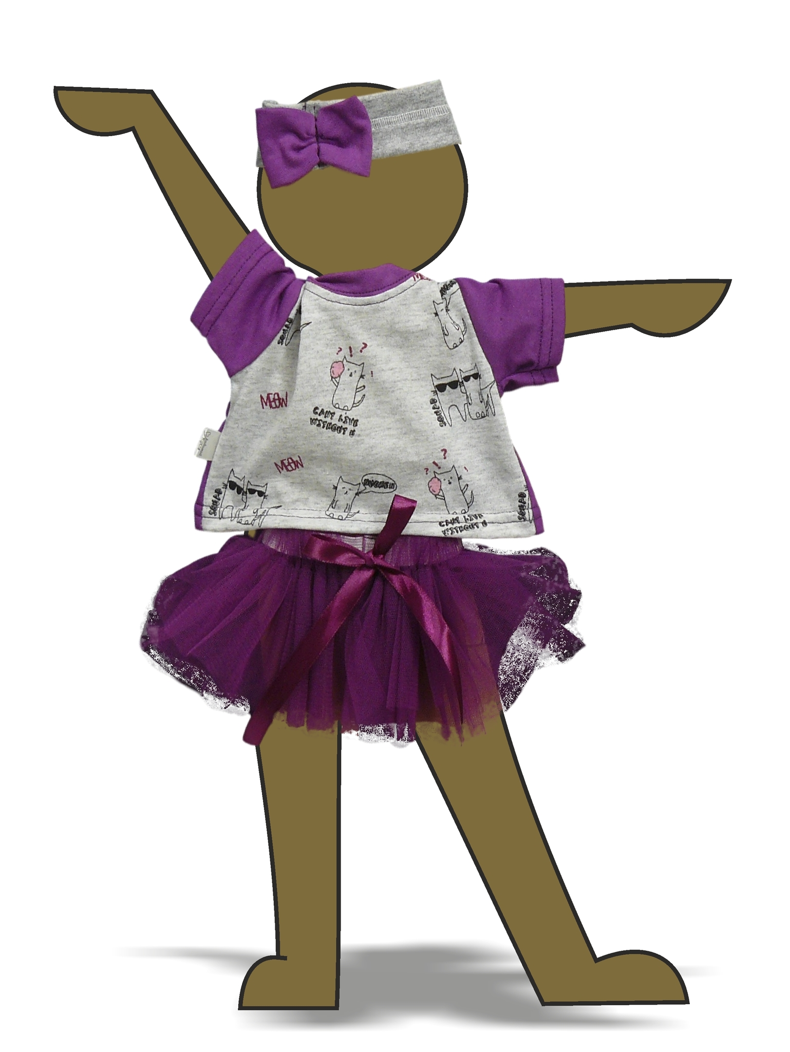 Комплект состоит из трех предметов: Футболка, юбка и полоска на голову.