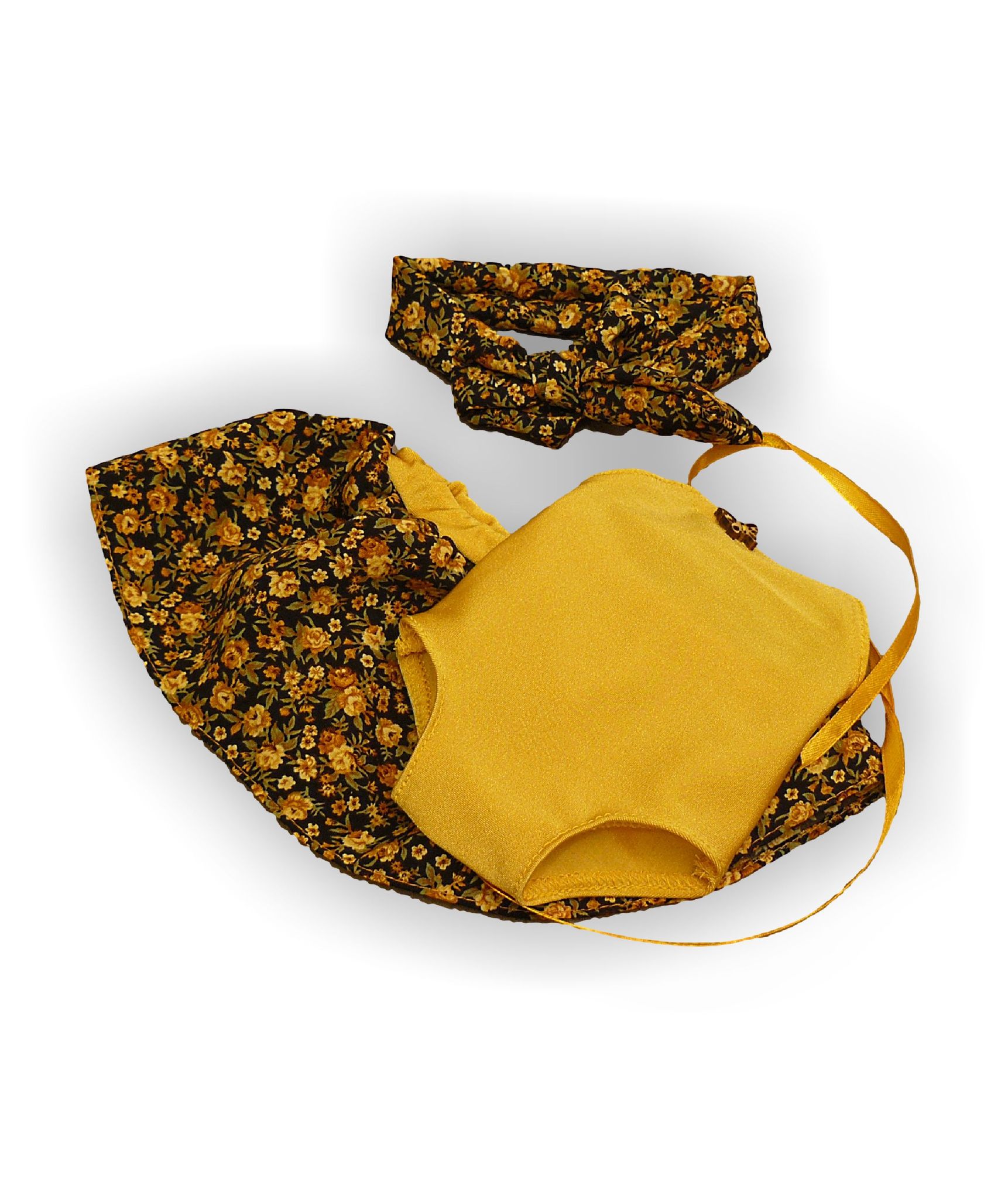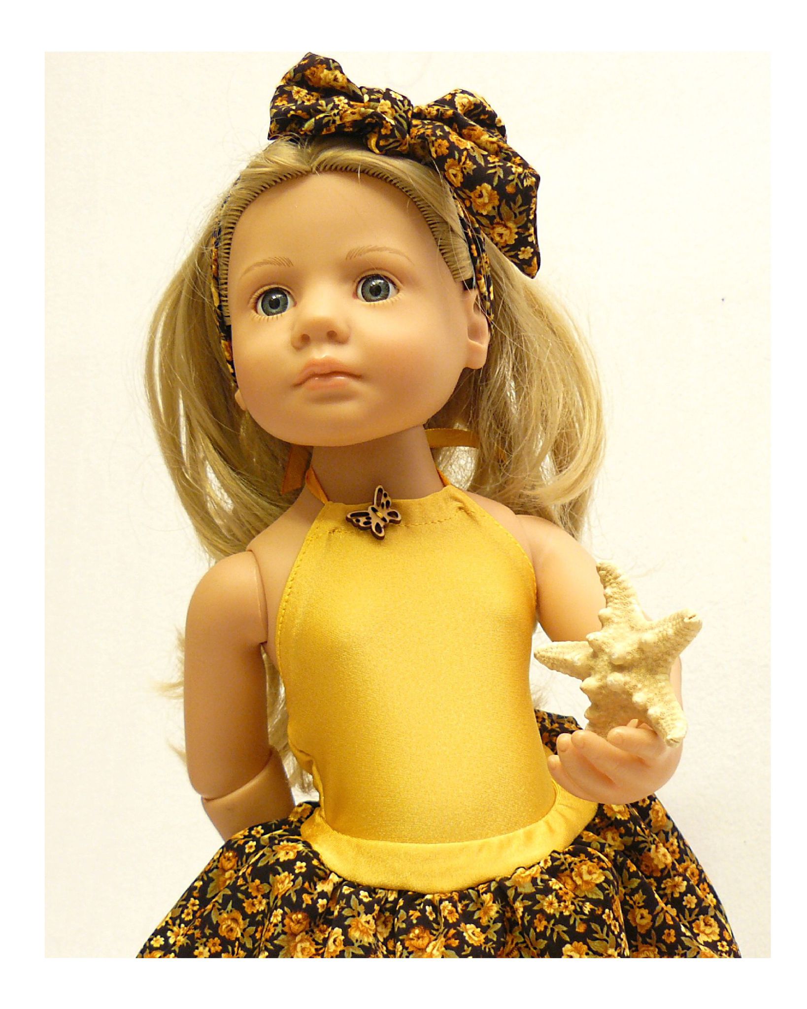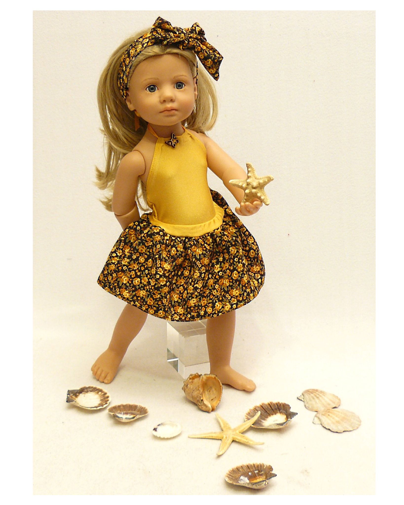 Комплект состоит из трех предметов: Купальник, юбка и повязка на голову. Цельнокройный купальник изготовлен из эластичной ткани - лайкры. Резинка на спинке изделия и шелковая лента в горловине позволяют корректировать посадку на фигуре. Украшением служит нарядная деревянная фурнитура. Дополнением к купальнику являются юбка и повязка на голову.