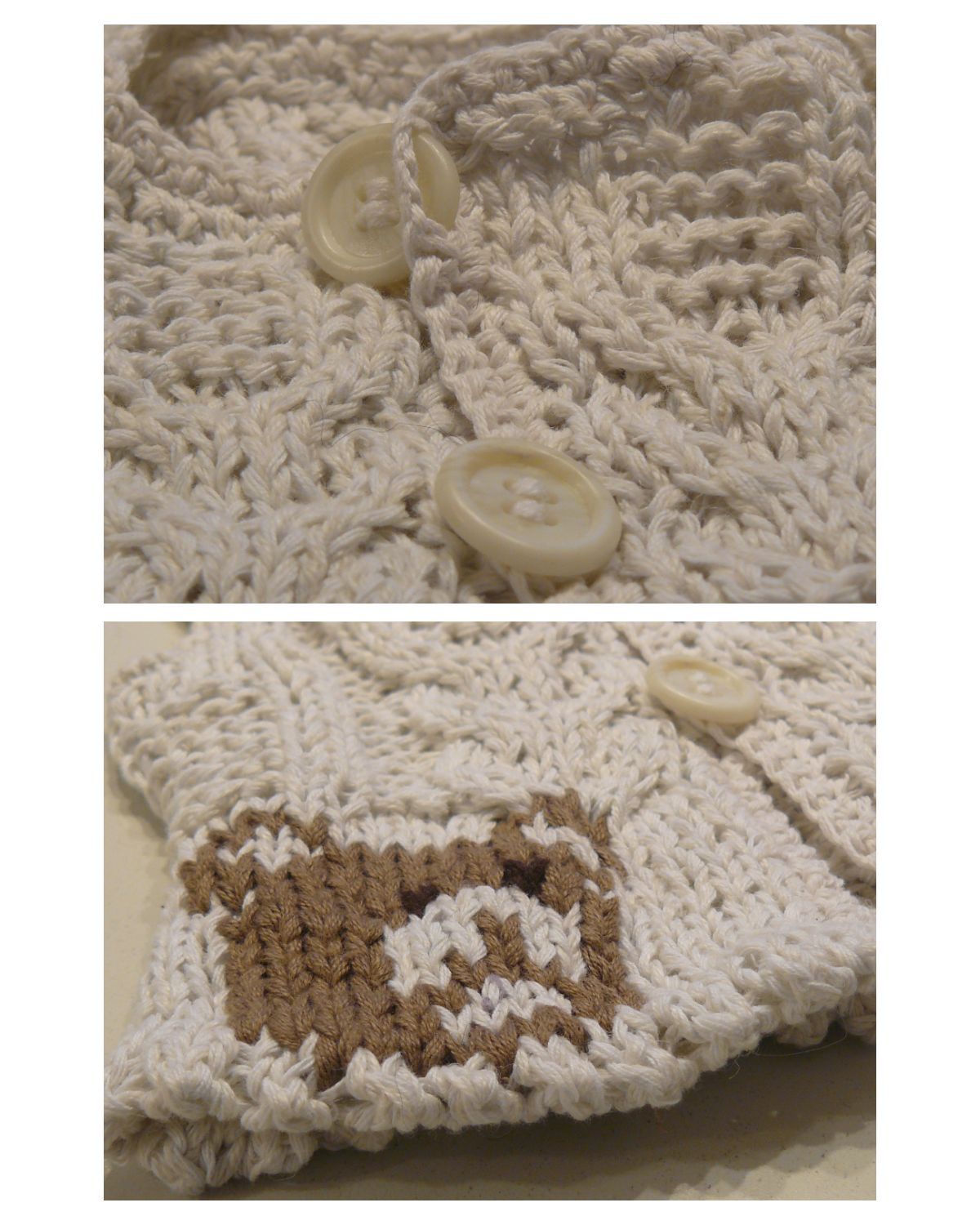 Сложный рисунок вязки дополняется вывязанной мордочкой медведя.