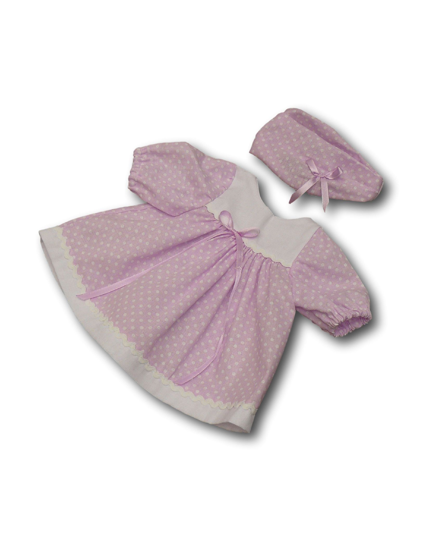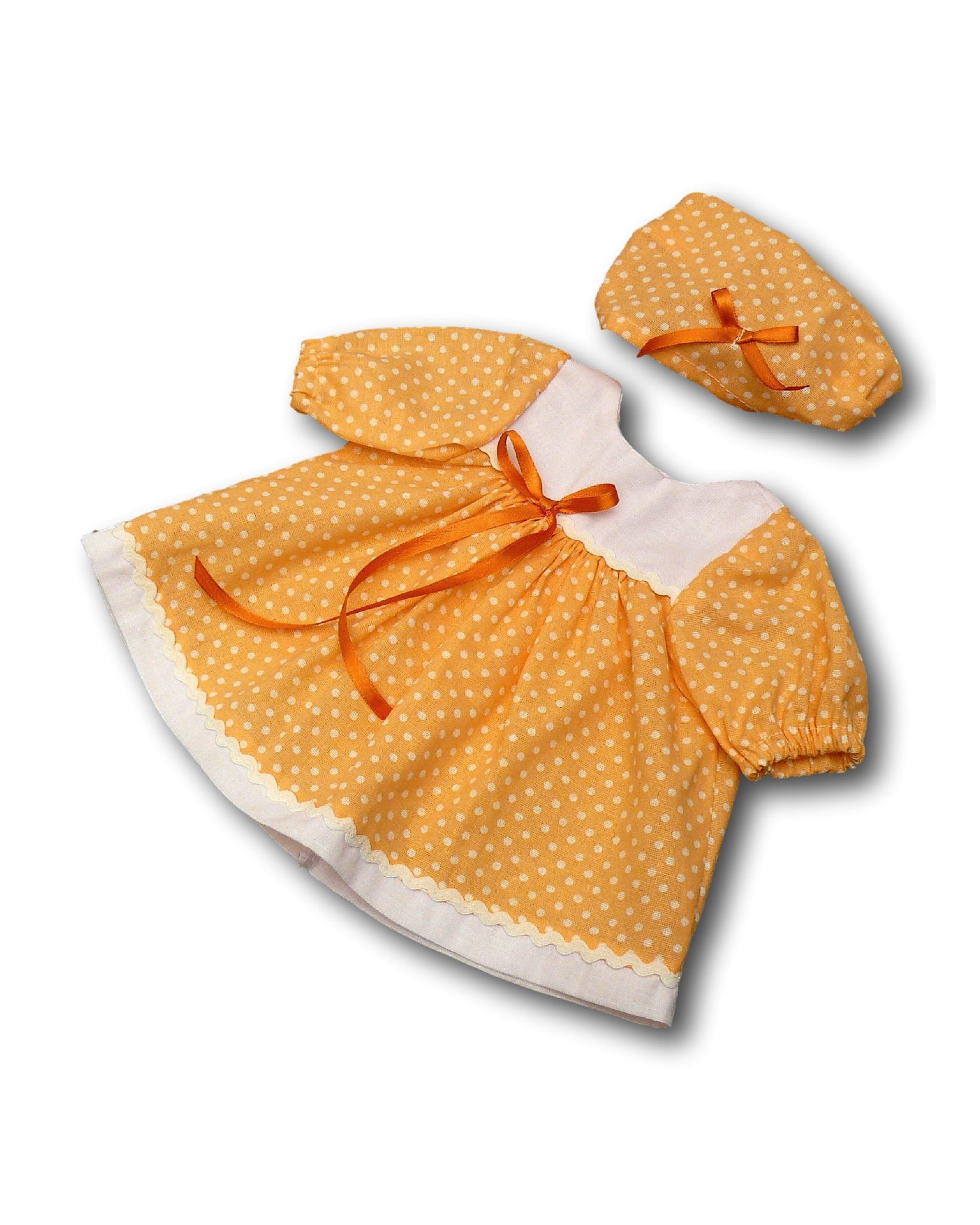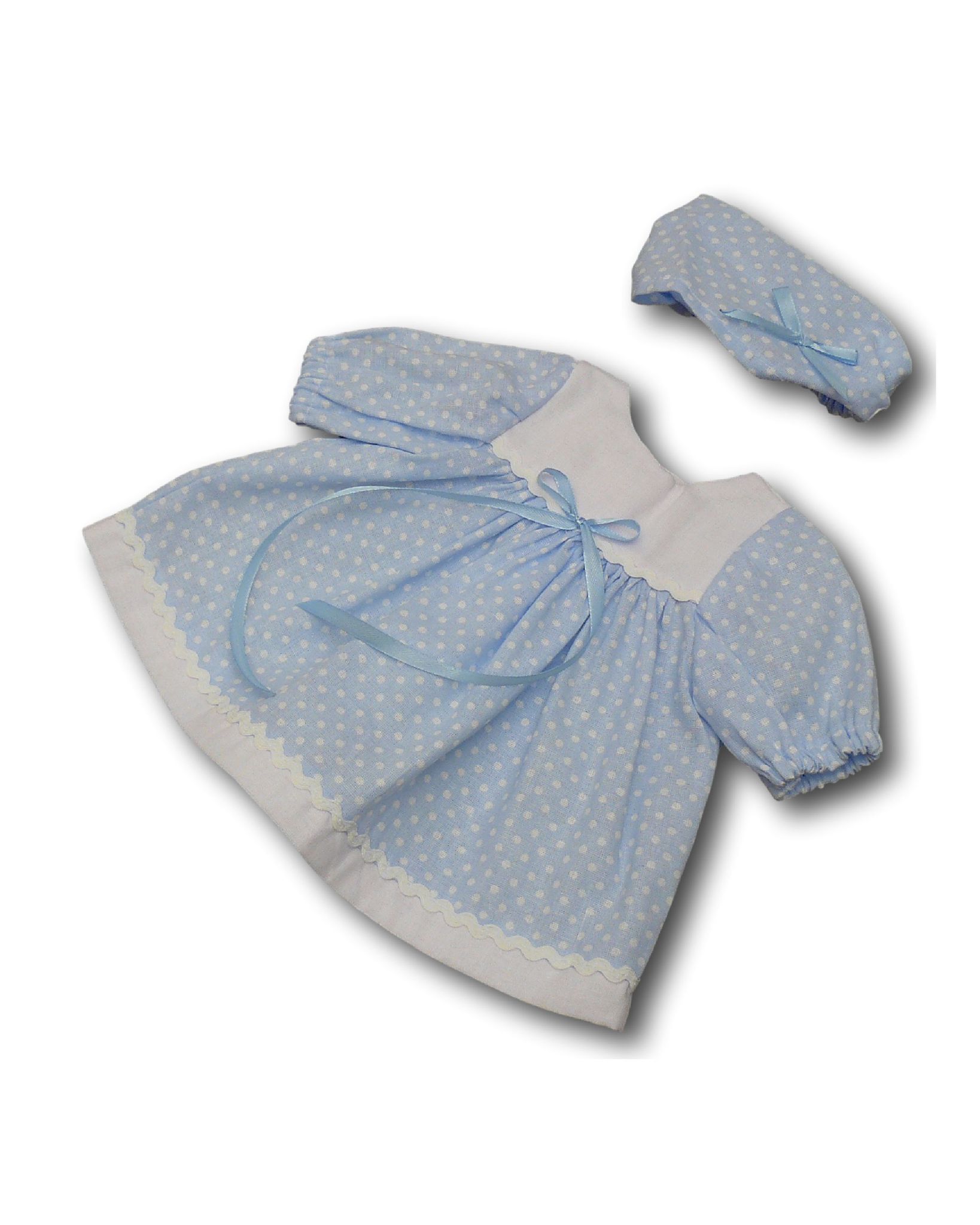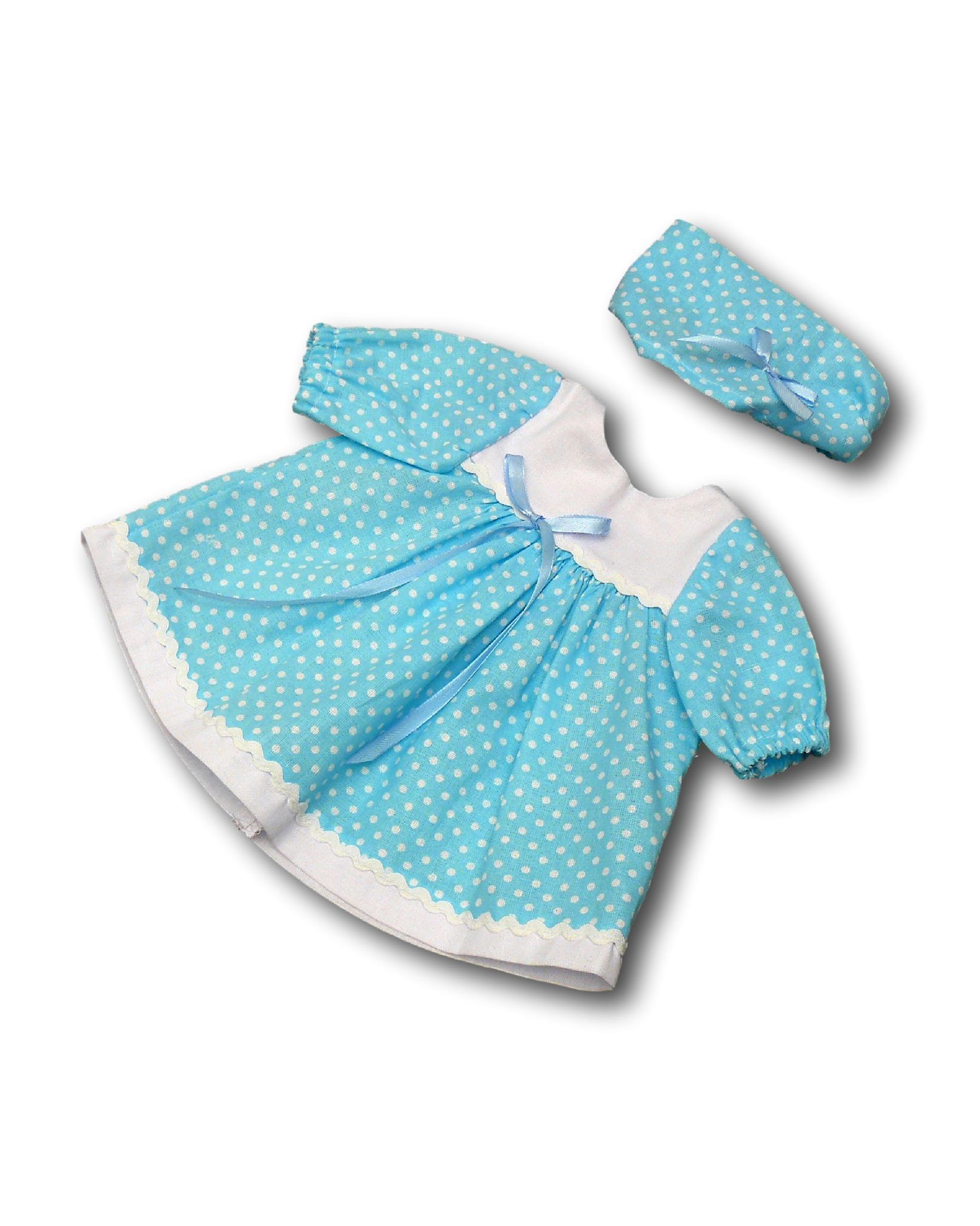 Платье на кокетке изготовлено из хлопчато-бумажной ткани . Для кокетки и каймы на юбке использована белая ткань. Глубокая застежка сзади облегчает эксплуатацию изделия. Цвет ленты велкро подобран в тон кокетке. Украшением служит фигурная тесьма и бант из шелковой ленты. Полоска на голову изготовлена из ткани комплекта и украшена бантом . Полоска сзади присобрана на резинку, что позволяет ей лучше держаться на голове куклы. Она служит отличным дополнением к платью.