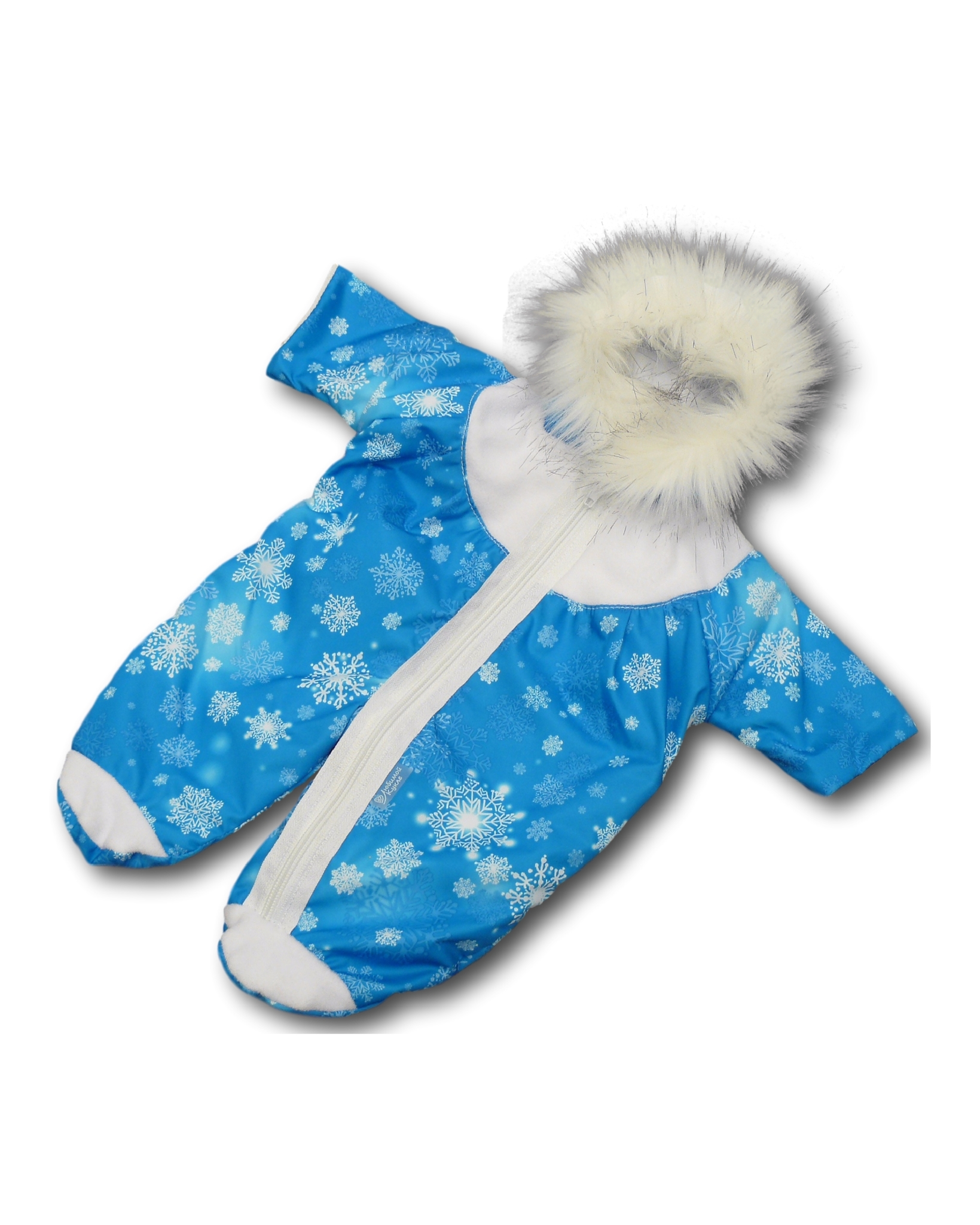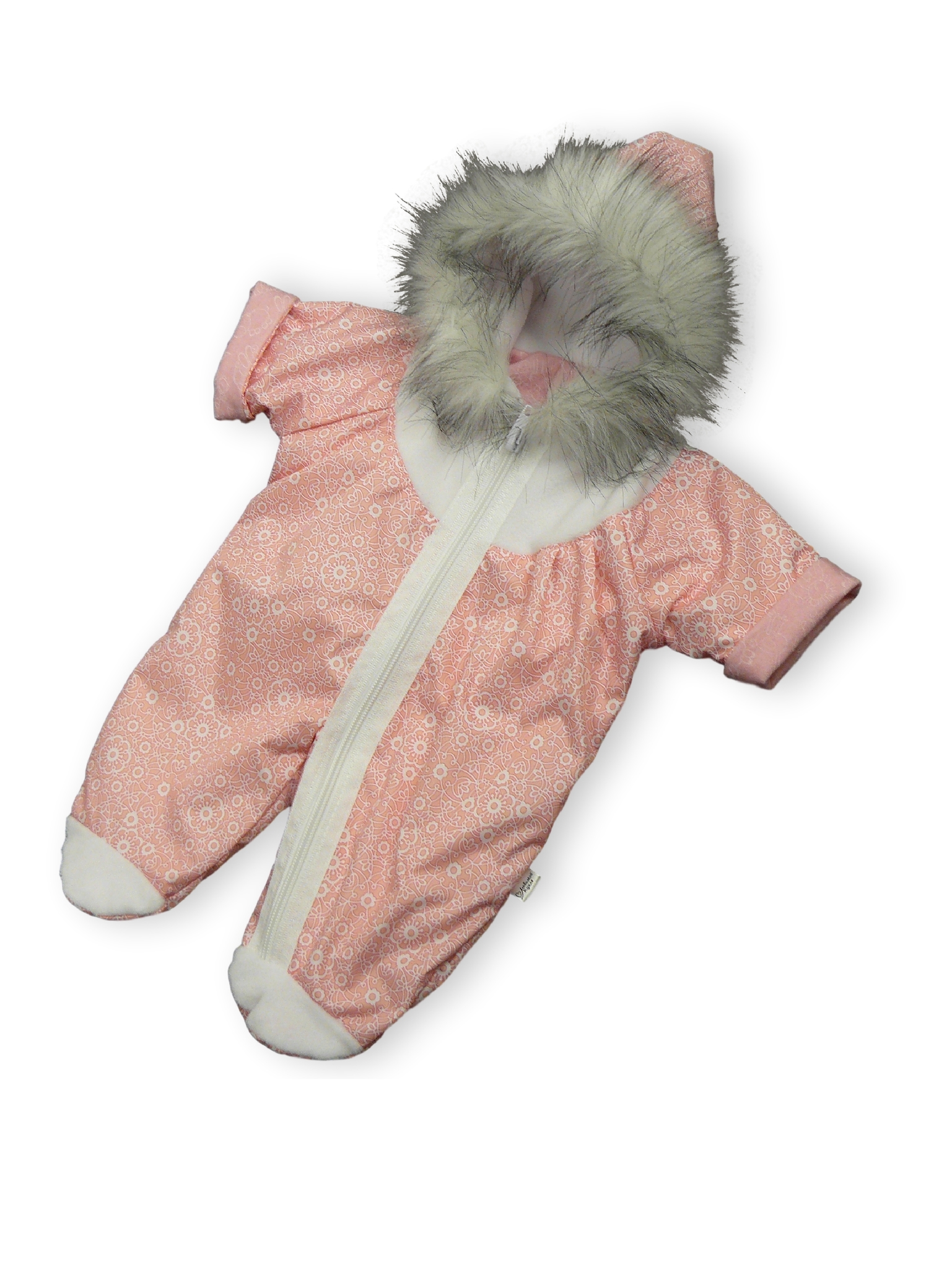 Комбинезон с капюшоном изготовлен из водоотталкивающей ткани с оригинальным принтом на подкладке с отделкой из флиса. Основной декоративный эффект придает капюшон, отороченный искусственным мехом с длинным ворсом.