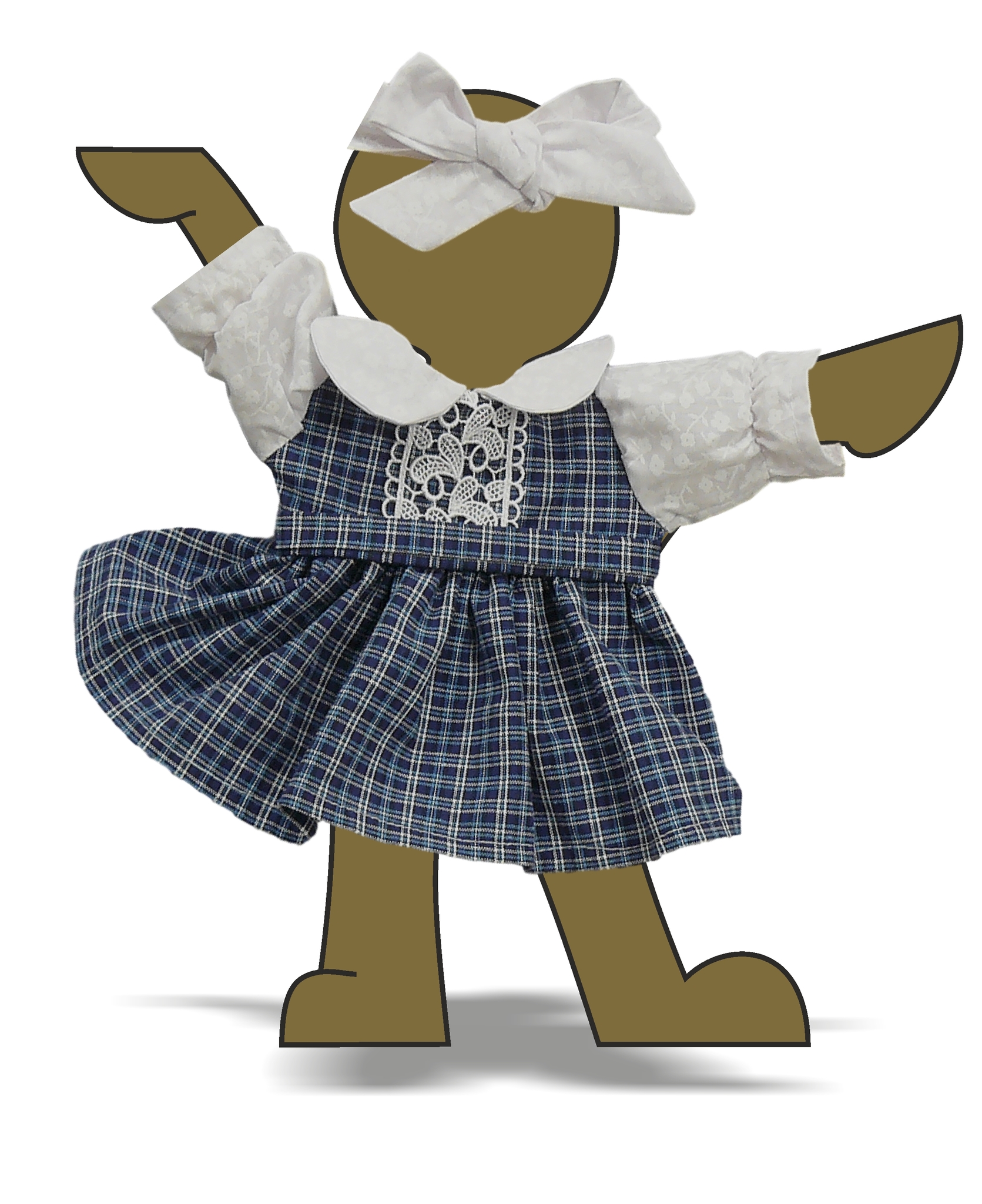 Платье с воротником, отрезное по линии талии, скомбинировано из двух видов ткани. Для воротника и рукавов использована тонкая х/б ткань с мелким рисунком. Для основы платья использована смесовая ткань в мелкую клетку. Юбка сильно присборена, т.к. имеет увеличенную ширину. По грудке платье украшено ажурным кружевом. Две дополнительные детали: пояс и полоска на голову, выполнены из разных тканей и могут заменять друг друга, создавая разные образы. Глубокая застежка сзади облегчает эксплуатацию изделия.