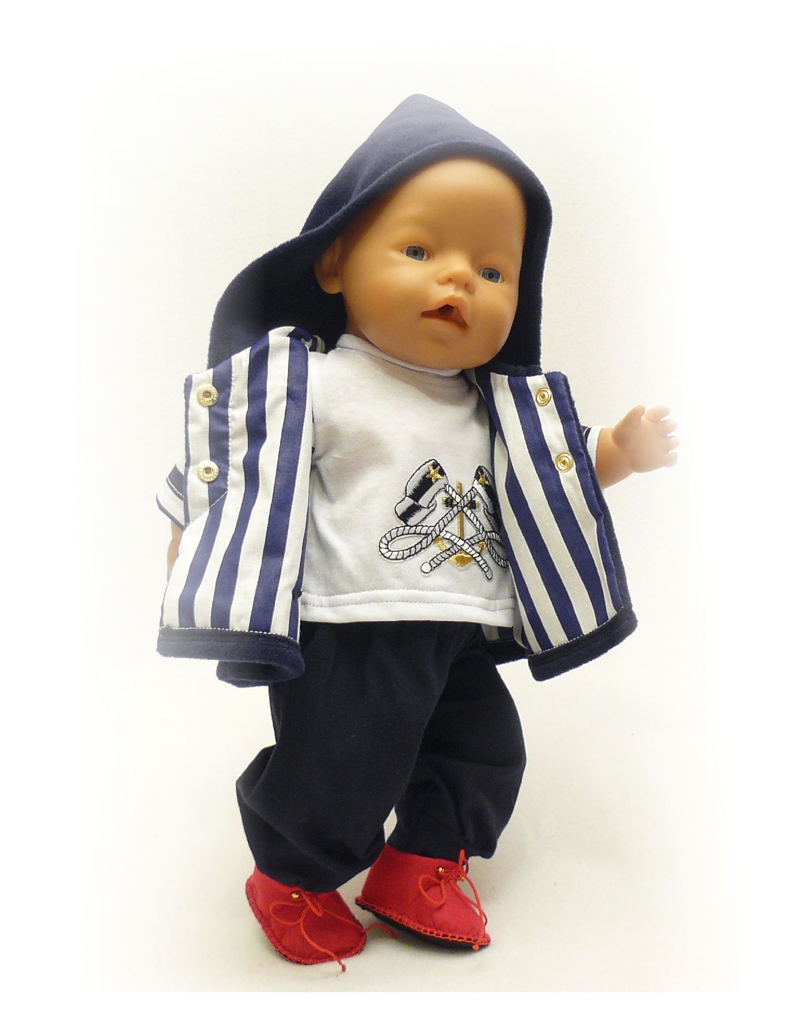 Все ткани и фурнитура для костюма подобраны в "морских" цветах и образах. Брюки свободного покроя и футболка со втачными рукавами из ткани компаньона выполнены из кулирного х/б полотна. Футболка украшена вышитой клеевой аппликацией с морским сюжетом. Брюки на широкой резинке, футболка - распашная на липучке сзади. Прекрасным дополнением к образу является флисовый жилет на х/б подкладке. Золотистая фурнитура сочетается с золотом аппликации. Завершают образ красные фетровые ботинки ручной работы.