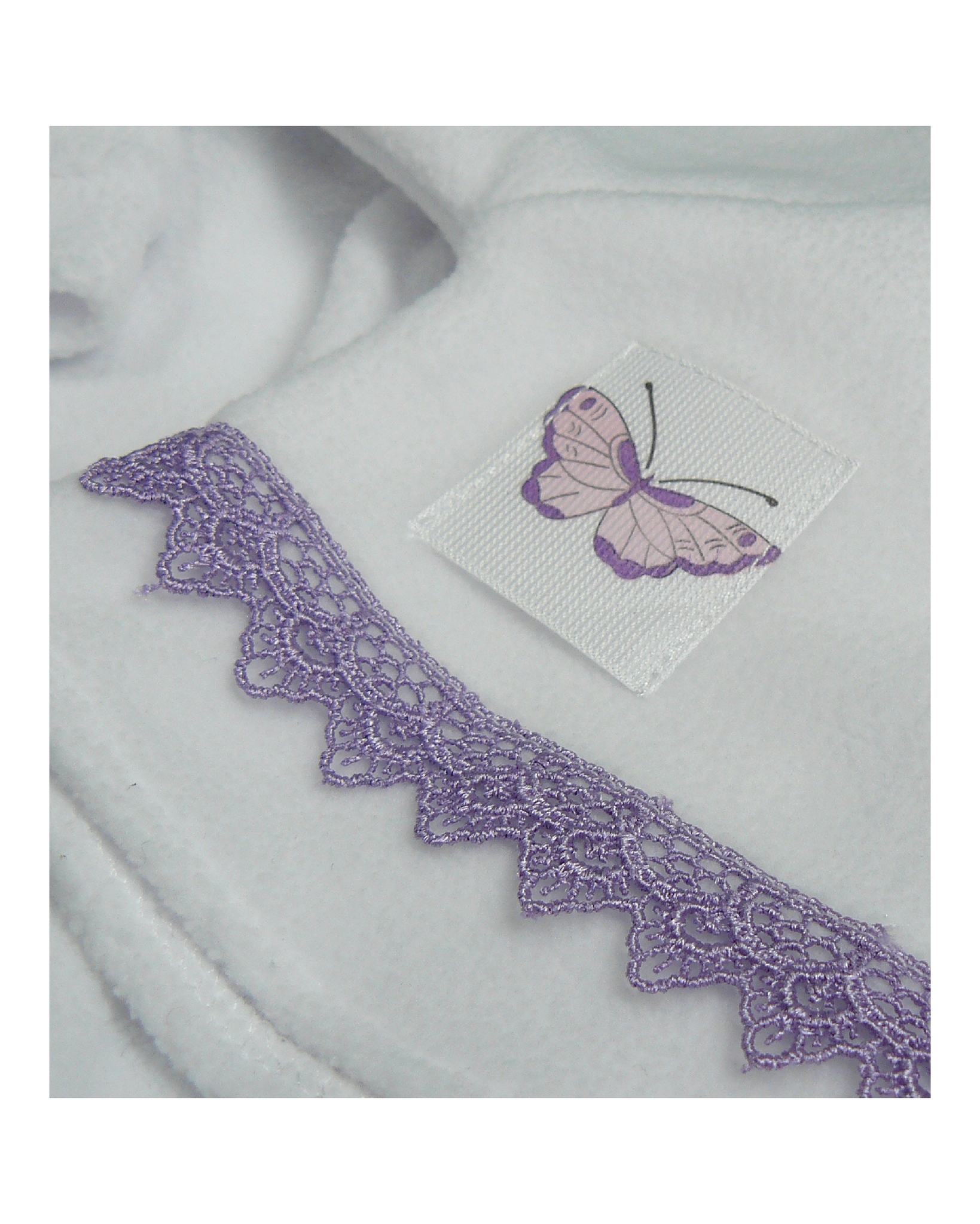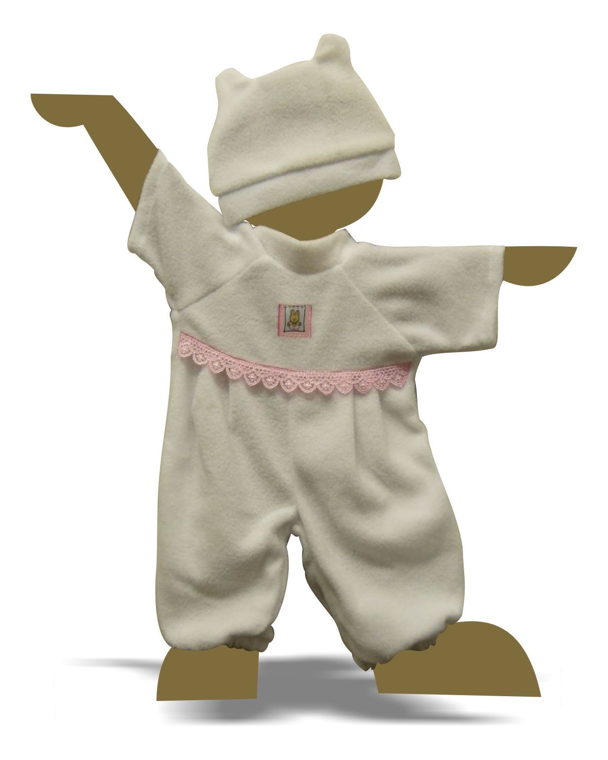 Песочник свободного покроя с кокеткой, отделанной нежным вязаным кружевом. Застежка на спинке - на две трикотажные кнопки. Низ штанишек на резинке.