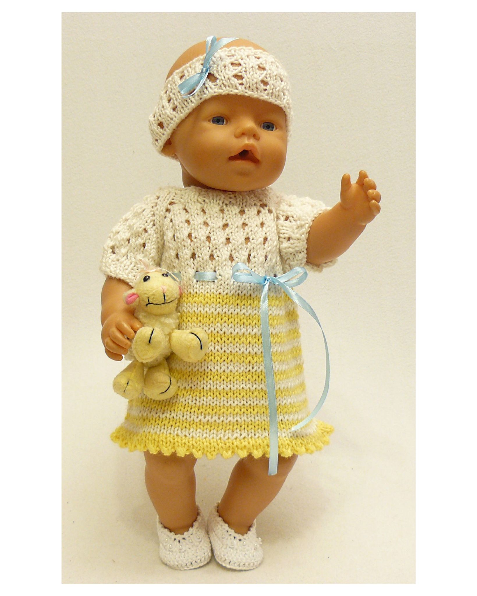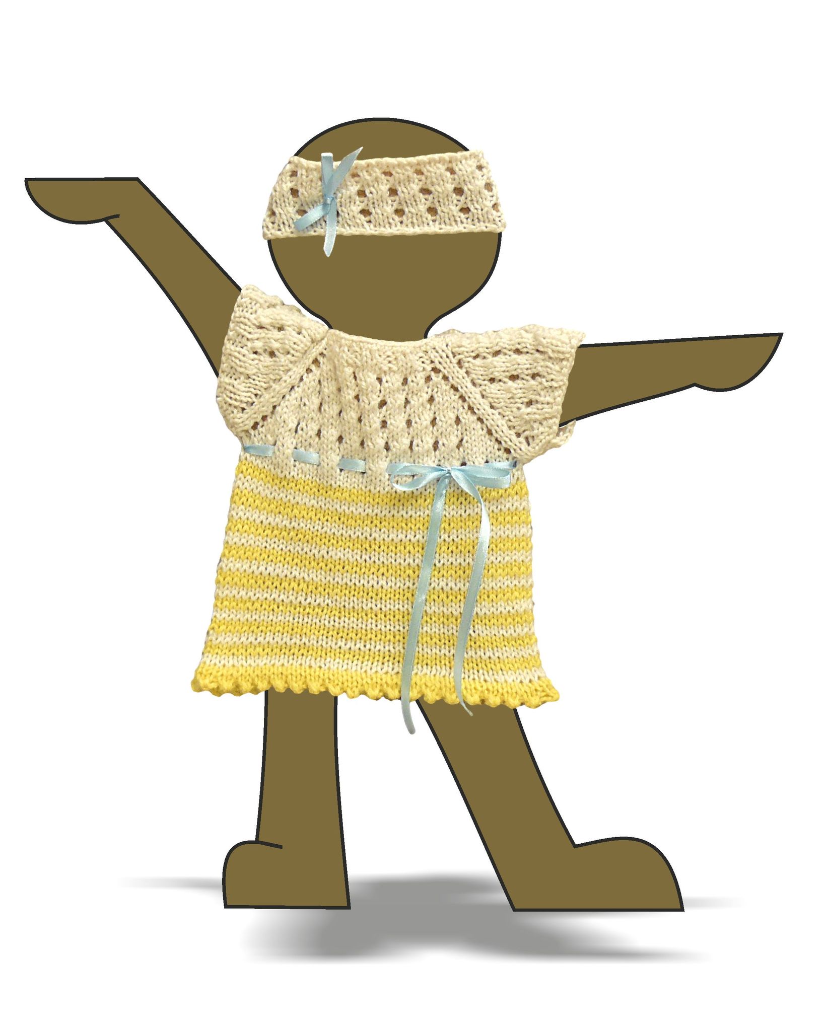 Комплект состоит из двух предметов: платье и полоска на голову. Рукав реглан и кокетка связаны ажурной вязкой. На подоле платья вывязаны тонкие полосы нежных цветов. Украшением служит шелковая лента, продернутая по линии груди. застежка платья сзади на пуговицы. Полоска связана ажурной вязкой в поддержку к верхней части платья.