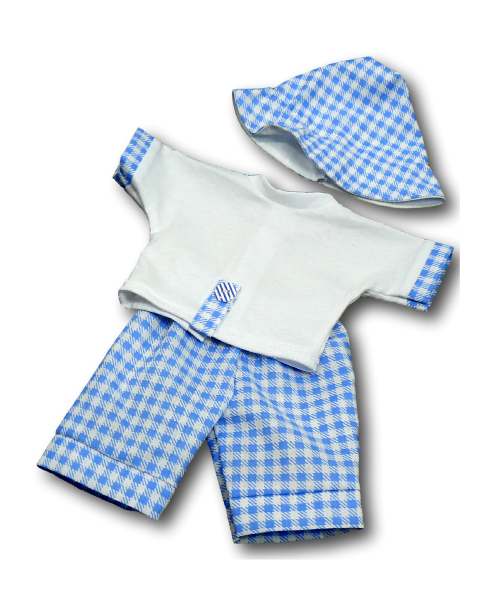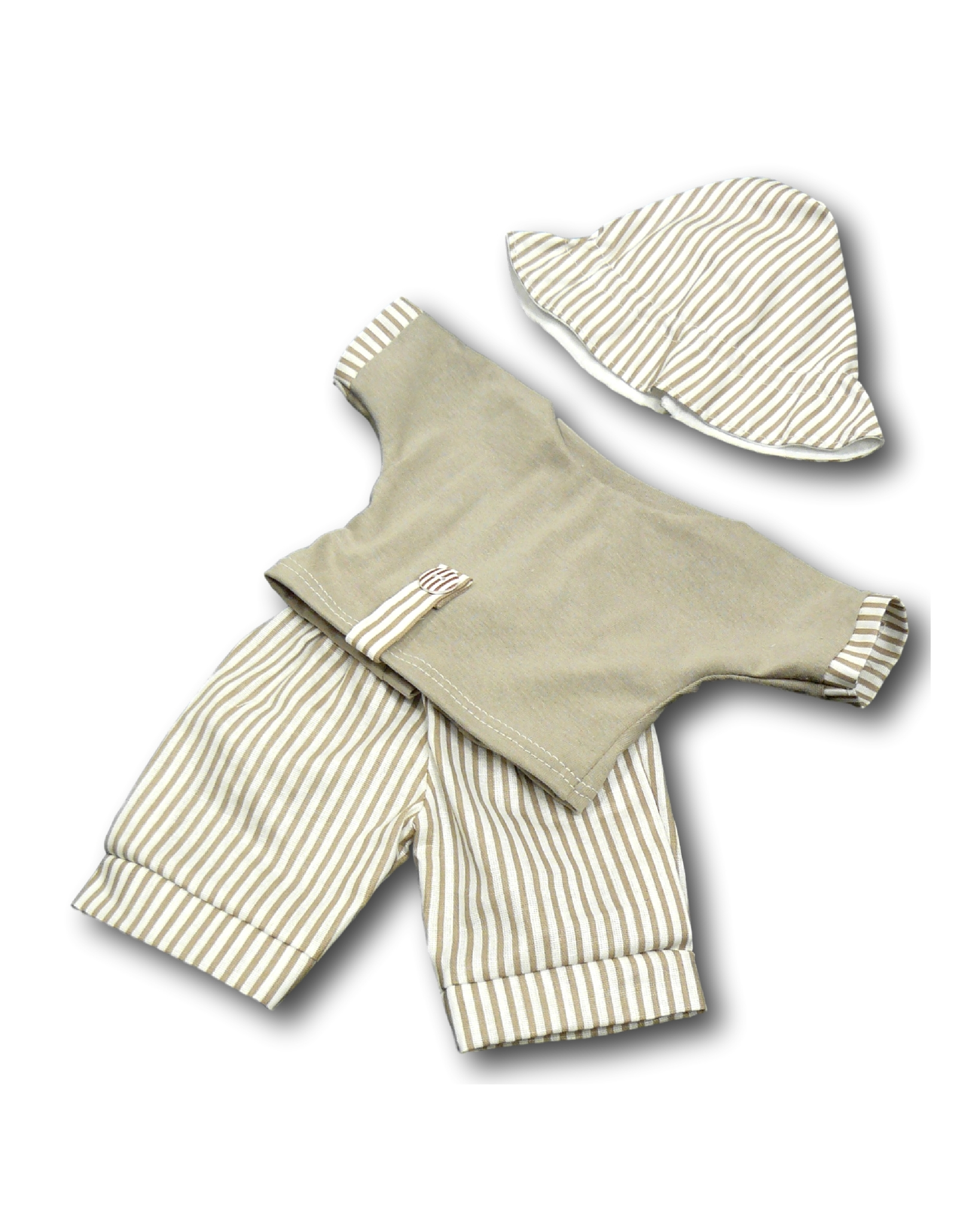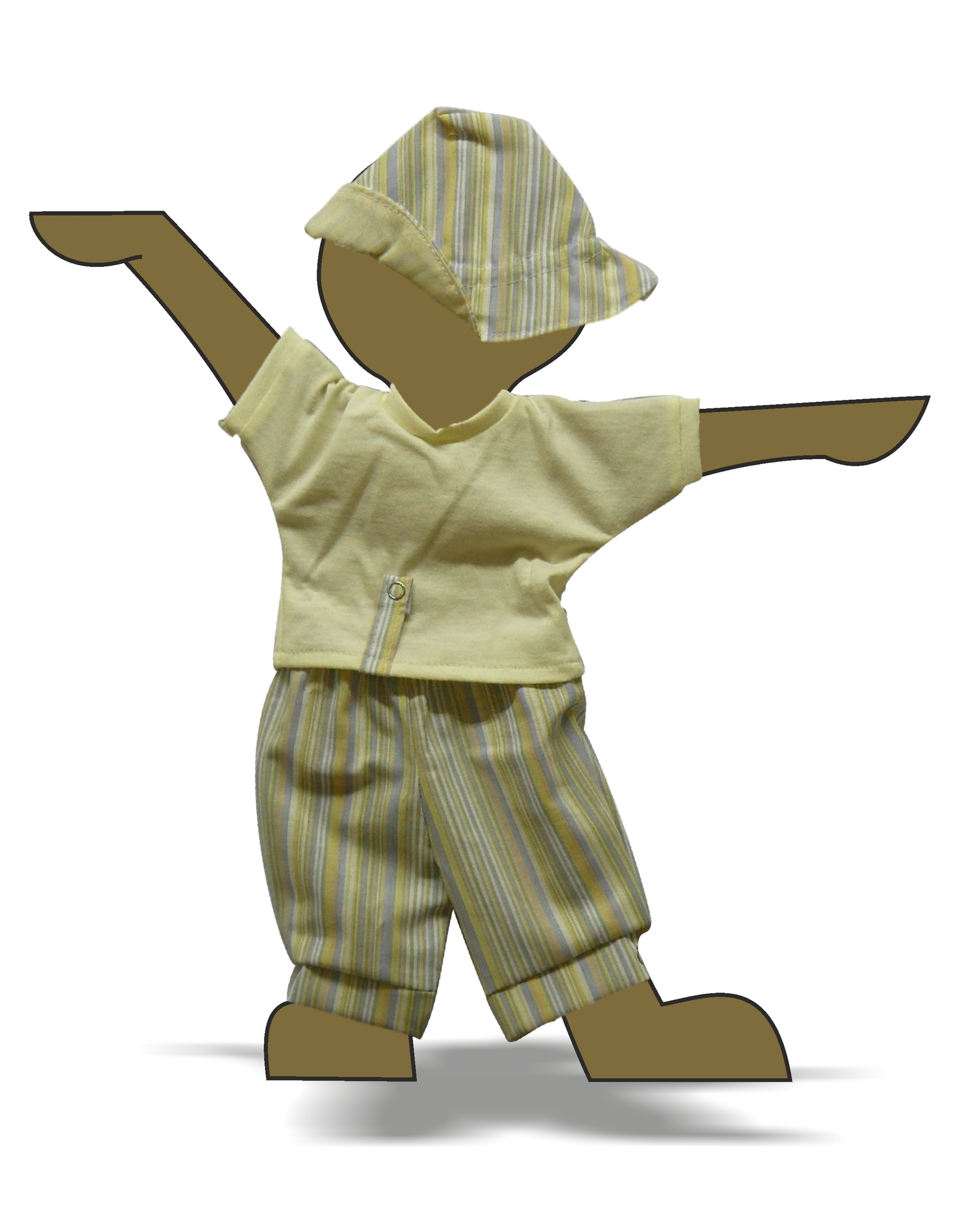 Панама на подкладке. Между подкладочной и основной тканью в кулиске расположена резинка, которая обеспечивает плотную посадку на голове куклы.