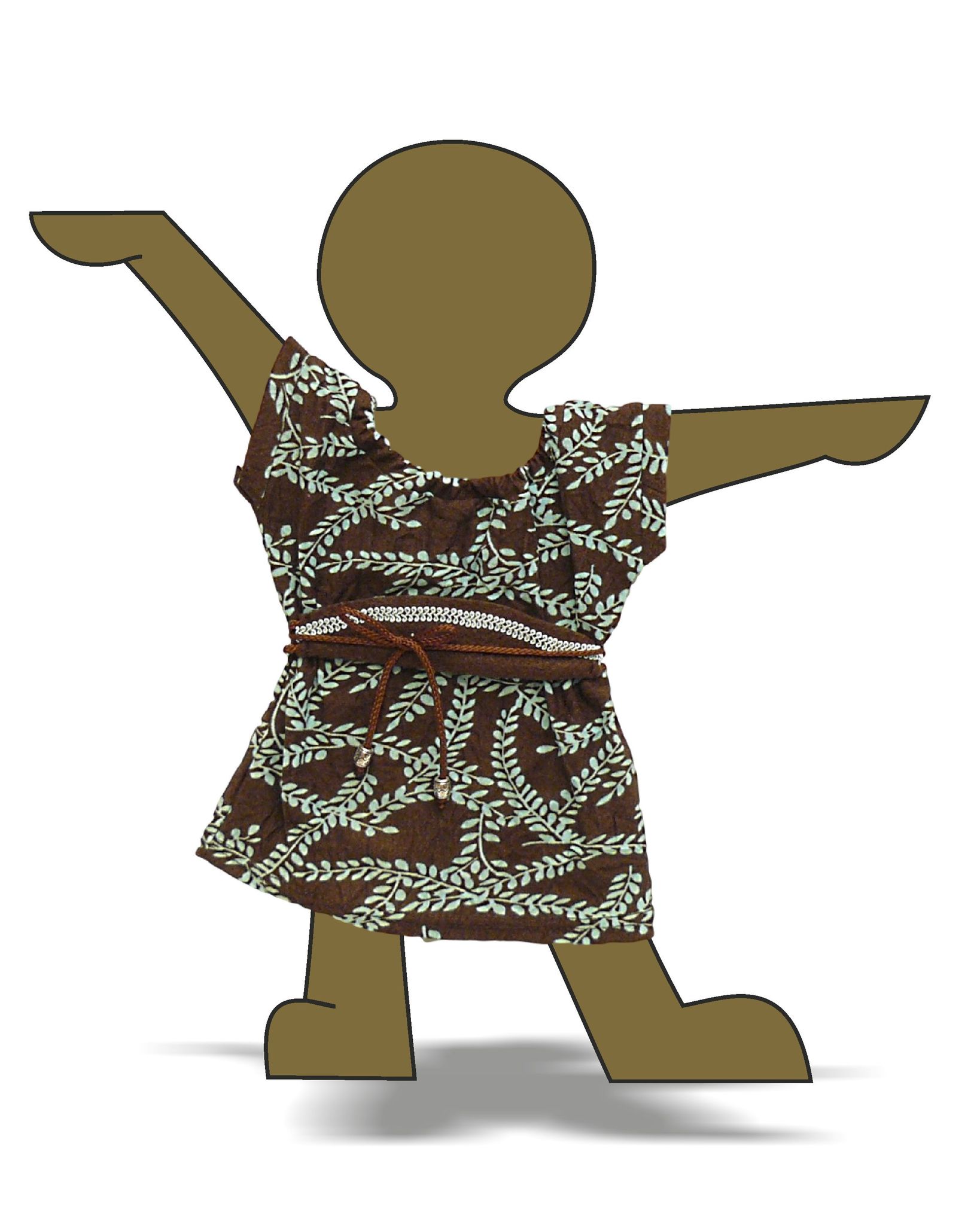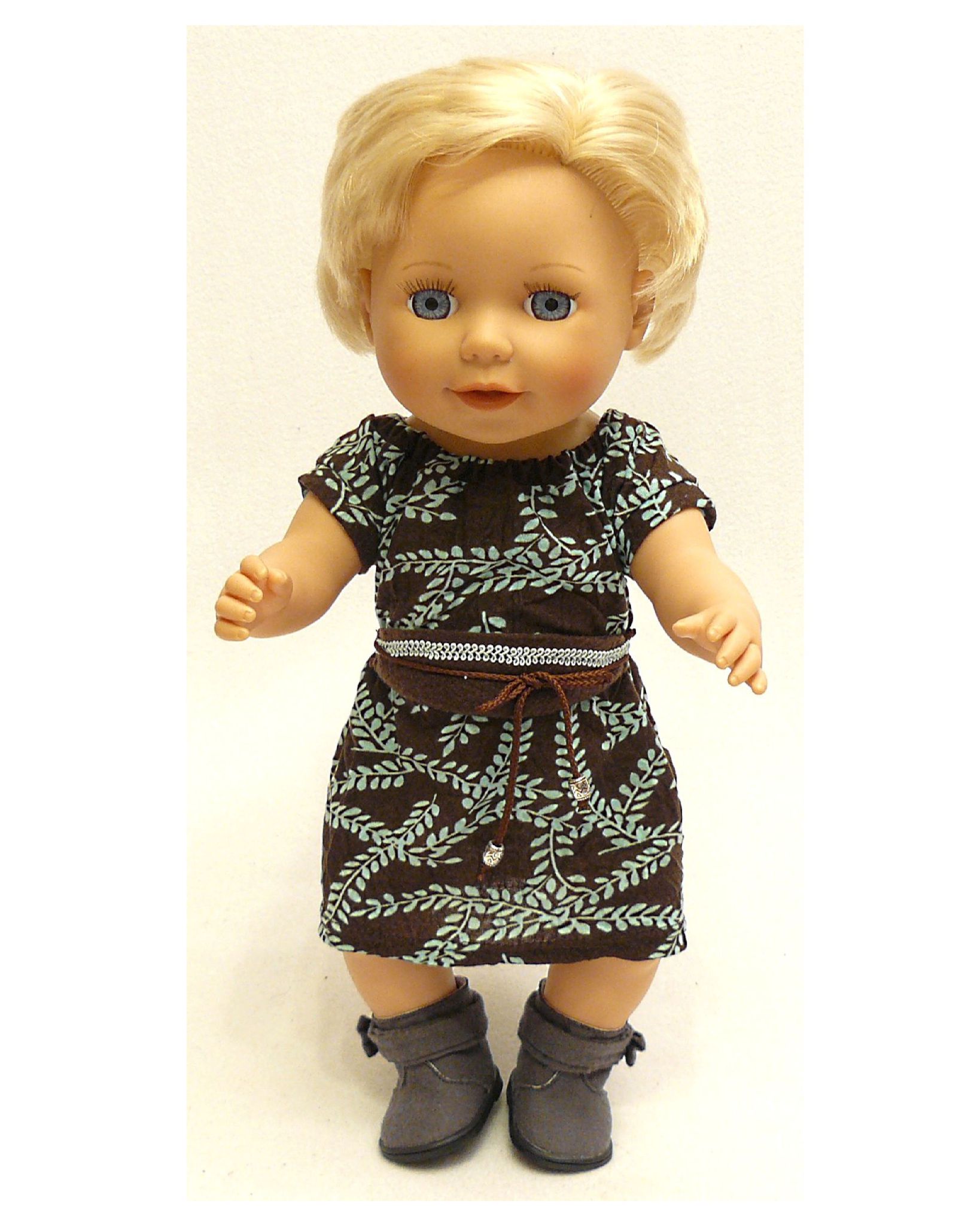 Комплект состоит из двух предметов: платье и пояс. Цельнокройное платье прямого силуэта изготовлено из хлопчато-бумажного трикотажного полотна с добавлением вискозы, что делает материал струящимся. Рукава и горловина отделаны широкой обтачкой. Для удобства эксплуатации в обтачку горловины продета тонкая резинка. Это позволило обойтись без дополнительной застежки. Украшением платья является пояс из фетра, дополненный декоративной тесьмой и шнуром с металлической фурнитурой.