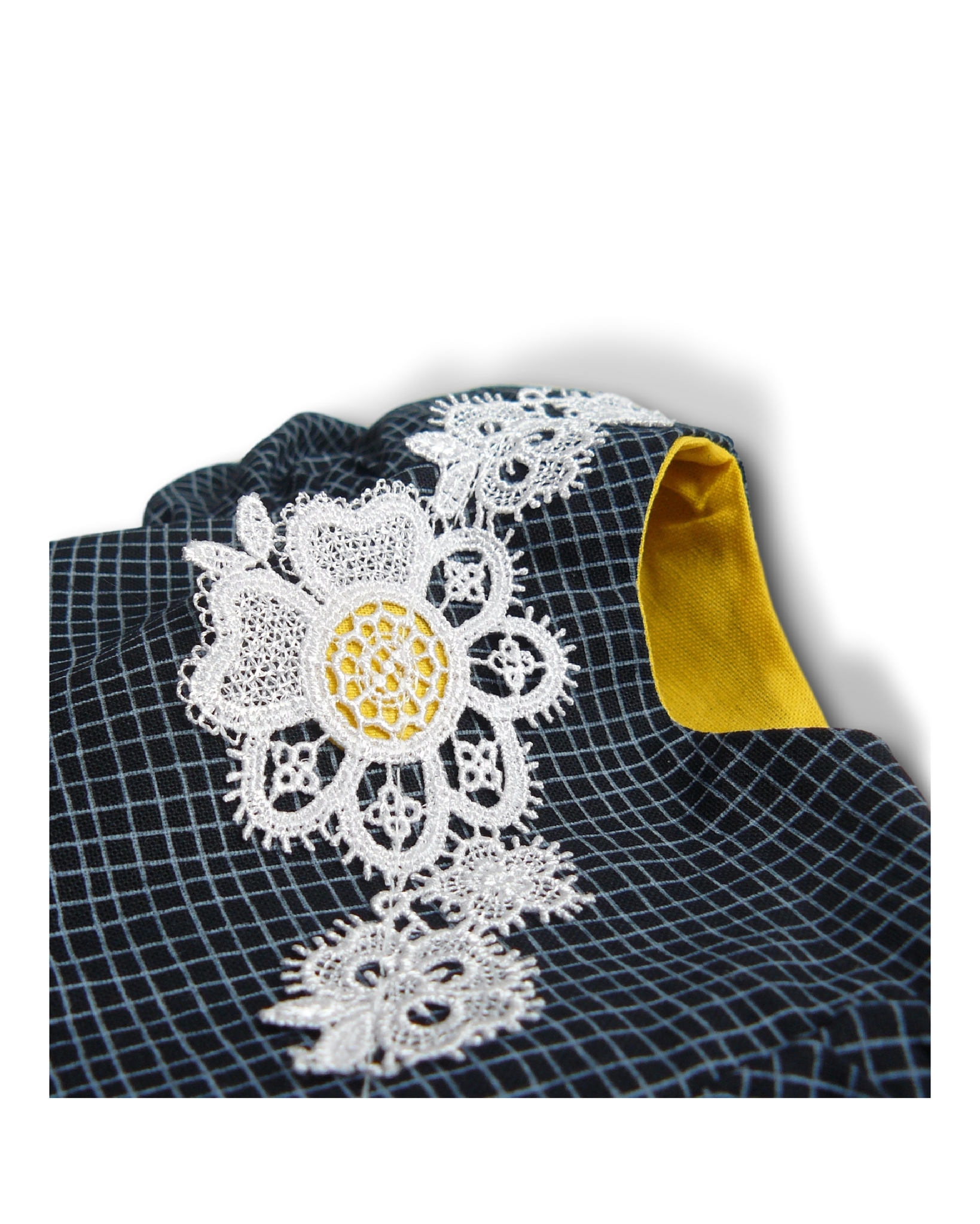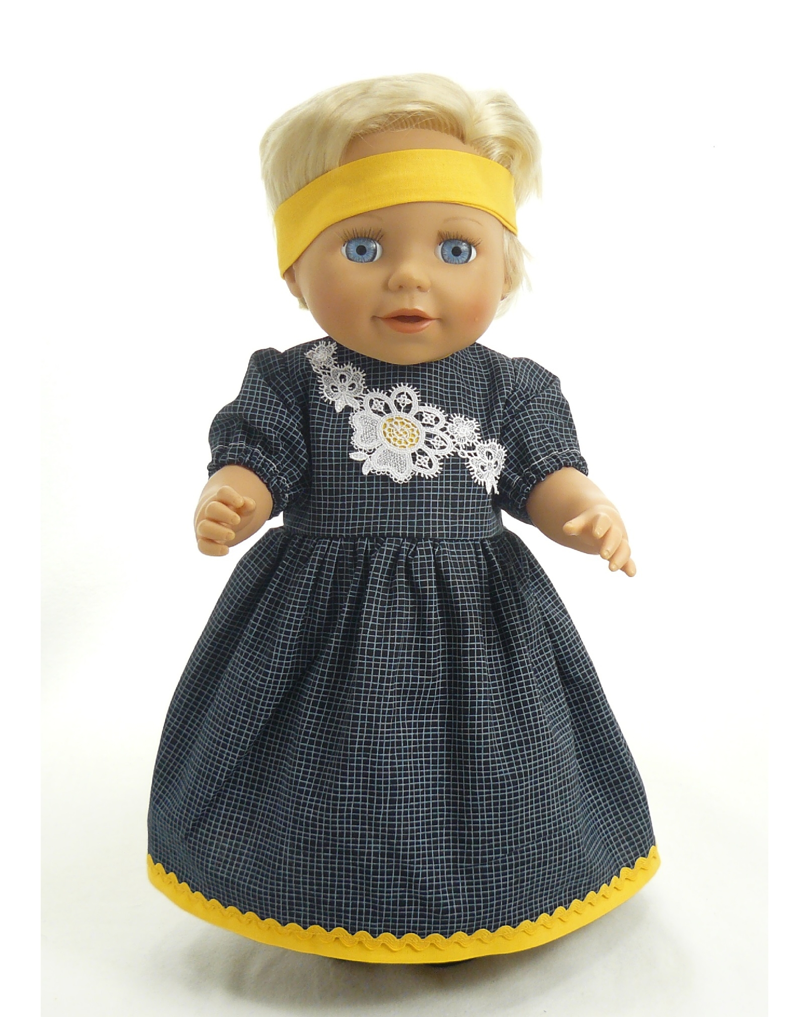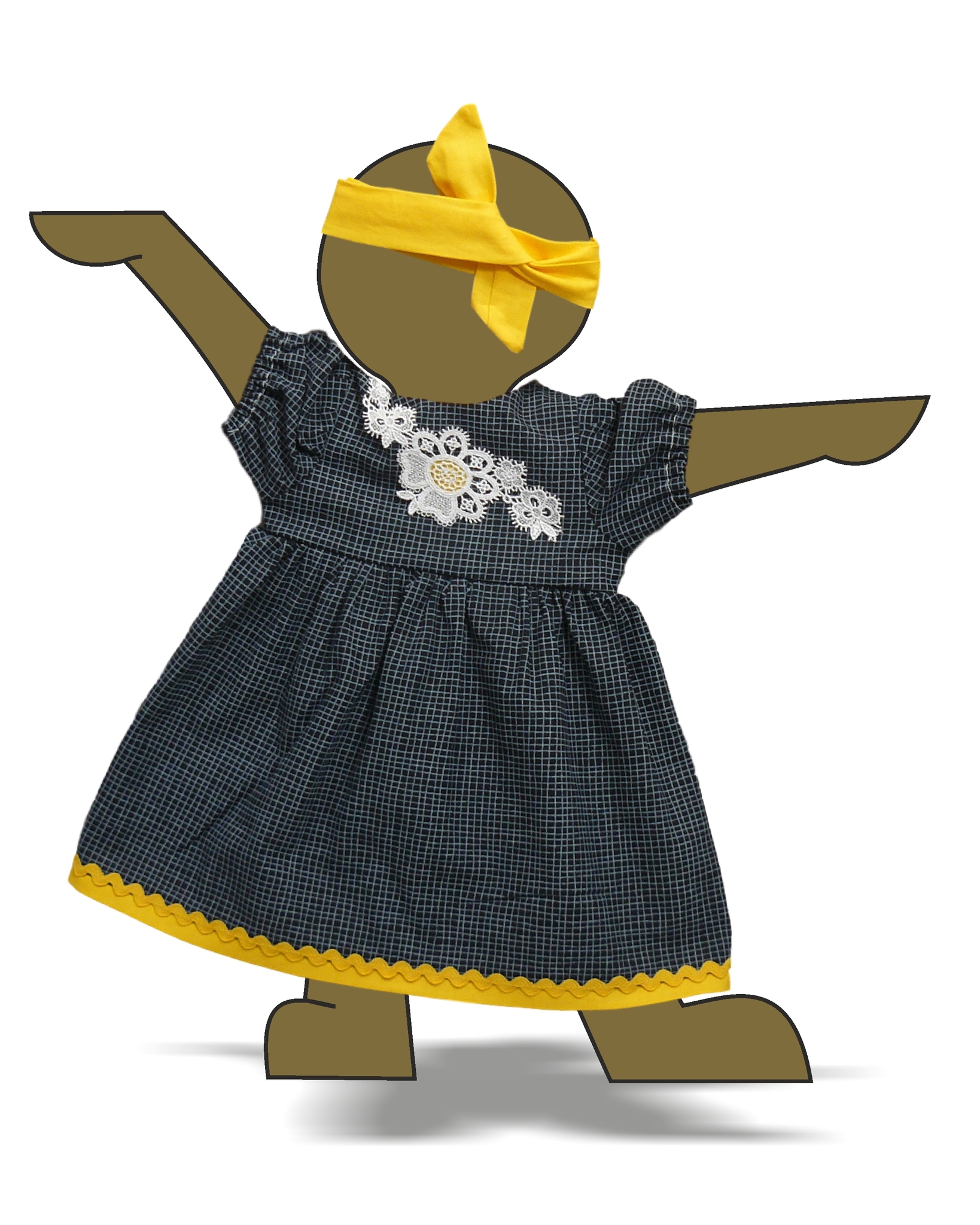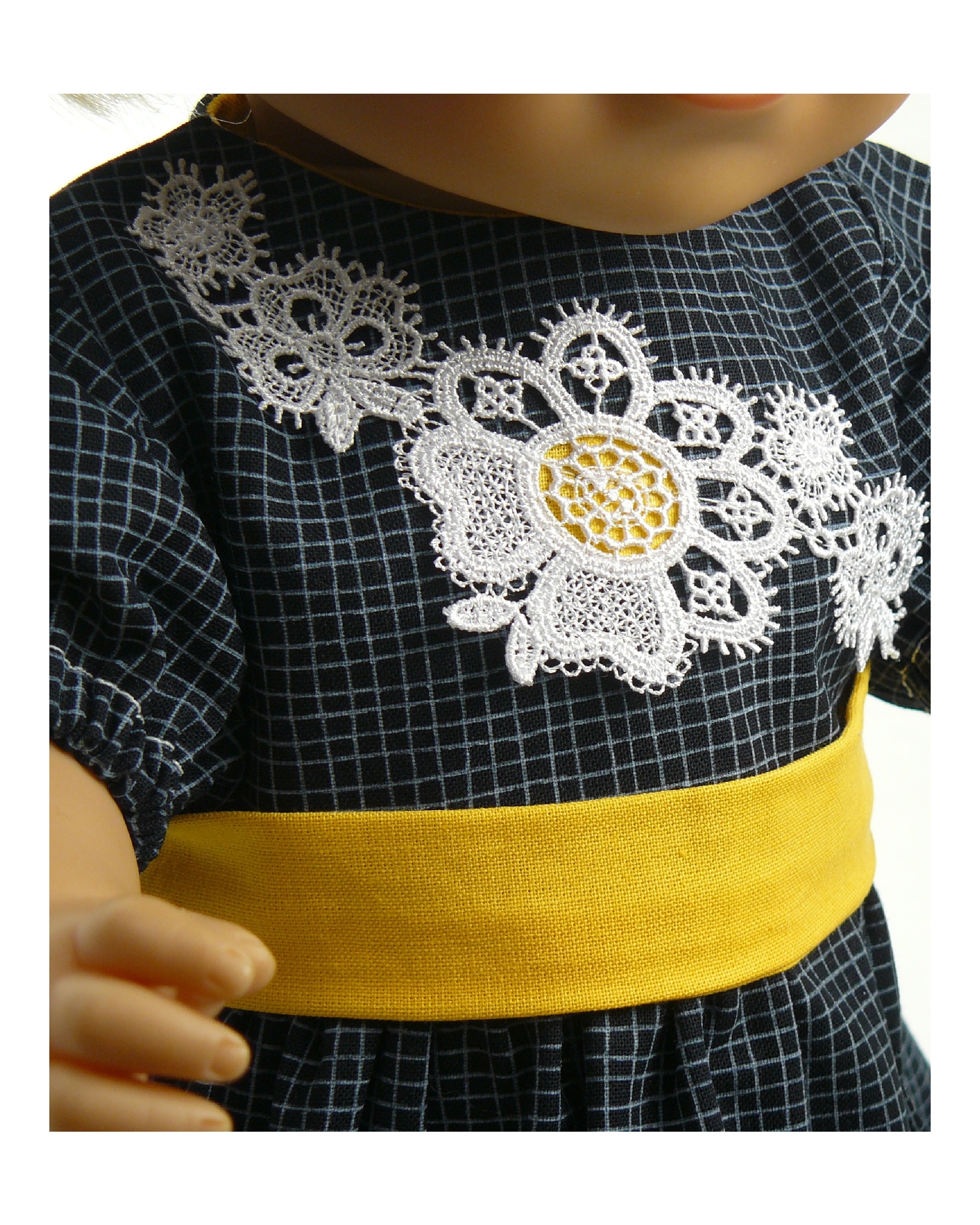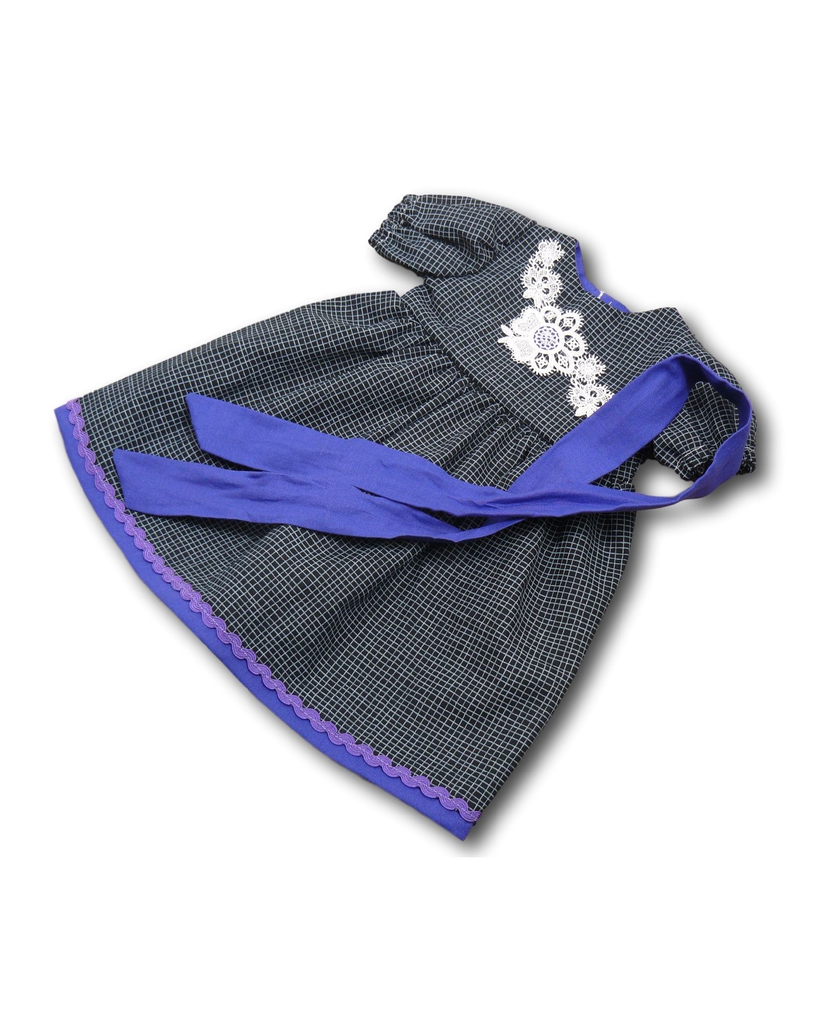 Платье на кокетке изготовлено из хлопчато-бумажной ткани . Подкройная часть кокетки , кайма снизу и пояс изготовлены из ткани, контрастной по цвету. Украшением служит аппликация из ажурного вязаного кружева. Глубокая застежка сзади на две кнопки обеспечивает комфортную эксплуатацию изделия. Пояс можно использовать в качестве полоски на голову.