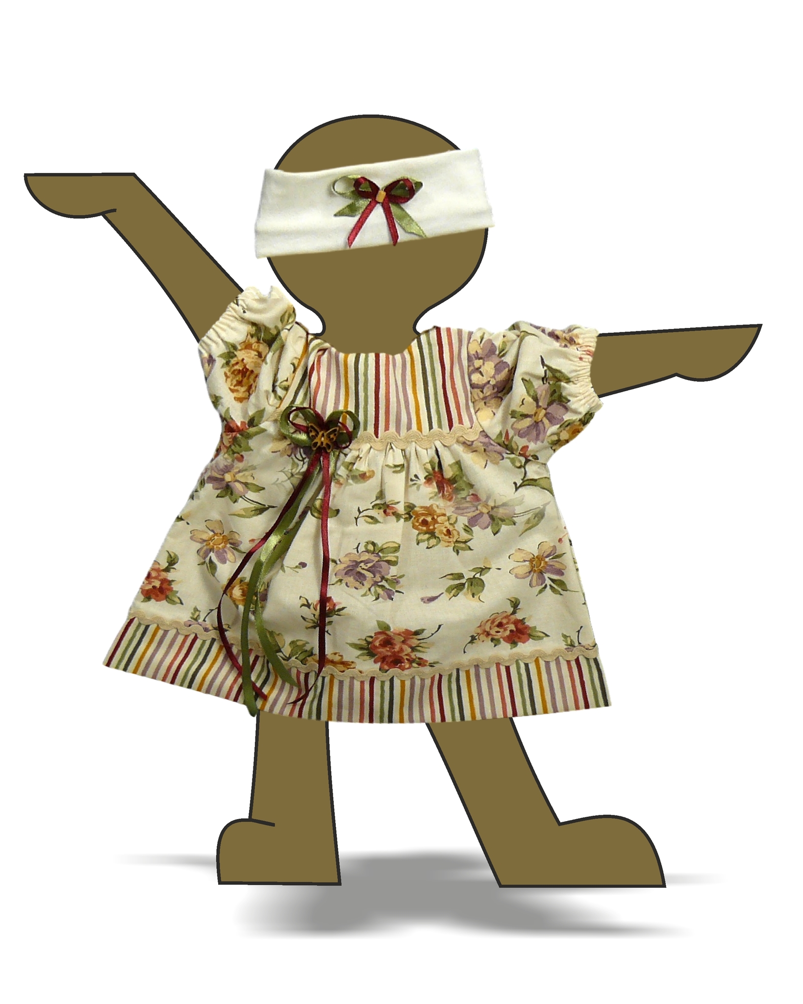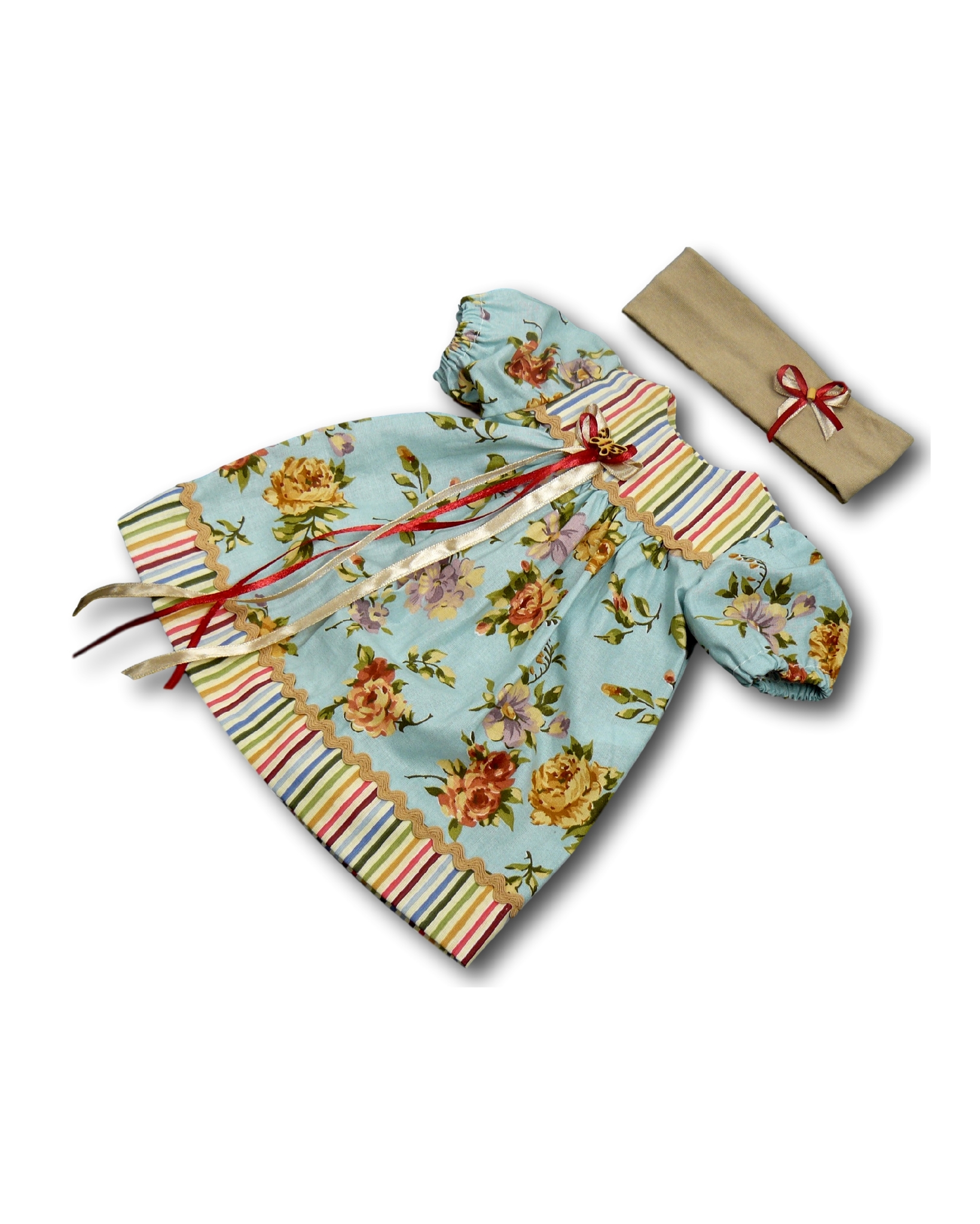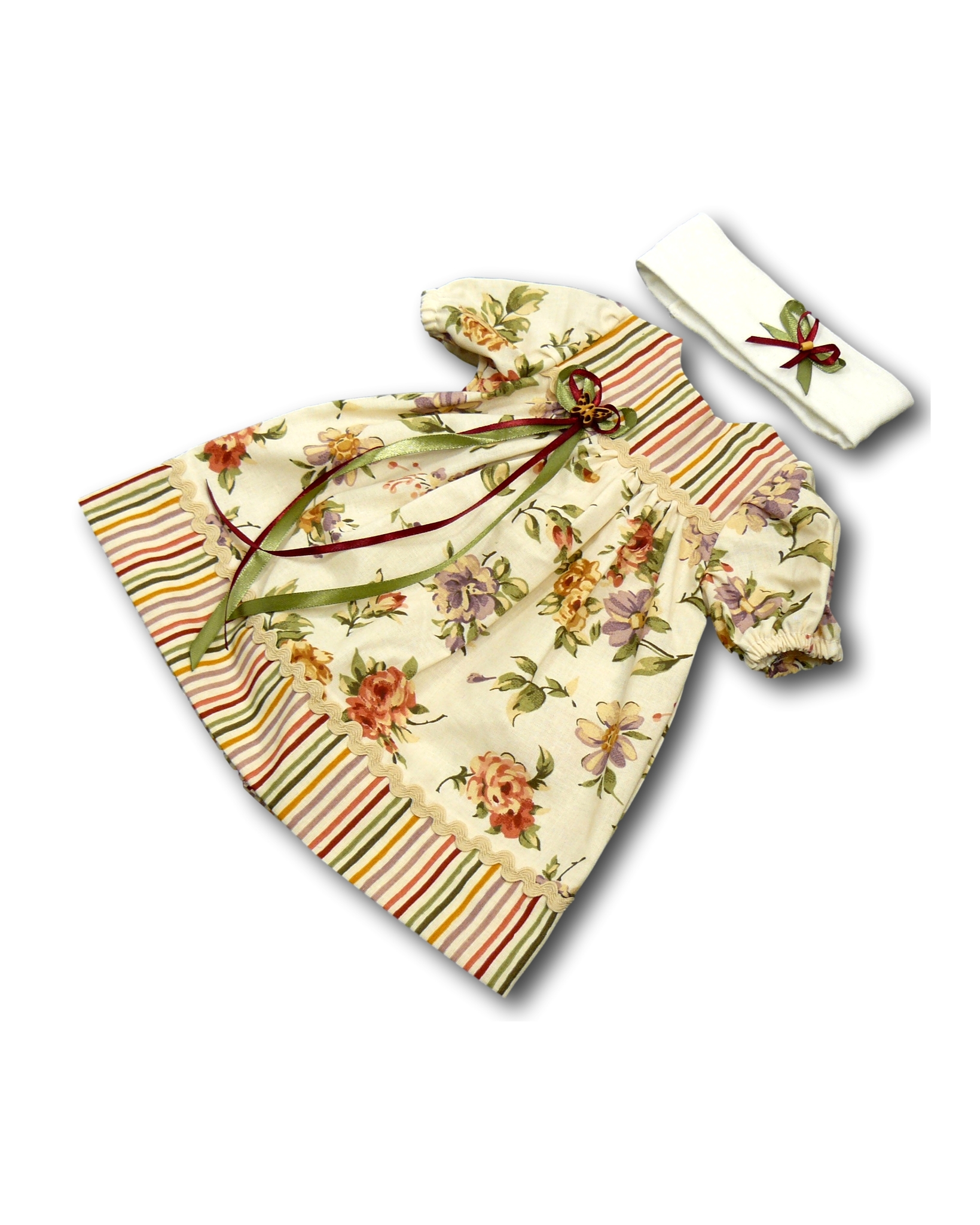 Платье расклешенного силуэта на кокетке. Изготовлено из нежной перкали. Тщательно подобранные ткани-компаньоны делают его изысканным и оригинальным. В качестве отделки использованы тесьма - вьюнчик и нарядные шелковые ленты, закрепленные фурнитурой из натуралього дерева. Глубокая застежка - липучка сзади облегчает эксплуатацию изделия. Завершает образ полоска на голову из трикотажного полотна.