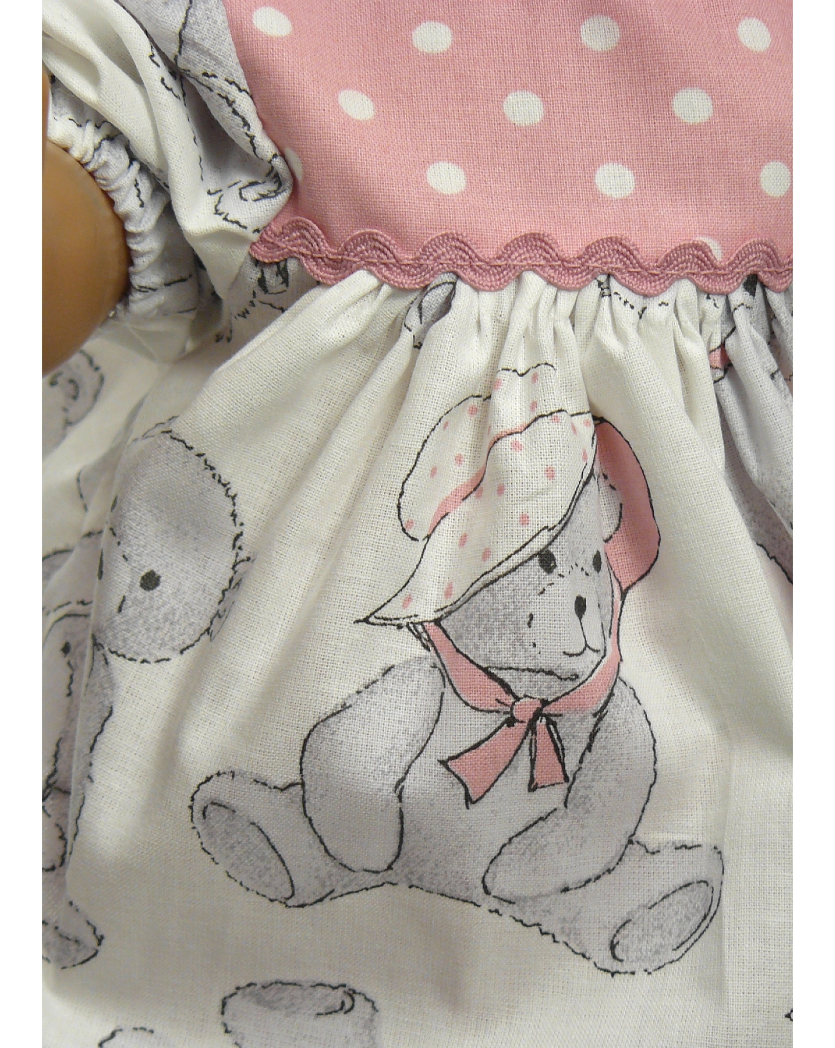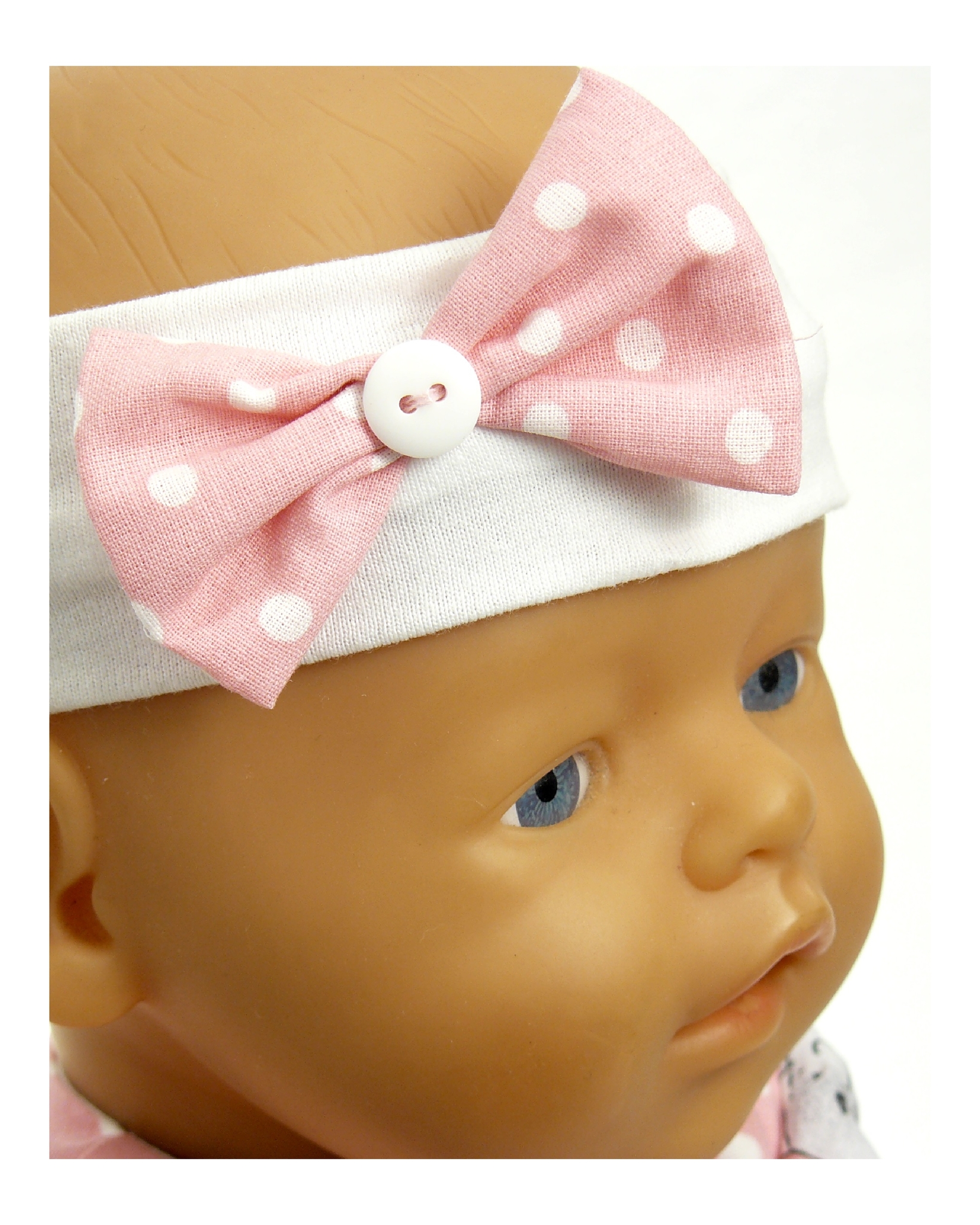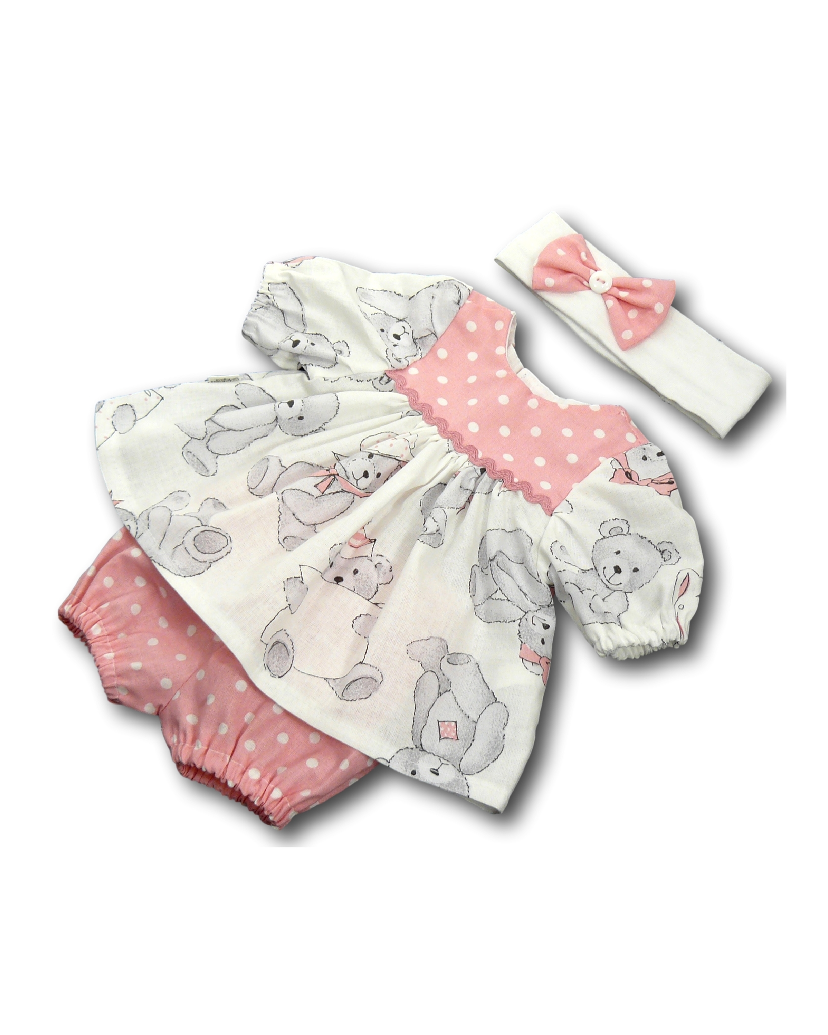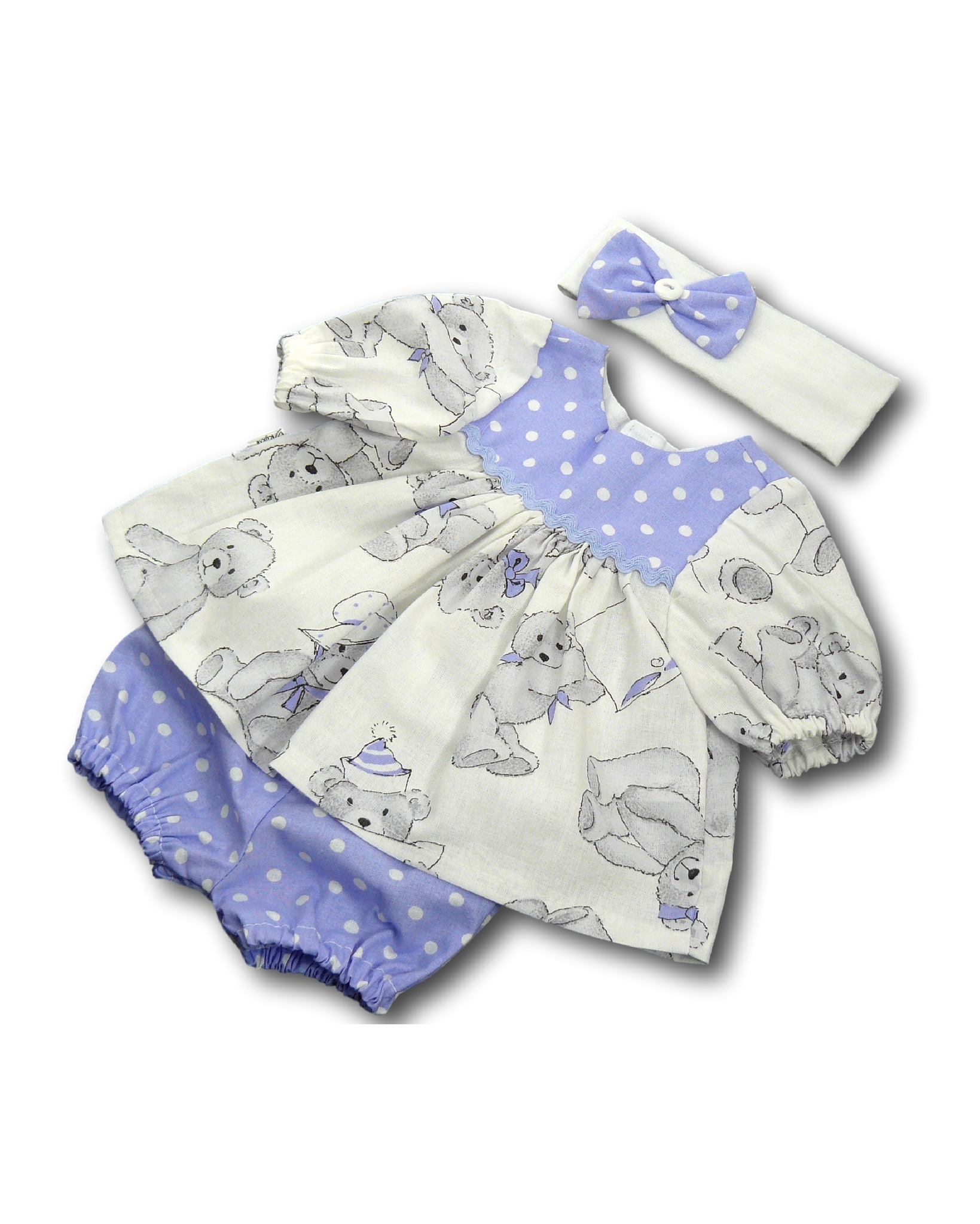 Малышковый комплект изготовлен из нежной х/б перкали. Ткани-компаньоны прекрасно дополняют друг друга. Укороченное платье с двойной выворотной кокеткой имеет сзади глубокую застежку - липучку. Трусы-фонарики из ткани в горошек на резинке. Дополнением служит полоска на голову из х/б трикотажа, украшенная бантом.