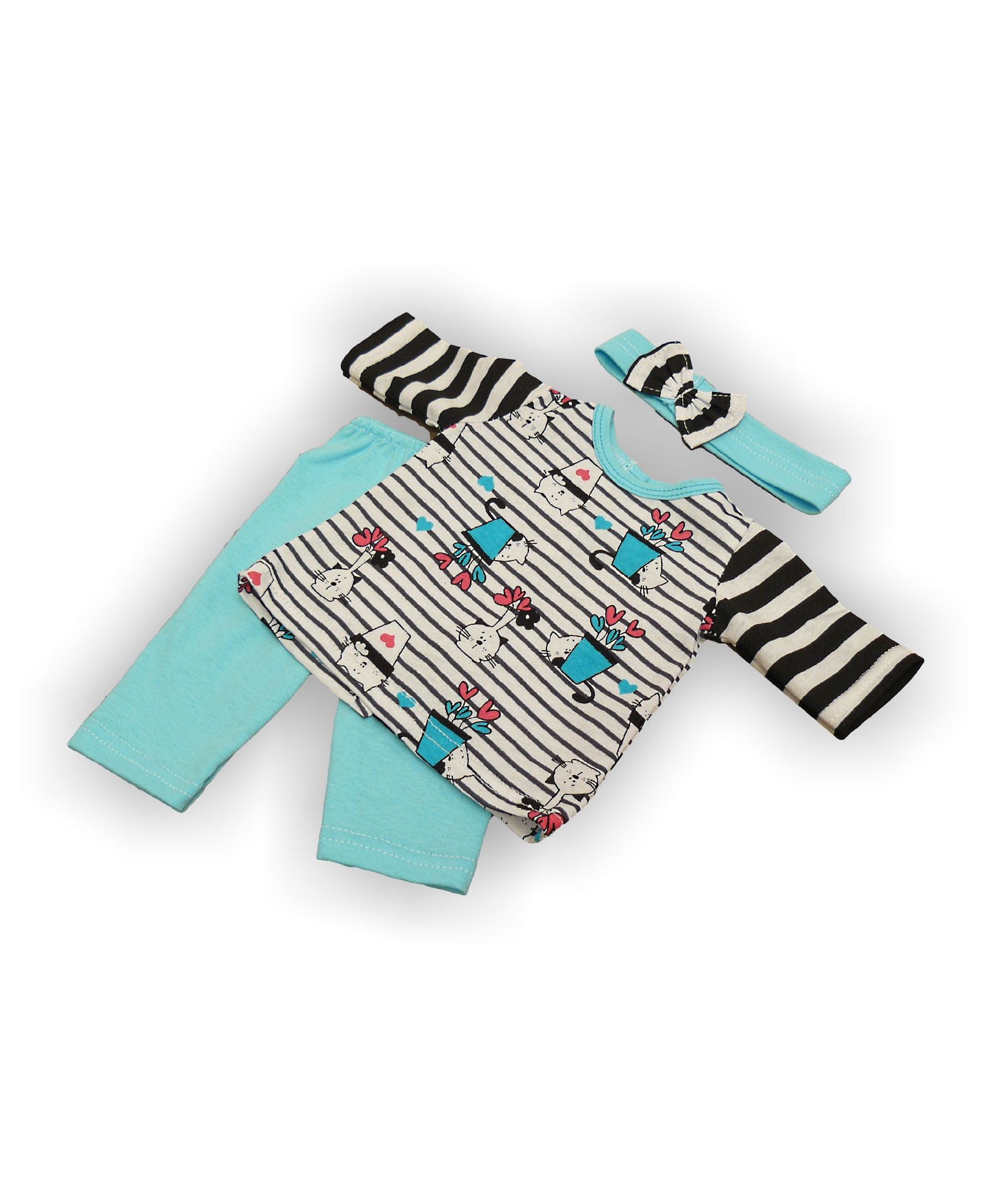 Туника, расклешенного силуэта, выполнена из х/б трикотажного полотна. Она скомбинирована из тканей трех расцветок, сочетающихся друг с другом. Для удобства эксплуатации изделие распашное с застежкой сзади на трикотажные кнопки. Штаны свободного покроя на резинке. Полоска на голову с бантом из ткани- компаньона дополняет комплект. Комплект можно использовать как домашний костюм, пижаму или летний прогулочный наряд.