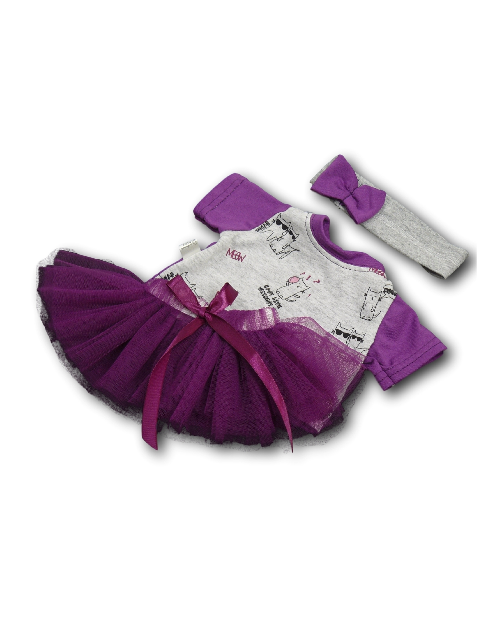Комплект состоит из трех предметов: Футболка, юбка и полоска на голову.