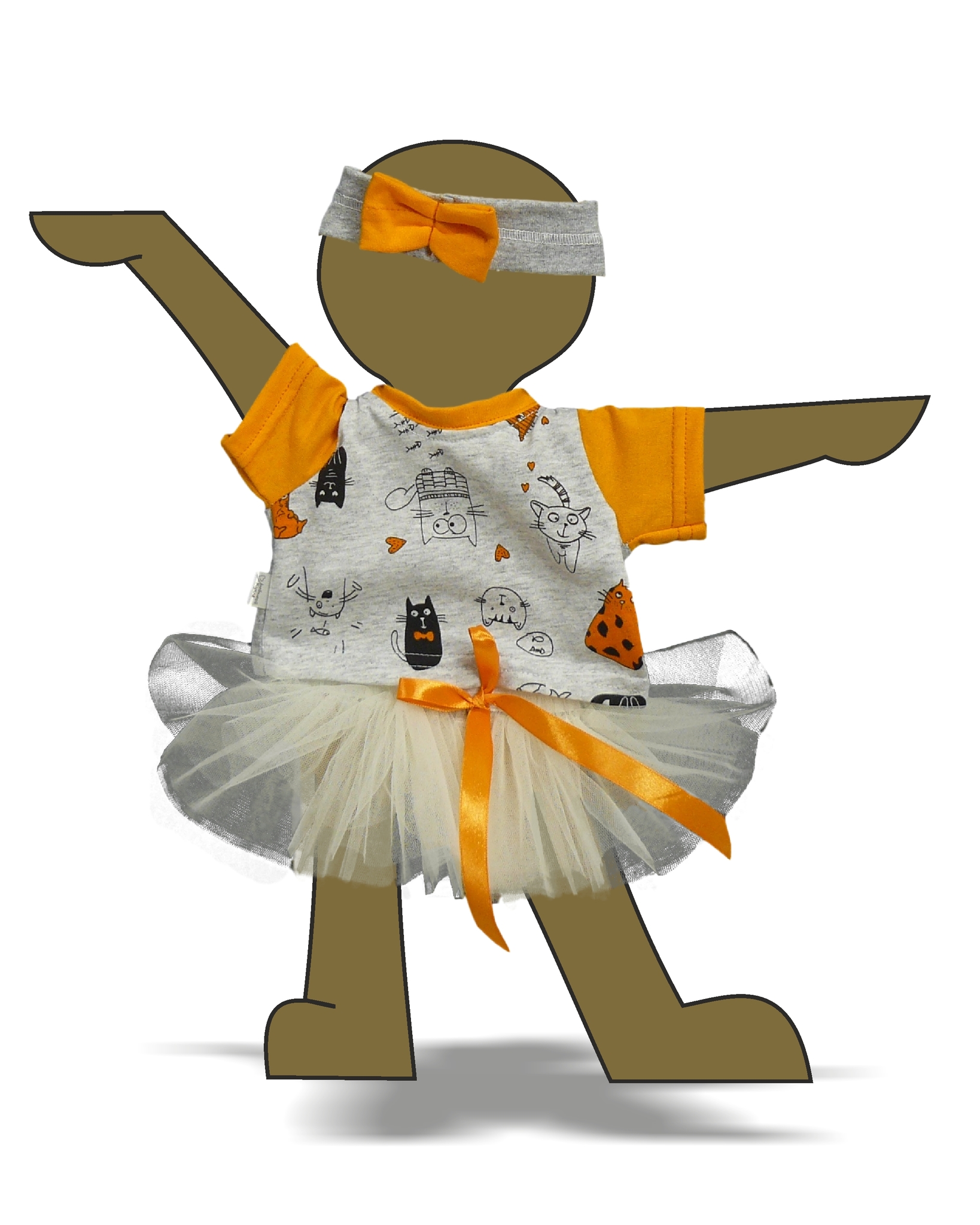 Комплект изготвлен из хлопчато-бумажного трикотажного полотна и тонкой нейлоновой сетки. Футболка скомбинирована из двух тканей компаньонов. Изделие распашное с застежкой-липучкой сзади. Многослойная юбка - из мягкой нейлоновой сетки - фатина на поясе из широкой резинки. Юбка украшена бантом из яркой атласной ленты. Дополнением комплекта служит полоска на голову.