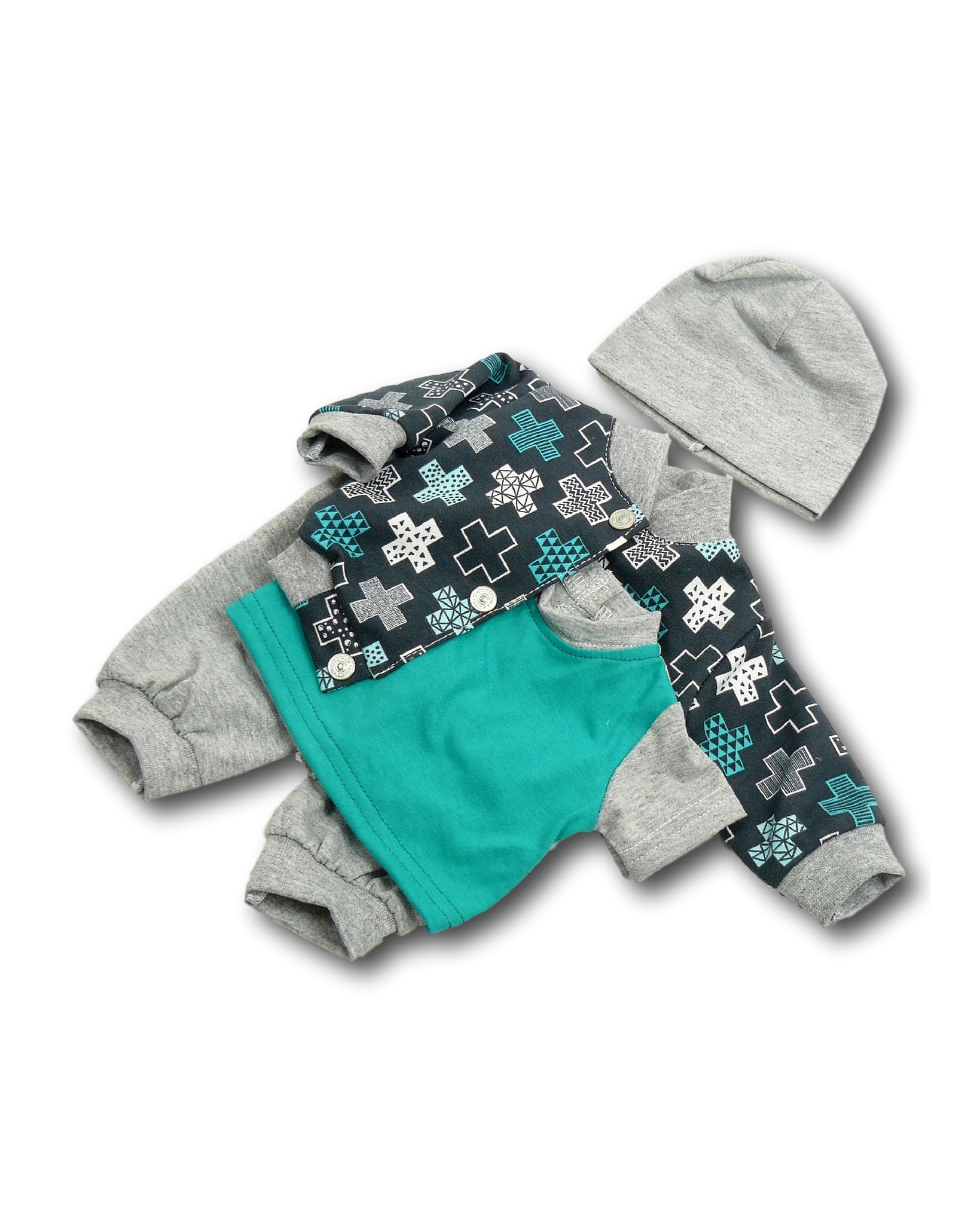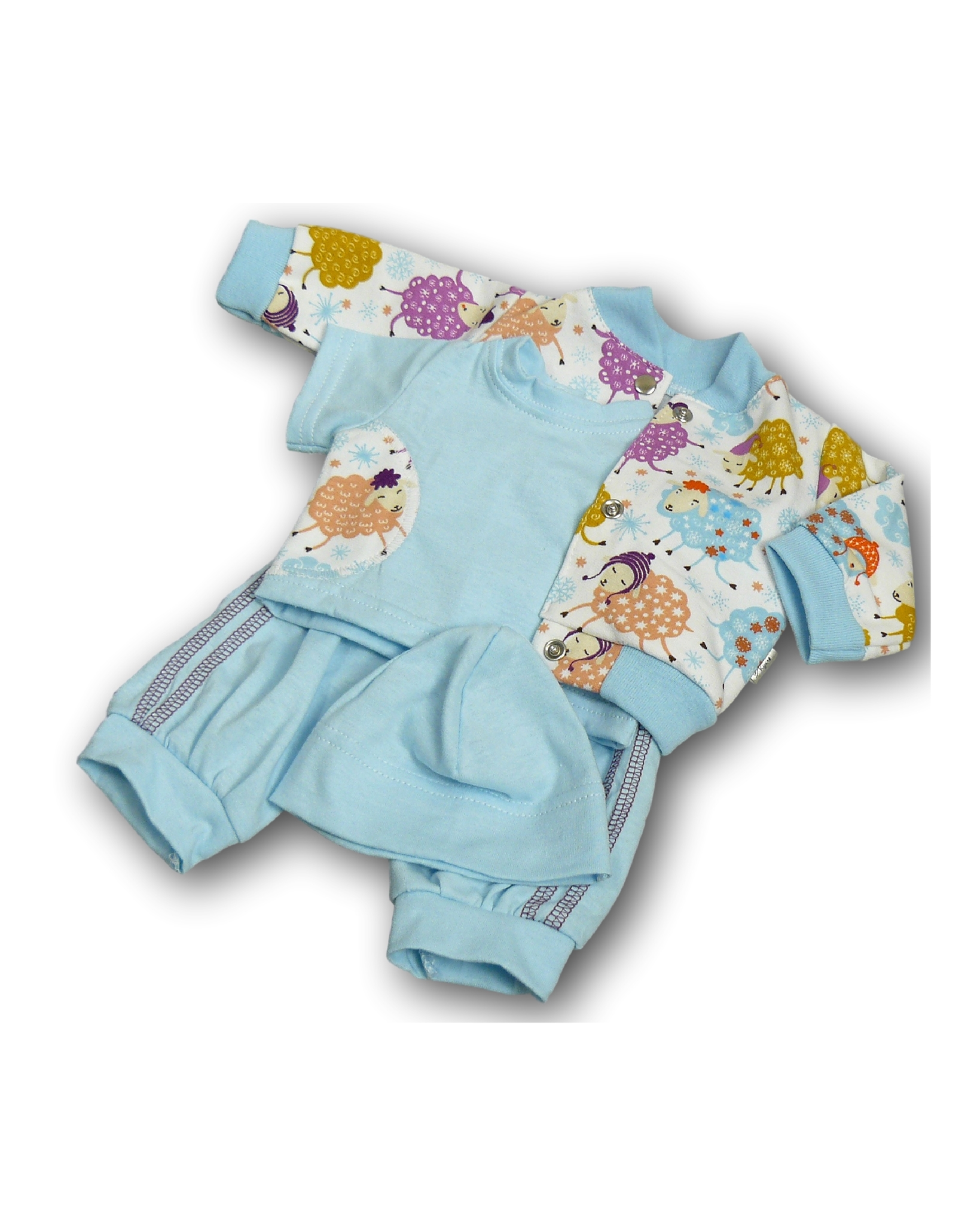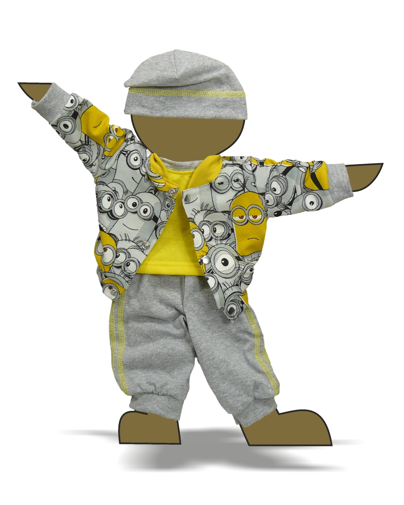 Куртка-бомбер изготовлена из плотной трикотажной ткани футер-петля. Характерные детали куртки - воротник, манжеты и пояс изготовлены из рибаны - трикотажа с эффектом резинки. Застежка - три кнопки с декоративными головками. Футболка, брюки свободного покроя и шапочка выполнены из тонкой трикотажной ткани - кулирки. Футболка двухцветная с застежкой-липучкой сзади. Брюки на поясе, усиленном резинкой. Низ брюк заканчивается манжетами, по бокам - декоративные строчки-лампасы. Шапка имеет глубокую посадку и так же декорирована строчкой.
