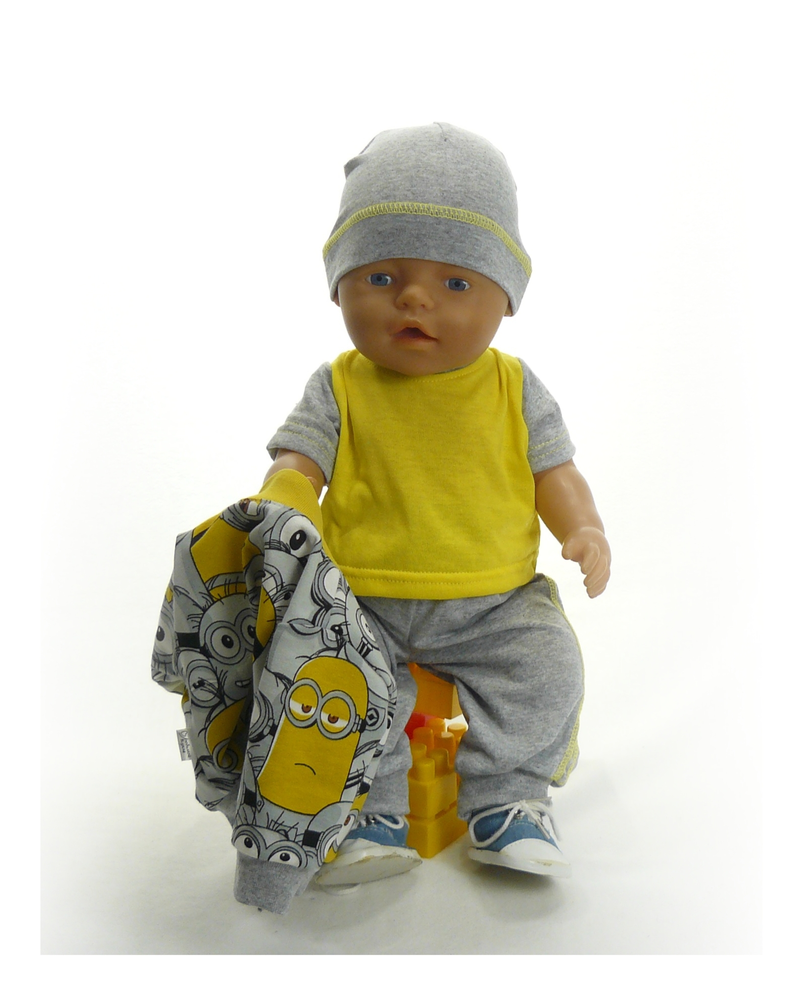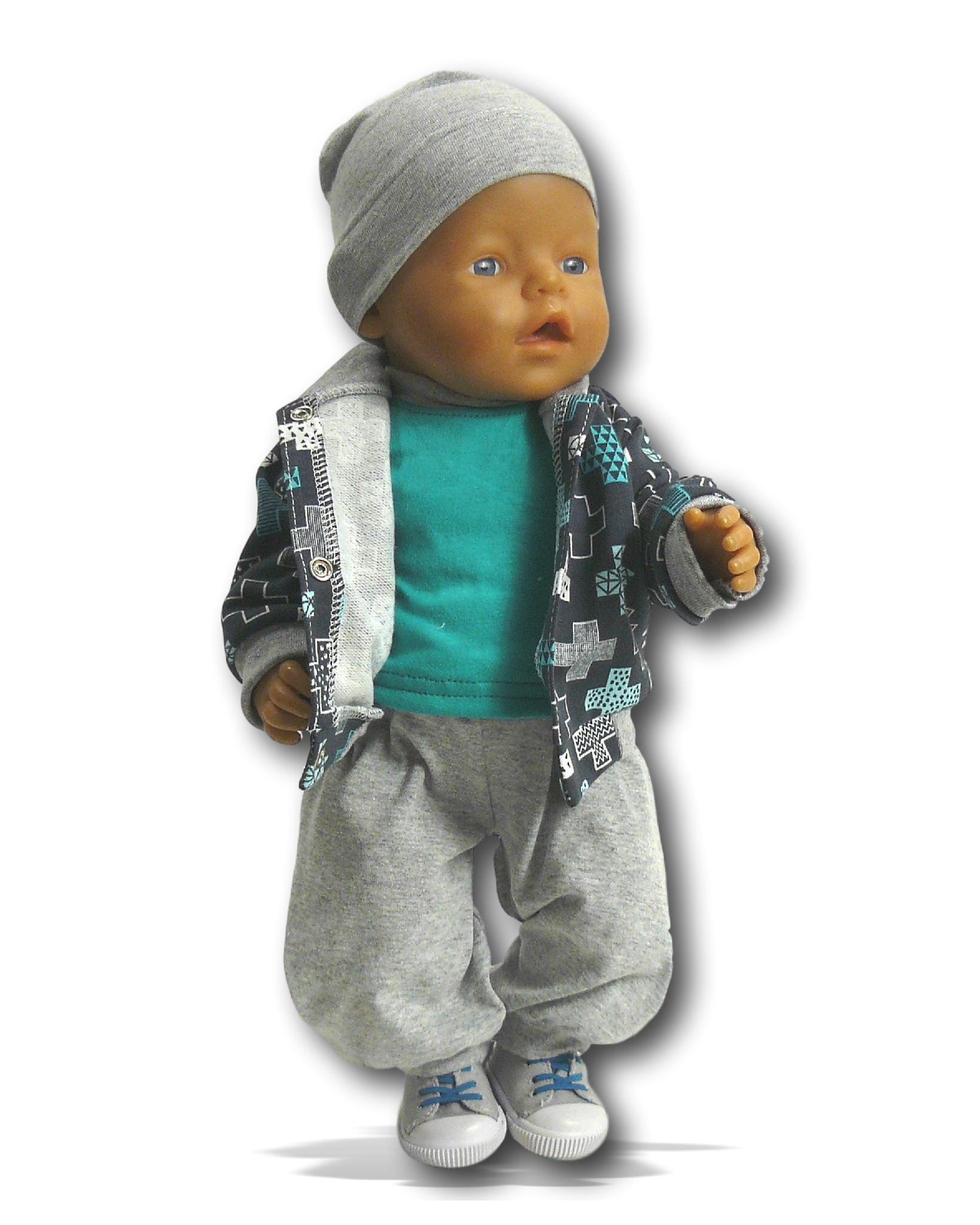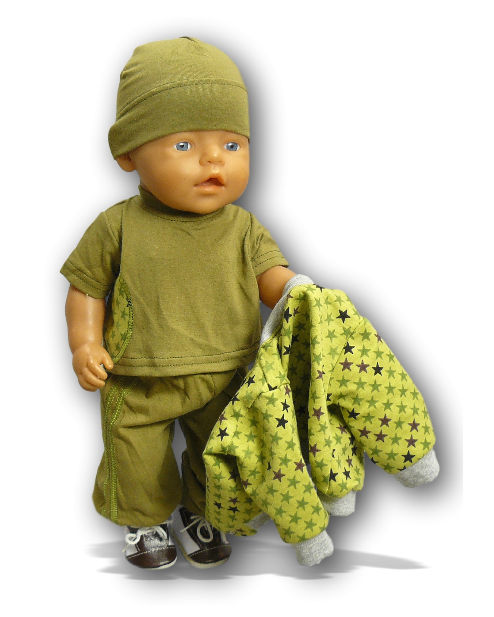 Куртка-бомбер изготовлена из плотной трикотажной ткани футер-петля. Характерные детали куртки - воротник, манжеты и пояс изготовлены из рибаны - трикотажа с эффектом резинки. Застежка - три кнопки с декоративными головками. Футболка, брюки свободного покроя и шапочка выполнены из тонкой трикотажной ткани - кулирки. Футболка двухцветная с застежкой-липучкой сзади. Брюки на поясе, усиленном резинкой. Низ брюк заканчивается манжетами, по бокам - декоративные строчки-лампасы. Шапка имеет глубокую посадку и так же декорирована строчкой.