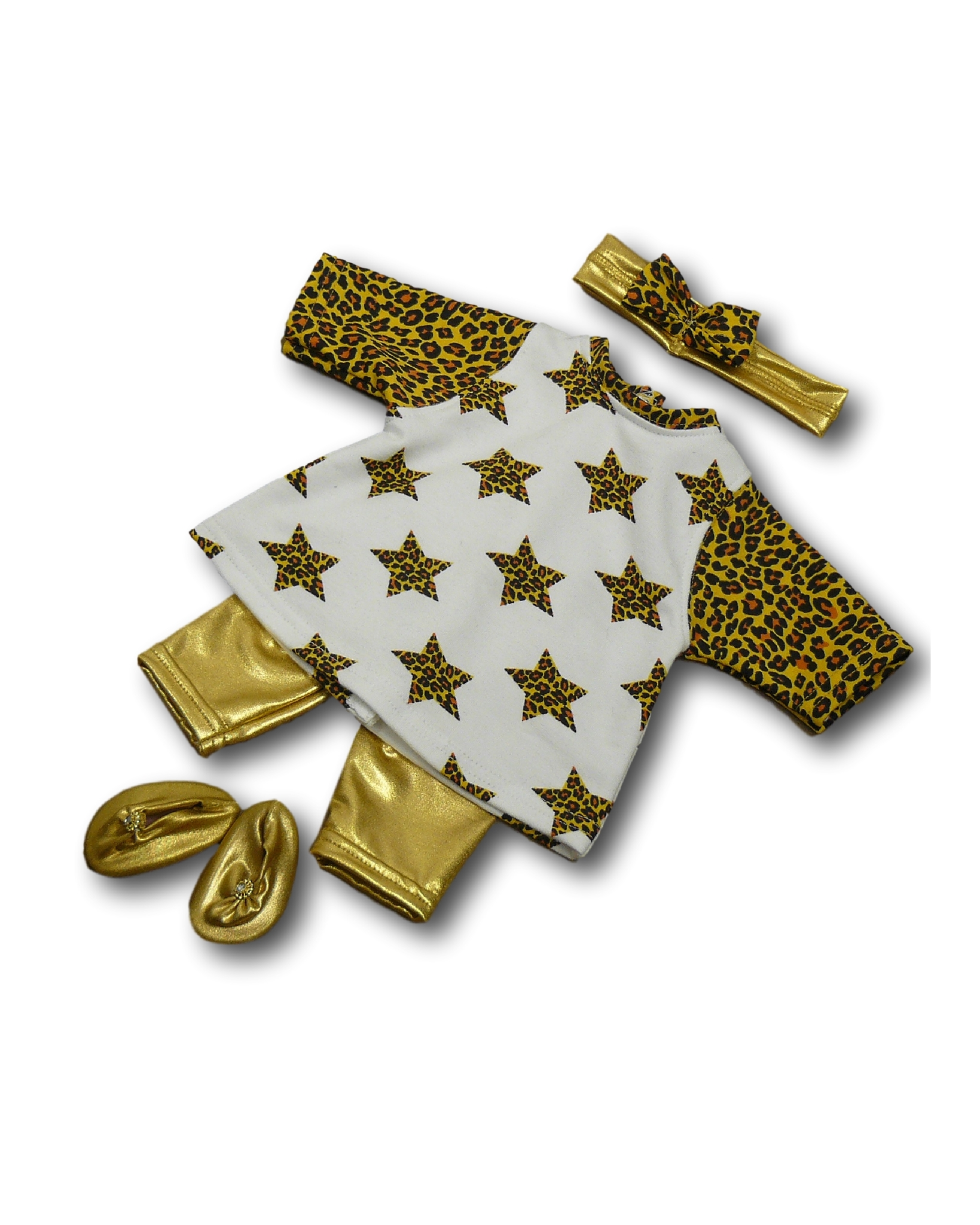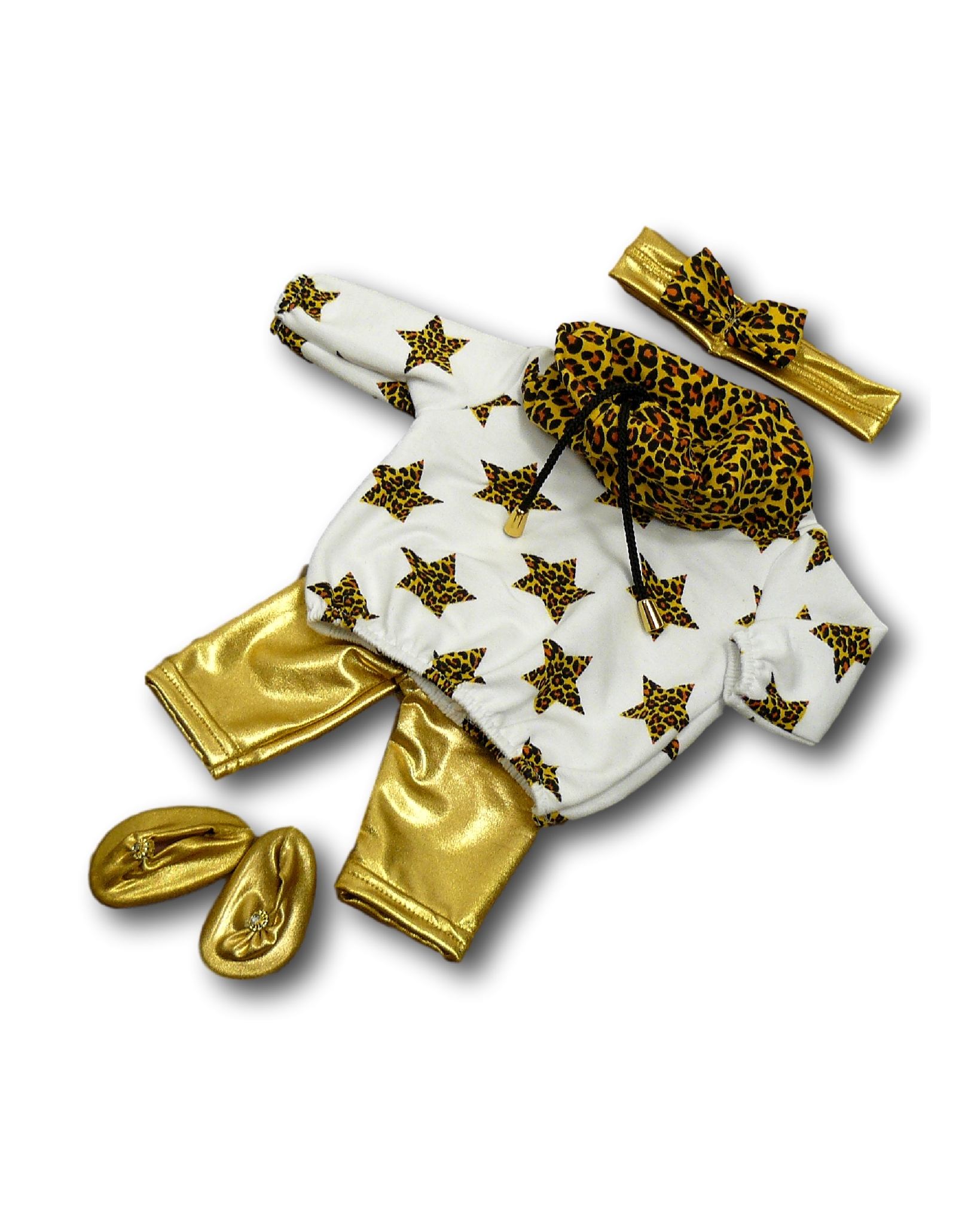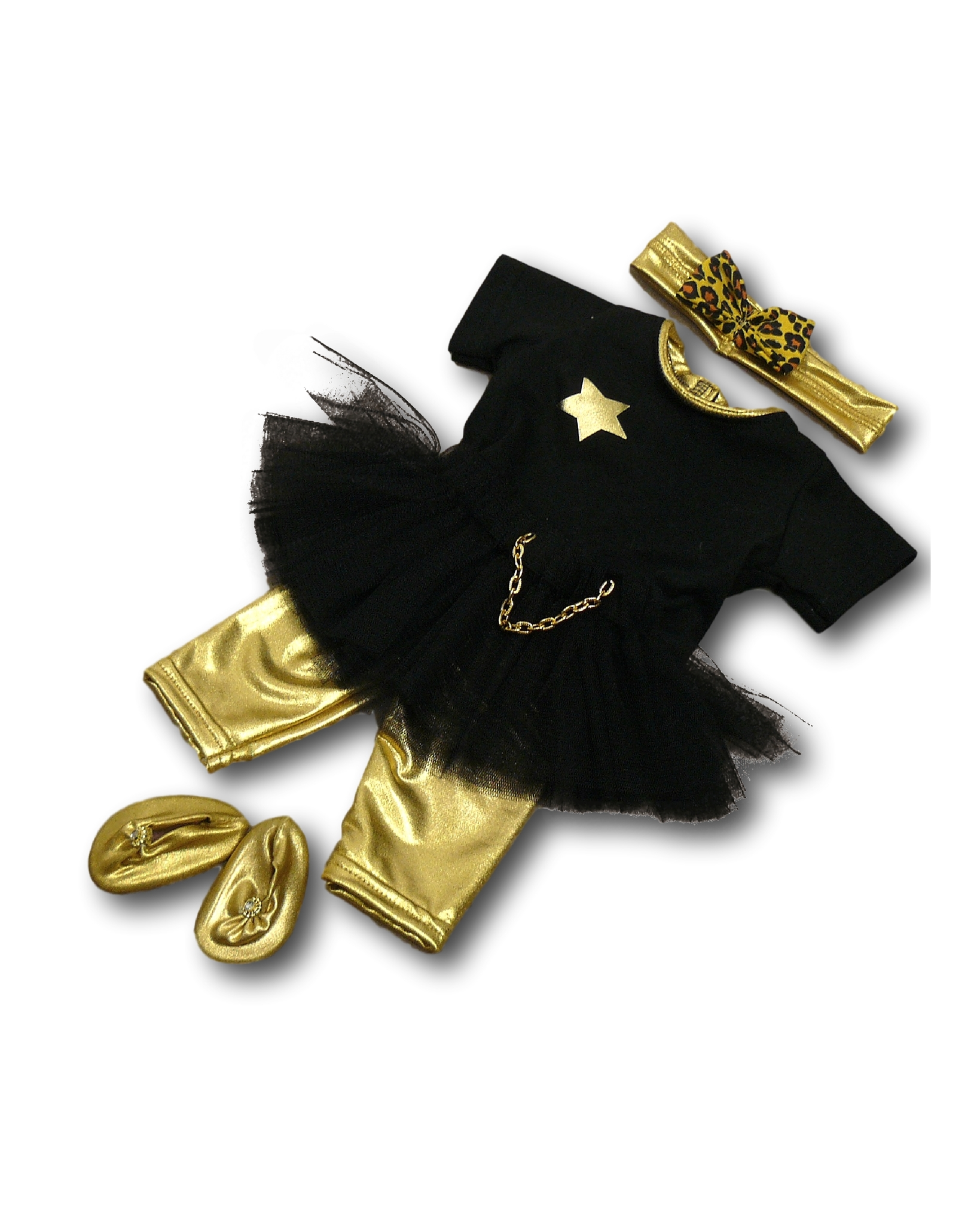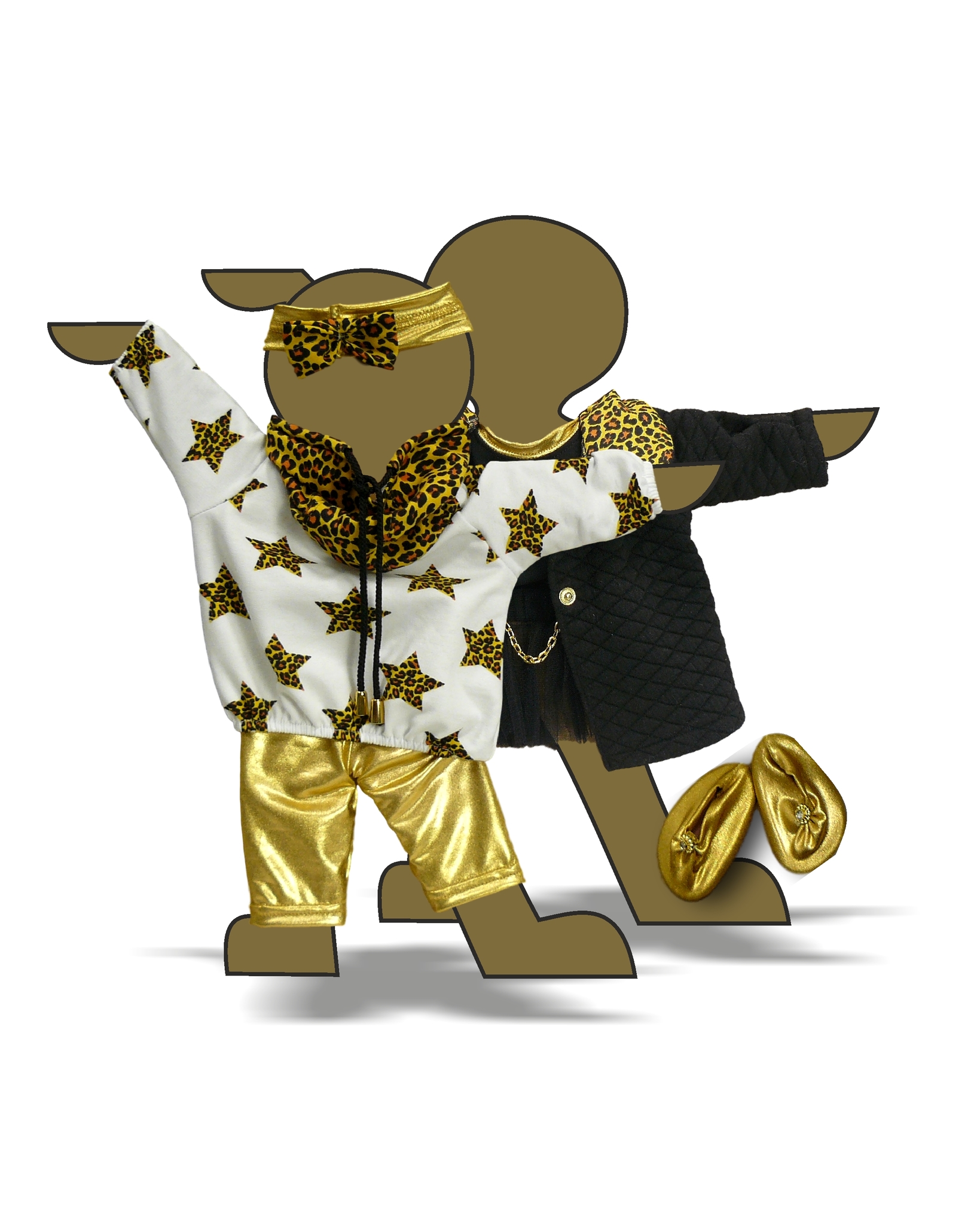 Большой подарочный комплект составлен из предметов разного назначения, которые можно сочетать между собой в разных вариантах. Все изделия созданы в единой цветовой гамме и стилистике. Пальто, расклешенного силуэта с отложным воротником из капитоне глубокого черного цвета. Воротник и бант-хлястик сзади - из отделочной трикотажной ткани с принтом. Золотые кнопки служат украшением пальто и поддерживают общую стилистику комплекта. Платье удобной конструкции изготовлено из тонкого футера двунитки-петля. Ткани-компаньоны удачно дополняют друг друга. Глубокая застежка-липучка сзади облегчает эксплуатацию изделия. Свитшот - модный и удобный вид одежды. Конструкция горловины позволяет надевать изделие без дополнительной застежки. Воротник-хомут с утяжкой является оригинальным украшением. Рукава и низ изделия припосажены на резинки. Футболка из х/б трикотажа отделана декоративной обтачкой ворота и яркой термотрансферной наклейкой. Изделие распашное с застежкой-липучкой сзади. Многослойная юбка из фатина на резинке украшена золотой цепочкой. Укороченные лосины выполнены из эластичной стрейчевой ткани с прочным напылением. Из этой же ткани изготовлена полоска на голову. Важным дополнением являются туфли-балетки так же с золотым напылением. Подошва сделана из плотного фетра, который легко принимает сложную форму ноги. Из этих предметов можно составить множество костюмов различного назначения, что сделает игру с куклой особенно увлекательной.