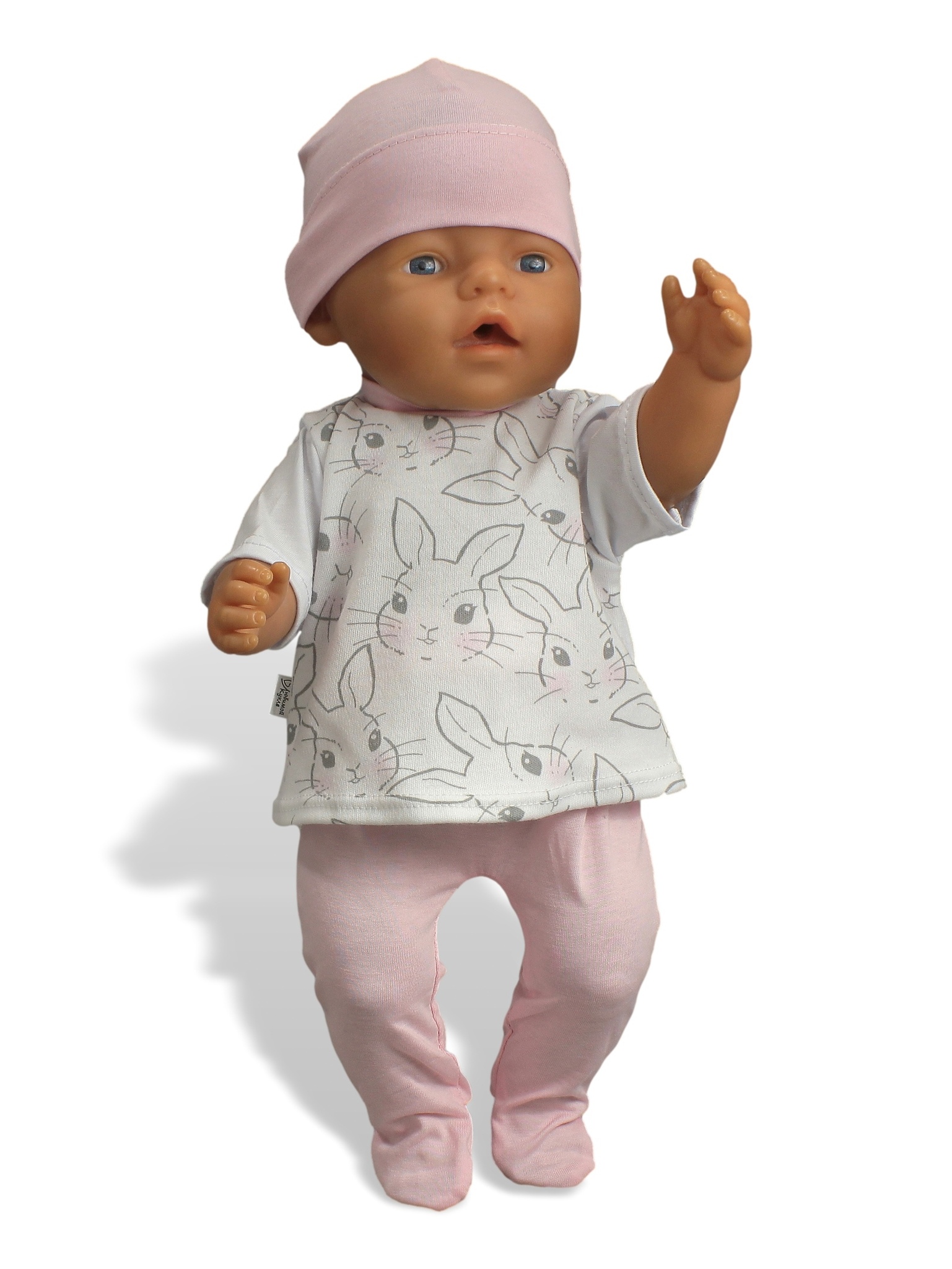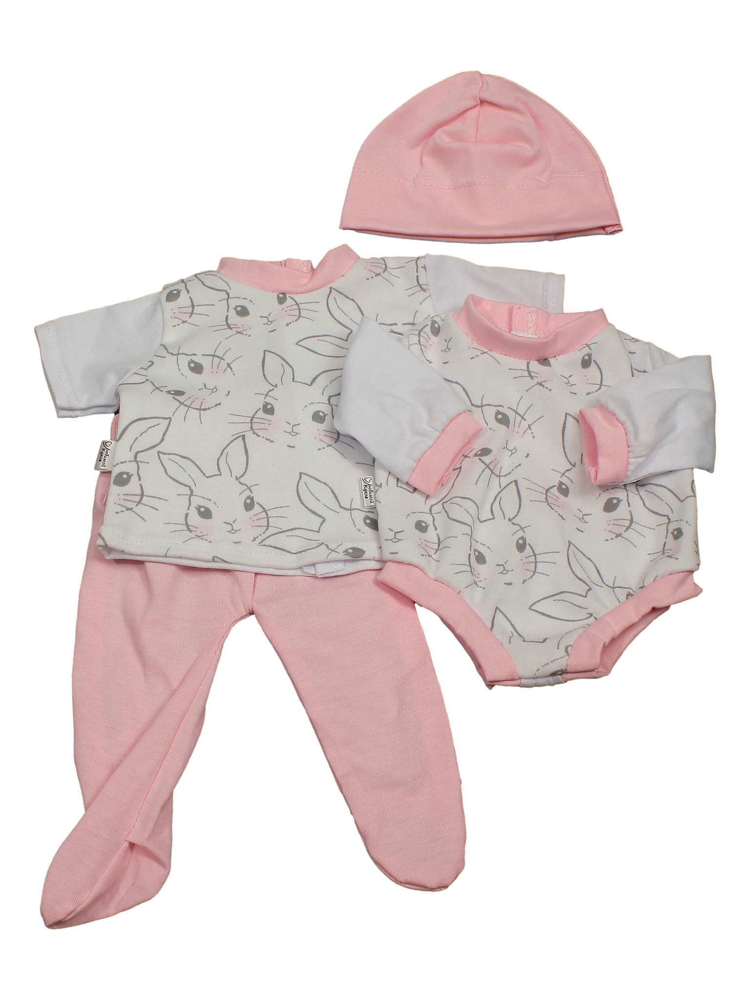 Боди изготовлен их трикотажного полотна с детским принтом. Для удобства надевания на спинке застежка-липучка. Футболка также имеет застежку на спинке. Ползунки максимально реалистично повторяют образ малышковой одежды (широкий пояс усилен резинкой,оформленная пяточка). Дополняет комплект шапочка из трикотажа глубокой посадки. С помощью этих предметов можно создать несколько вариантов костюмов для разных случаев. Все предметы можно использовать отдельно для формирования других комплектов одежды.