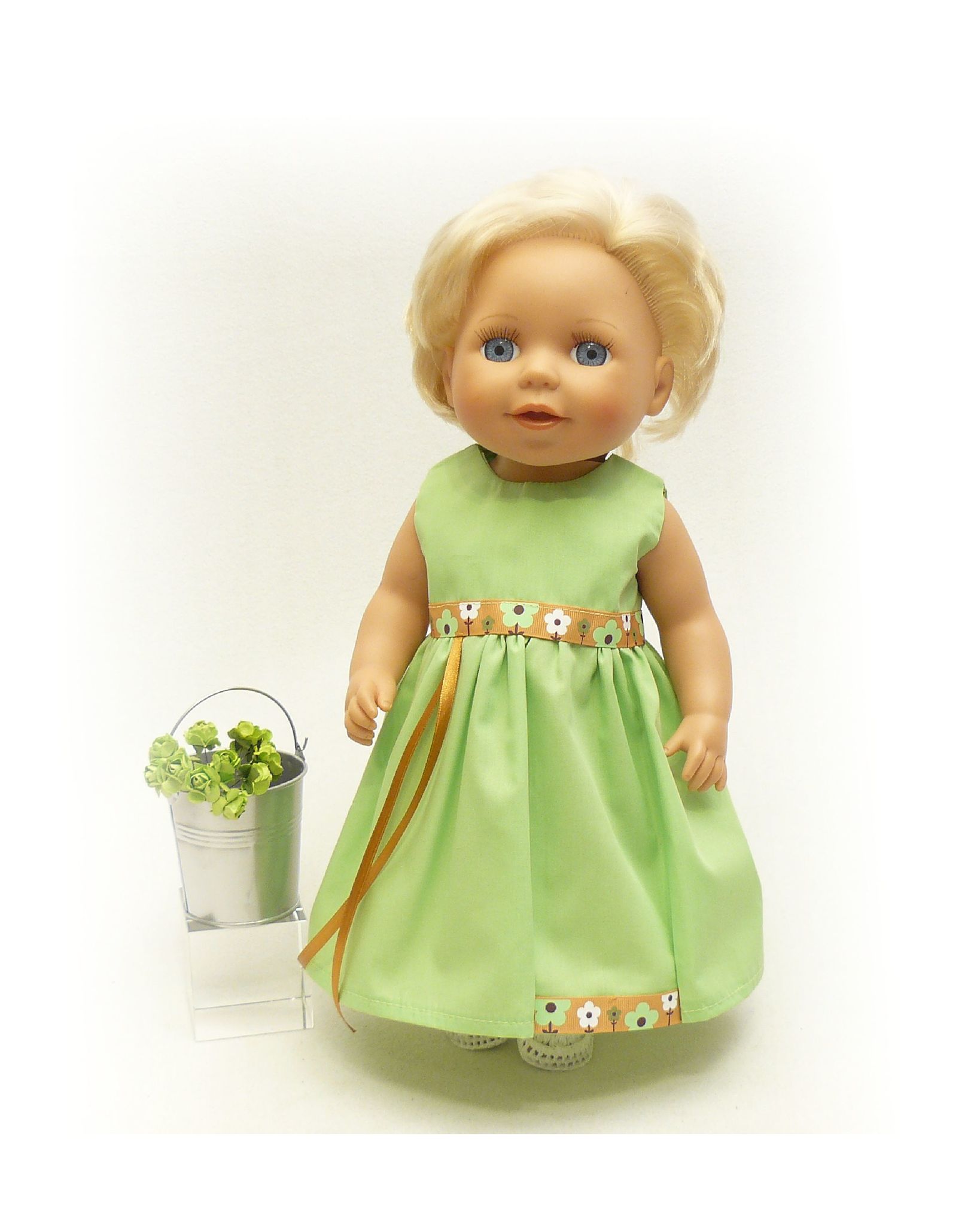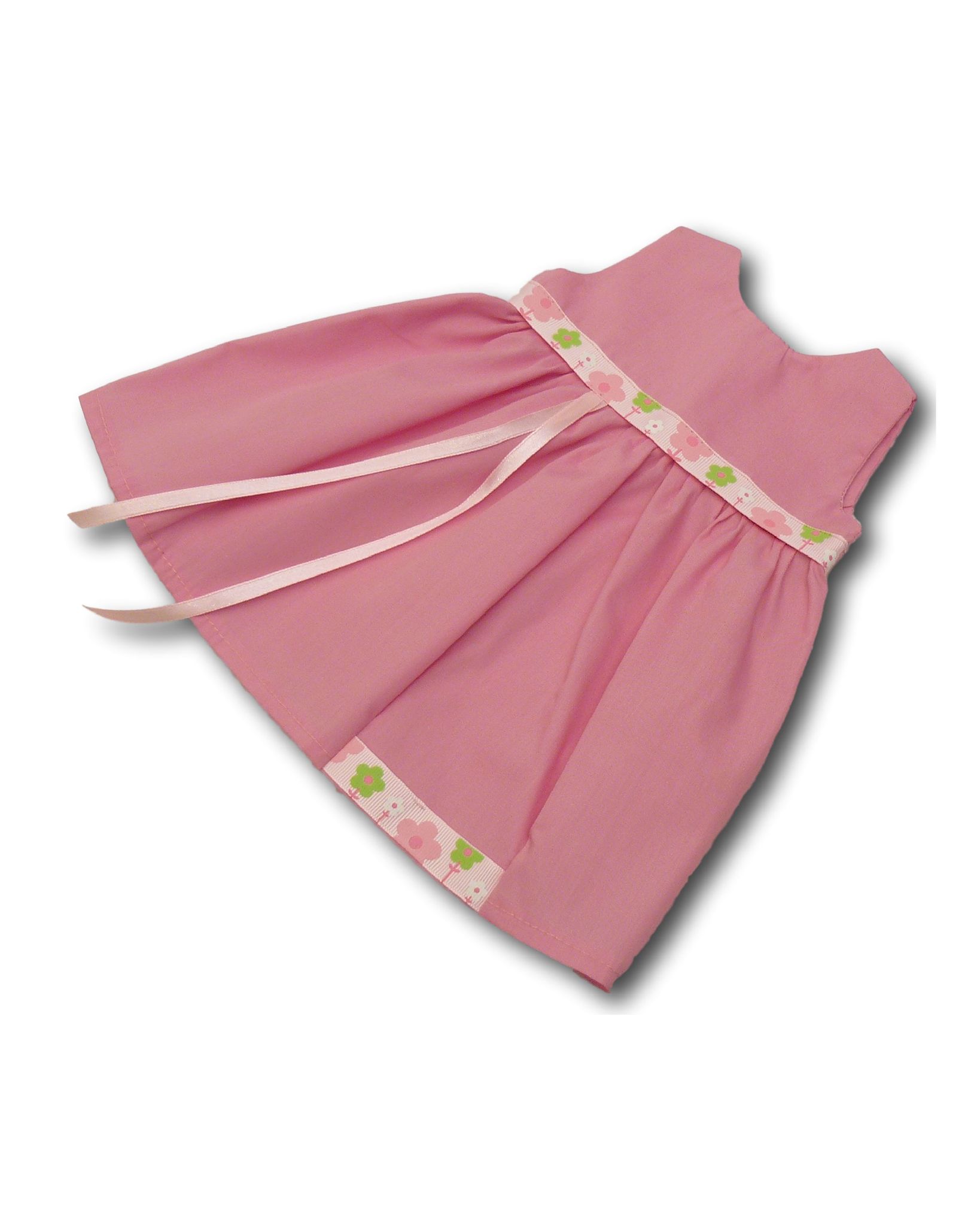 Платье на кокетке изготовлено из однотонной смесовой ткани. кокетка выворотная, что обеспечивает аккуратные линии пройм и горловины. Присборенная юбка отделена от кокетки репсовой тесьмой с оригинальным узором. В цвет тесьмы подобраны шелковые ленты, спускающиеся из-под нее. Фрагмент той же тесьмы украшает подол платья. Для удобства эксплуатации сзади предусмотрена глубокая застежка на двух кнопках.