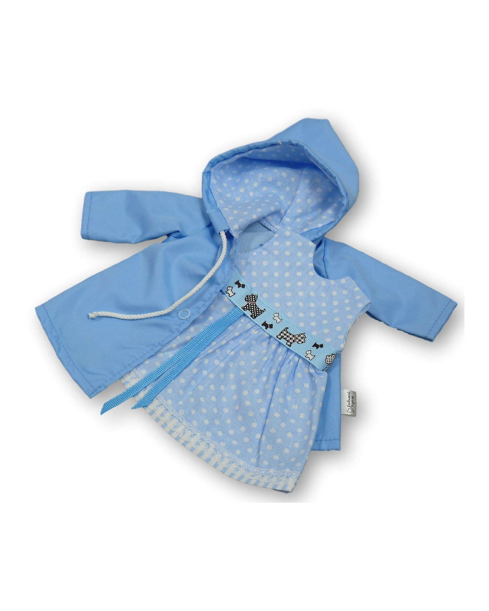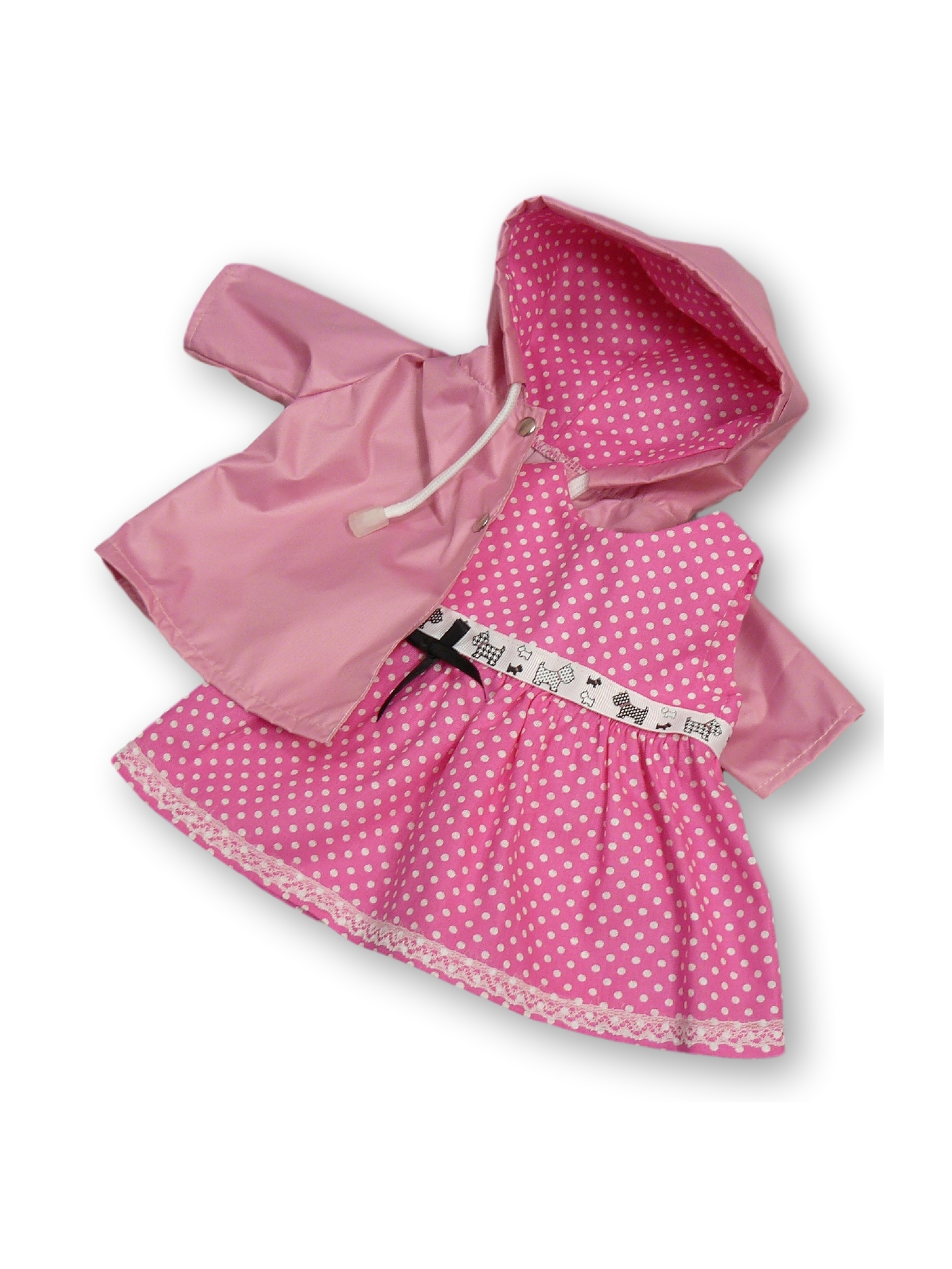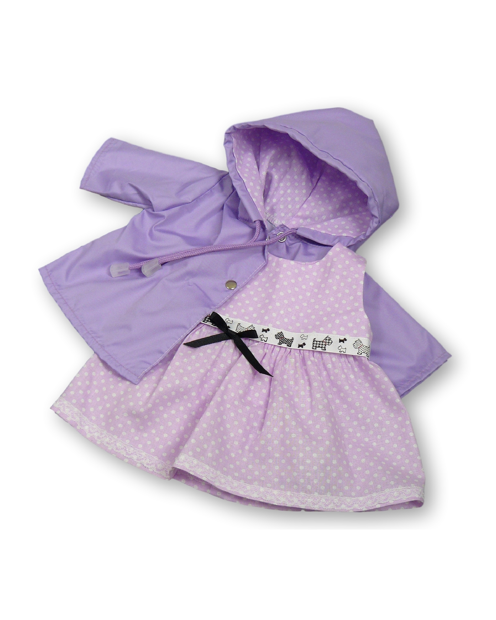 Плащ расклешонного силуэта из водоотталкивающей ткани. Глубокий капюшон продублирован х/б подкладочной тканью. Шнур-утяжка позволяет регулировать его объем. Застегивается плащ на две кнопки. Платье без рукавов на кокетке выполнено из х/б ткани. кокетка выворотная, что обеспечивает аккуратность линии пройм и горловины. Присборенная юбка придает платью легкость и объем. Пояс украшен нарядной тесьмой с рисунком. В отделке использованы ткань-компаньон, кружево и репсовая лента. Застежка сзади - лента велкро.