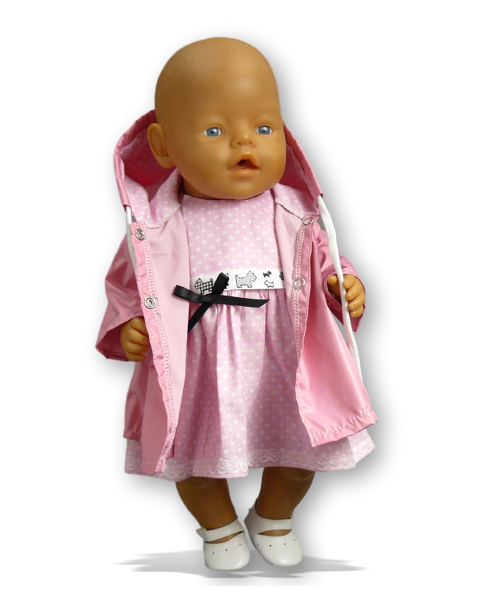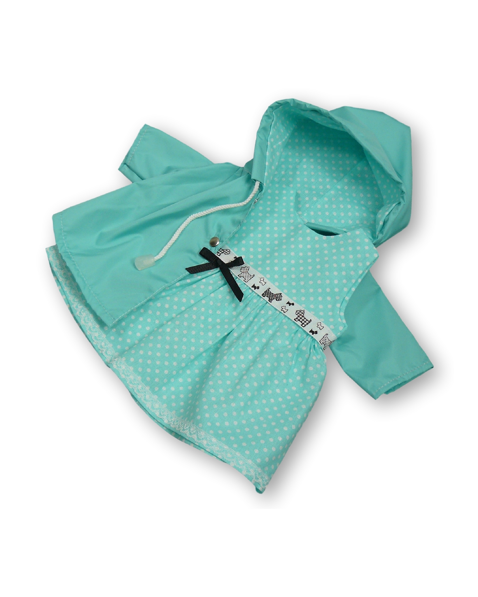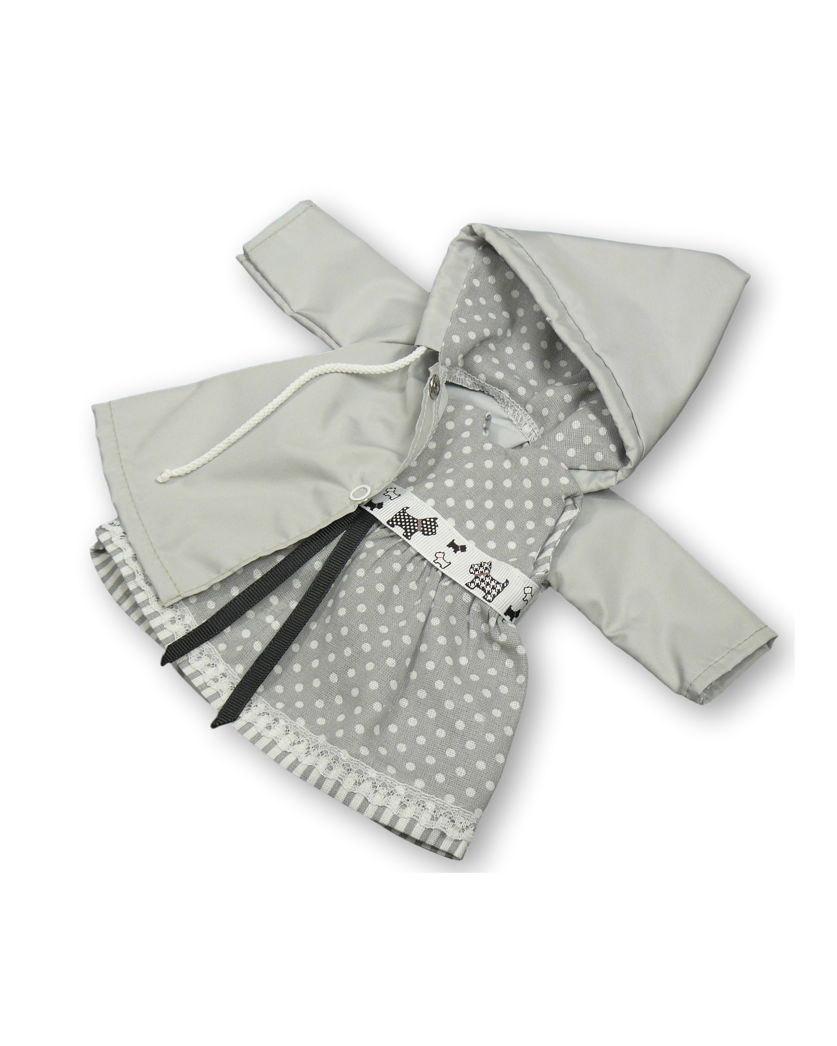 Плащ расклешонного силуэта из водоотталкивающей ткани. Глубокий капюшон продублирован х/б подкладочной тканью. Шнур-утяжка позволяет регулировать его объем. Застегивается плащ на две кнопки. Платье без рукавов на кокетке выполнено из х/б ткани. кокетка выворотная, что обеспечивает аккуратность линии пройм и горловины. Присборенная юбка придает платью легкость и объем. Пояс украшен нарядной тесьмой с рисунком. В отделке использованы ткань-компаньон, кружево и репсовая лента. Застежка сзади - лента велкро.