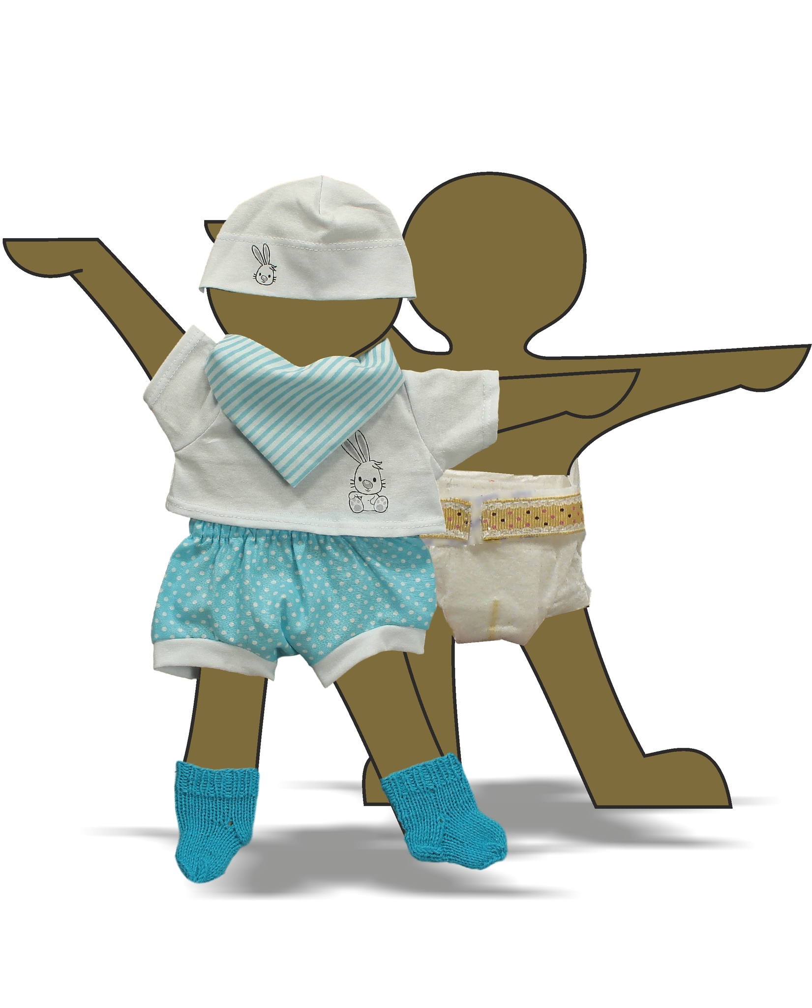 Футболка их х/б трикотажного польтна. Застежка - липучка сзади. Шапка с глубокой посадкой. Футблка и шапка украшены термоаппликацией. Трусы с трикотажной обтачкой специально разработаны для комфортного надевания на подгузник. Настоящий подгузник доработан - усилен декоративной тесьмой и дополнительной липучкой для мнгократного использования. В комплекте носки ручной вязки из акриловой пряжи. Дополняет комплект для малышей двухсторонний нагрудник - косынка, застегивающийся на липучку.
