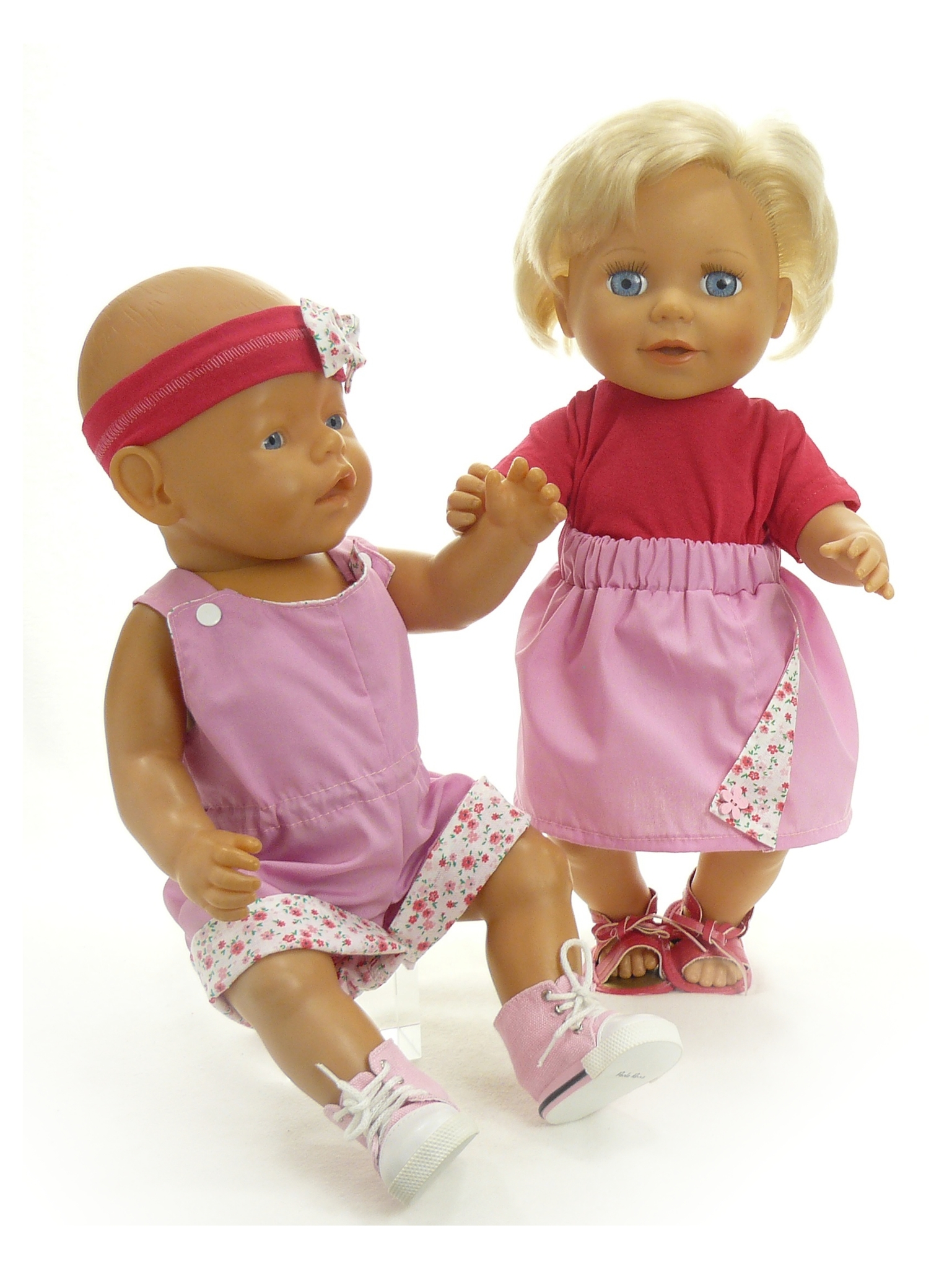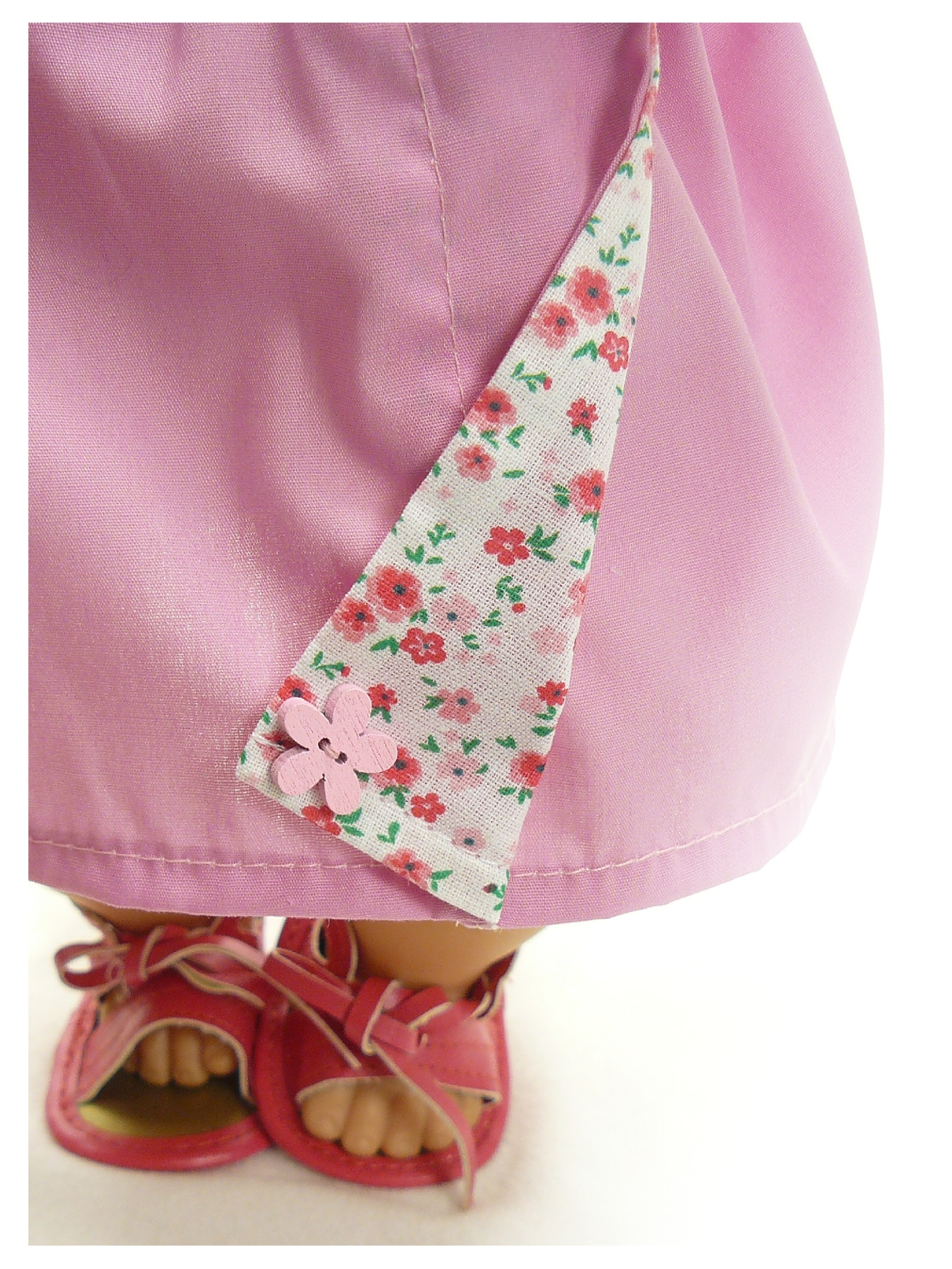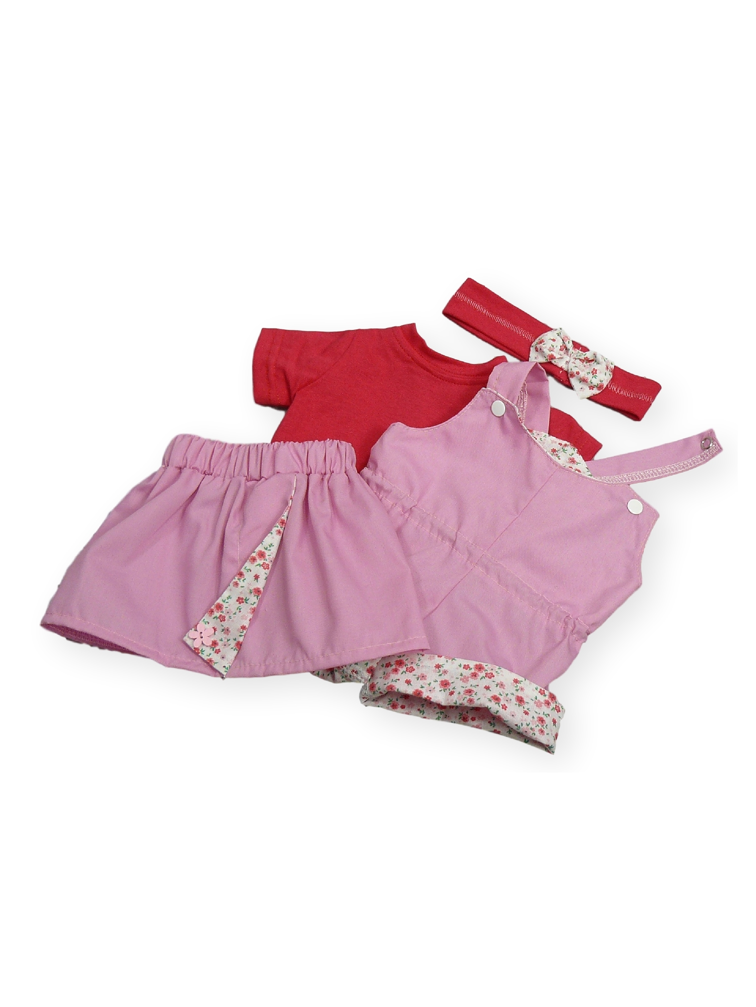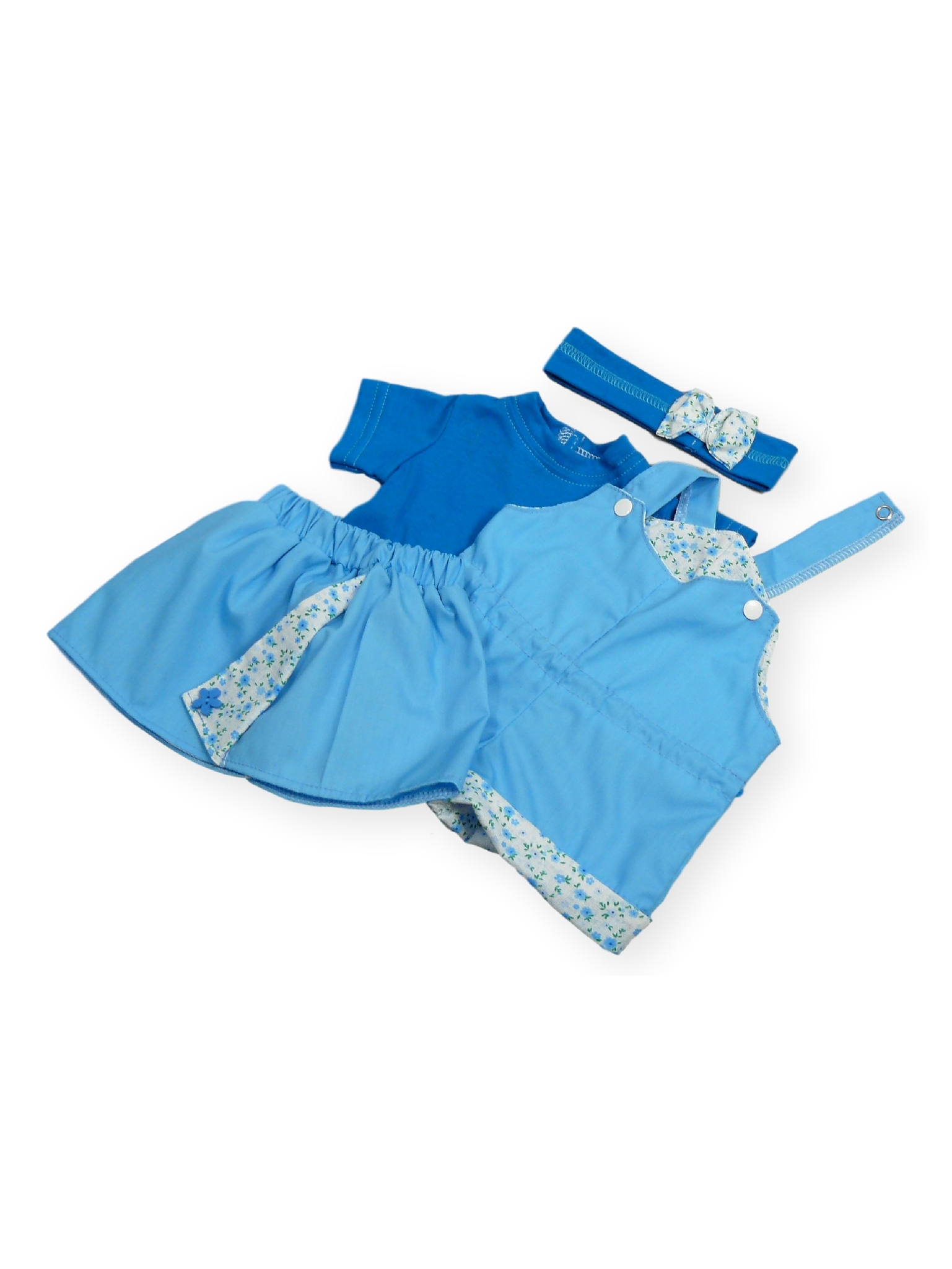 Комплект состоит из четырех предметов: полукомбинезон, юбка, футболка и полоска на голову. Полукомбинезон изготовлен из легкой ткани "тиси". Верхняя часть продублирована подкладкой с ярким рисунком. Из нее же сделаны декоративные подкройные элементы. Для удобства эксплуатации используются застежки - кнопки на лямках и шнур-утяжка по линии талии. Юбка также скомбинирована из двух видов ткани. Полотно юбки собрано на густую сборку, что создаёт дополнительный объём. Футболка изготовлена из хлопчатобумажного трикотажного полотна. Для удобства одевания футболка снабжена застежкой на спинке из контактной ленты "велкро" ("липучка"). Головной убор - полоска на голову изготовлена из трикотажного полотна и украшена изящным бантиком.