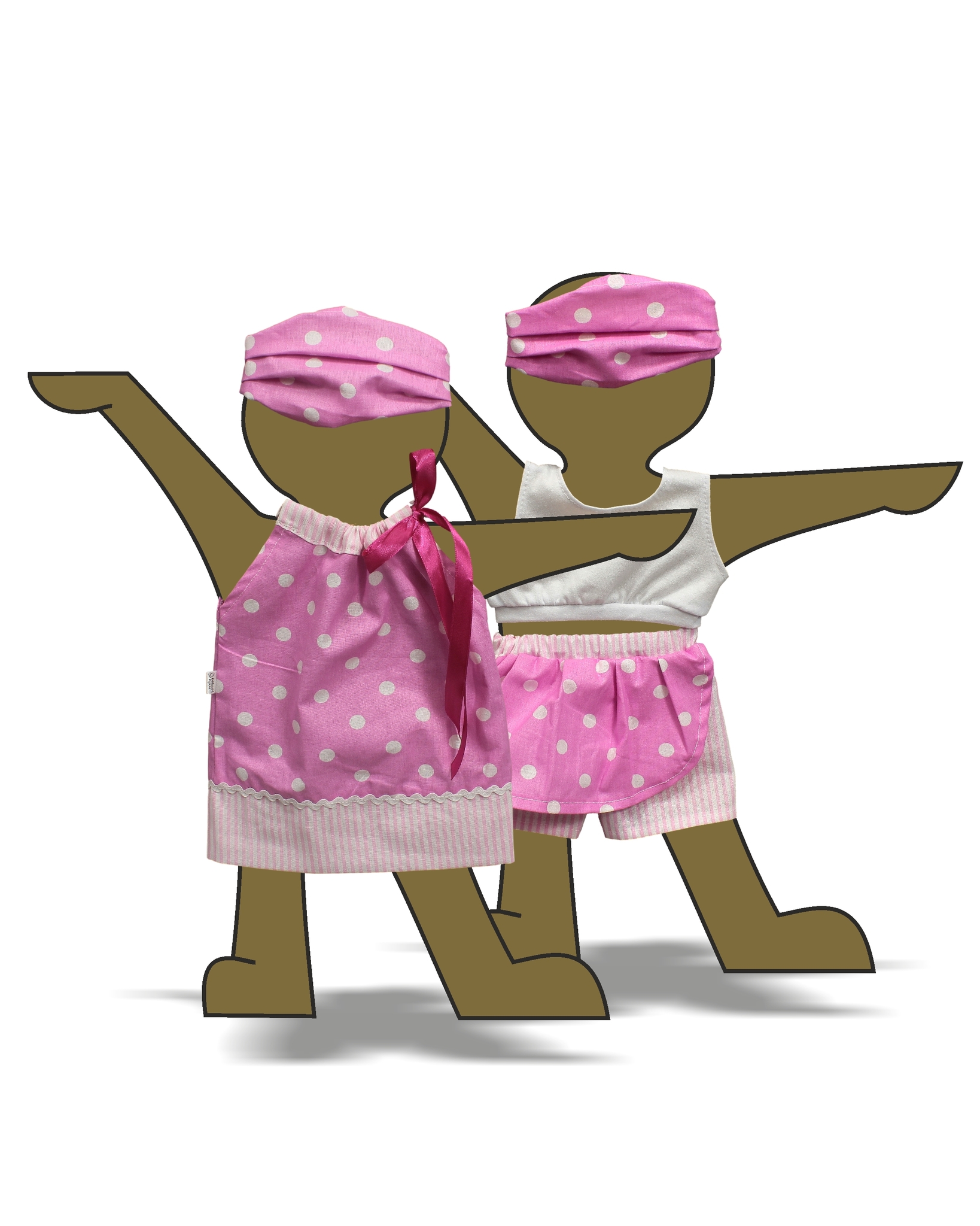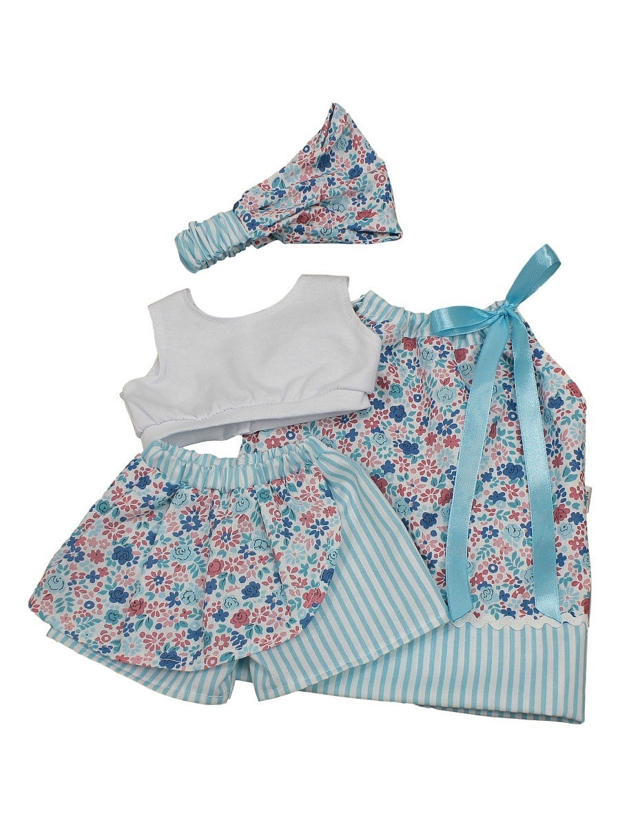 Комплект состоит из четырех предметов: сарафан, майка, юбка-шорты и бандана на резинке.