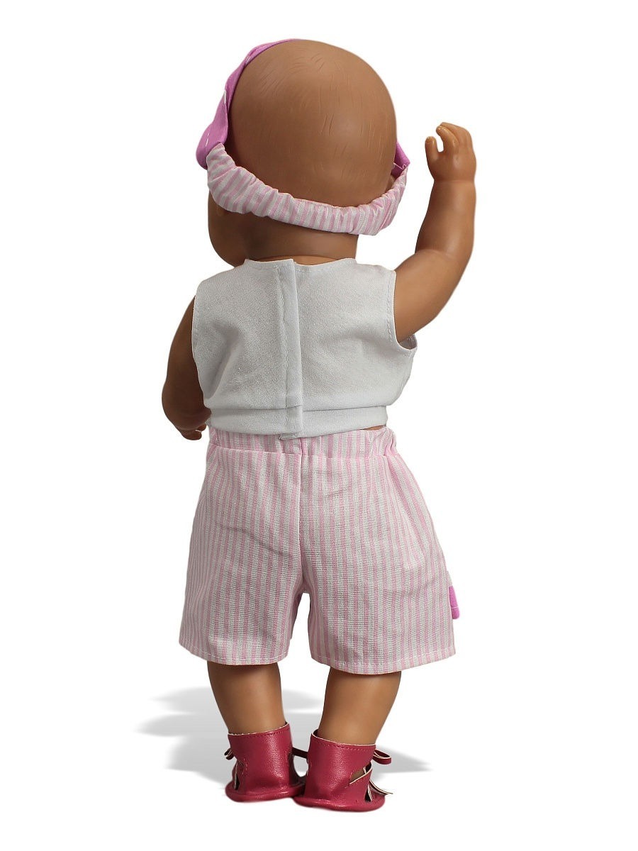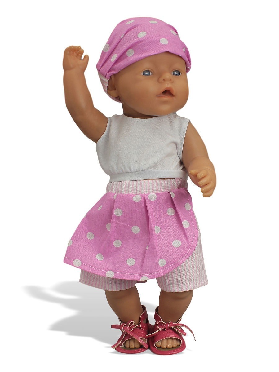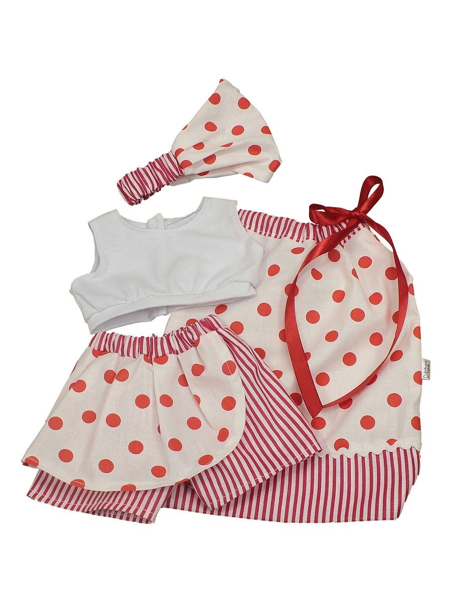 Сарафан изготовлен из высококачественной х/б ткани. Яркий рисунок отделки прекрасно сочетается с основой. Простота фасона позволяет использовать этот сарафан для широкого ряда кукол. Лента-утяжка по линии горловины корректирует посадку на любую куклу. На майке застежка на спинке из контактной ленты велкро ("липучка"), что обеспечивает свободное одевание. Юбка-шорты изготовлены из х/б тканей компальонов. Бандана на резинке сзади будет хорошим дополнением к комплекту.