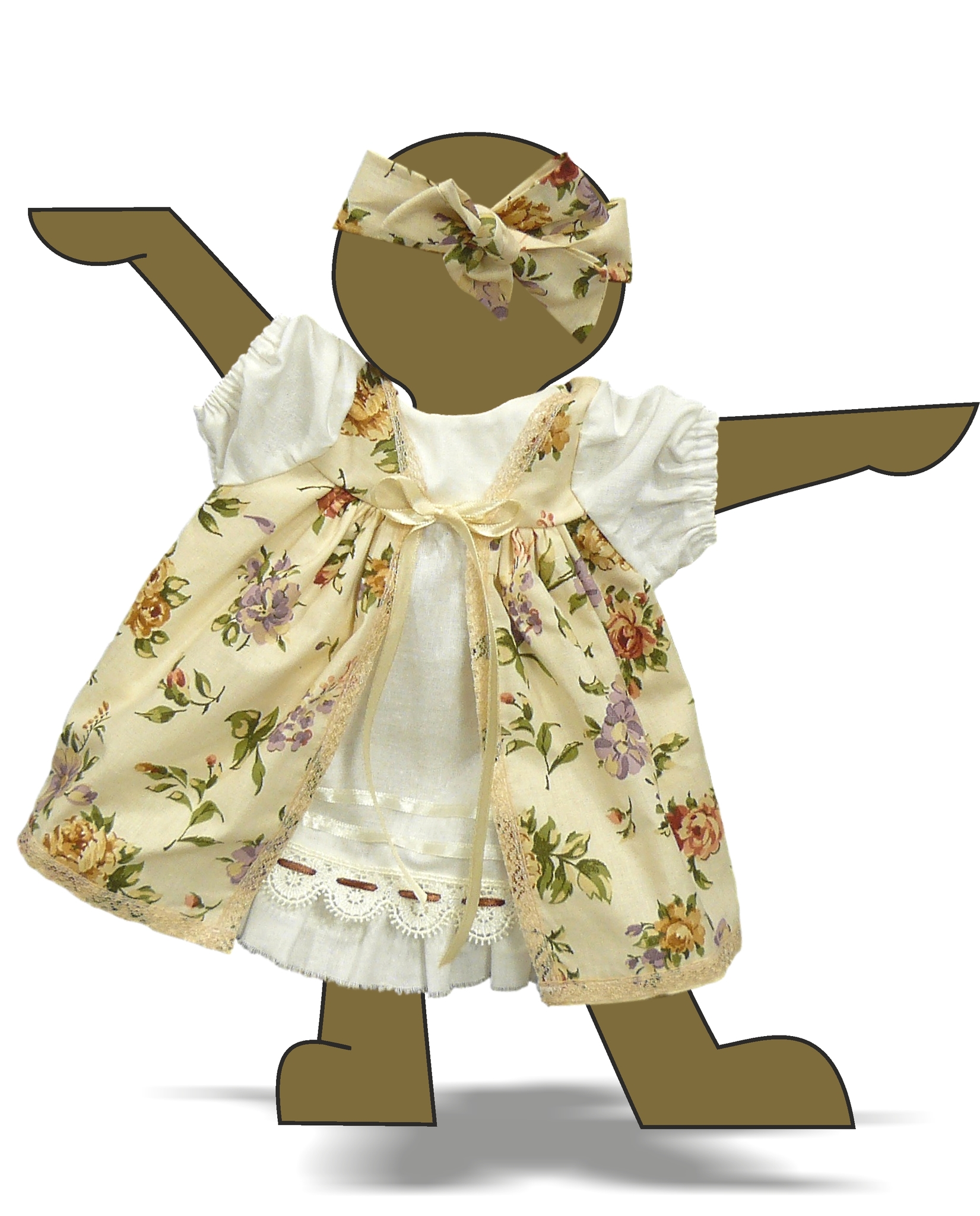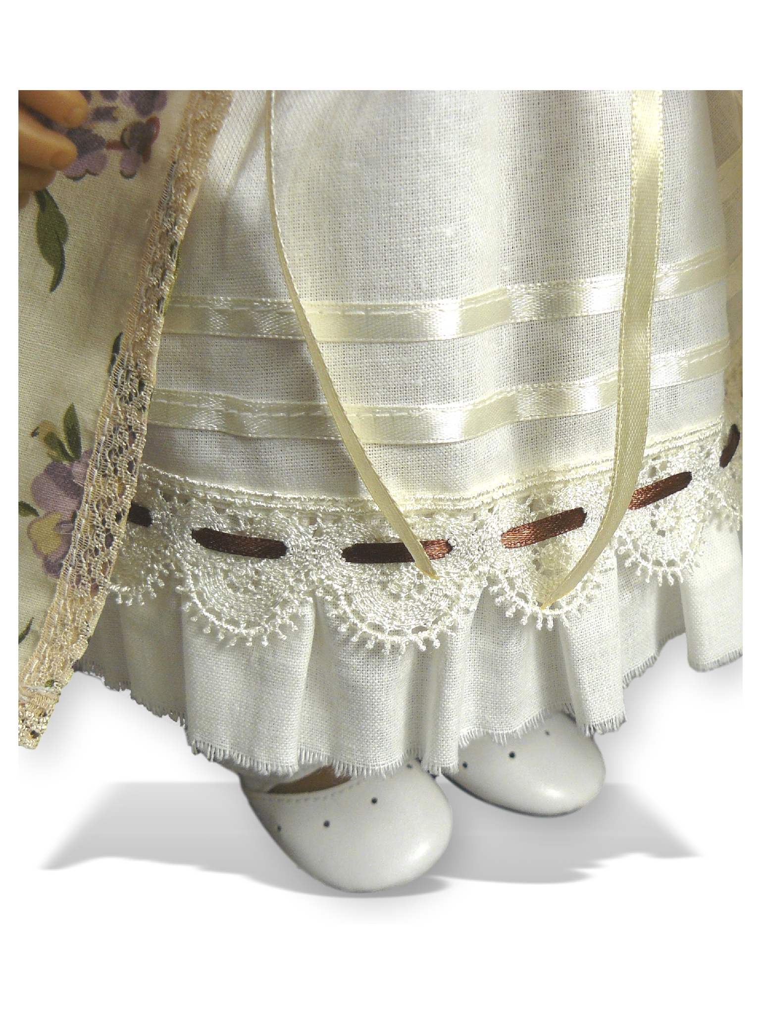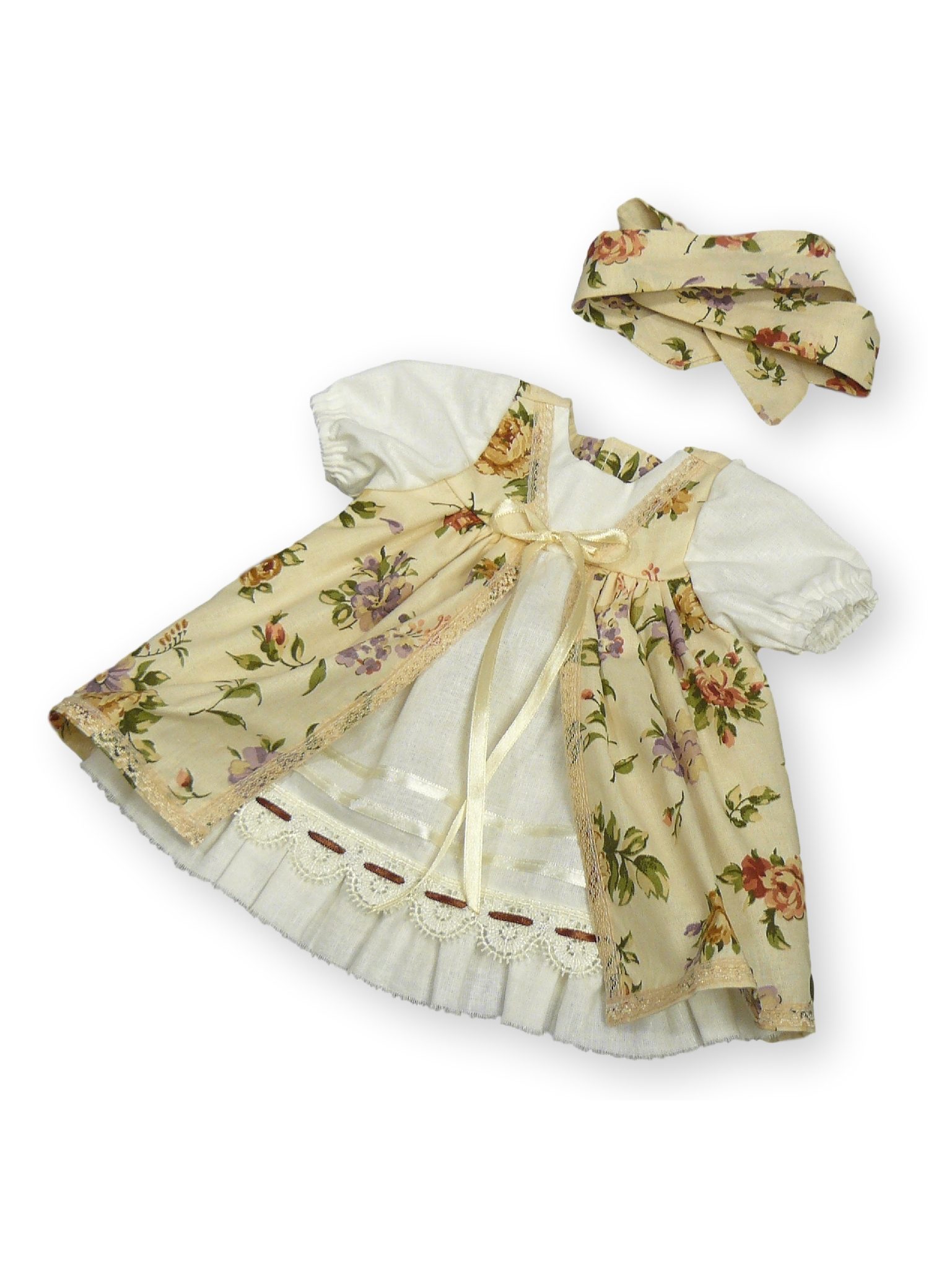 Платье скомбинировано из двух видов хлопчатобумажных тканей. Конструкция изделия имитирует двойное платье: верхнее и нижнее. Верхнее пплатье выполнено из набивной перкали. Нижнее - из нежной хлопчатобумажной ткани сливочного оттенка. украшено оборкой, вязаным кружевом и шелковыми лентами. Дополняет весь образ выворотная полоска на голову, которую можно завязать разными способами.